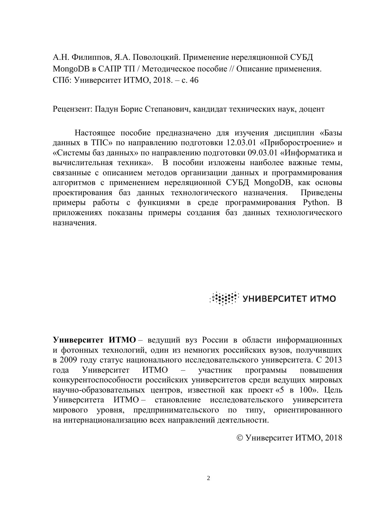 Настоящее пособие предназначено для изучения дисциплин «Базы данных в ТПС» по направлению подготовки 12.03.01 «Приборостроение» и «Системы баз данных» по направлению подготовки 09.03.01 «Информатика и вычислительная техника». В пособии изложены наиболее важные темы, связанные с описанием методов организации данных и программирования алгоритмов с применением нереляционной СУБД MongoDB, как основы проектирования баз данных технологического назначения. Приведены примеры работы с функциями в среде программирования Python. В приложениях показаны примеры создания баз данных технологического назначения.