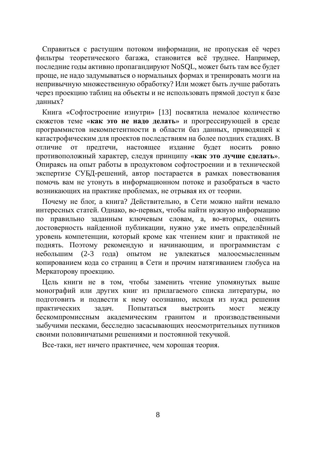 Книга охватывает различные этапы разработки и сопутствующие им ситуации из практики программистов приложений, работающих с системами управления базами данных. Даются рекомендации по выбору решений как в проектировании (архитектуре), так и в программировании автоматизированных информационных систем уровня предприятия. Приводятся примеры для различных СУБД и моделей: Microsoft SQL Server, PostgreSQL, Firebird, Oracle, XML, NoSQL. Для программистов, студентов и других специалистов в области информационных технологий, а также всех интересующихся темой разработки приложений баз данных.