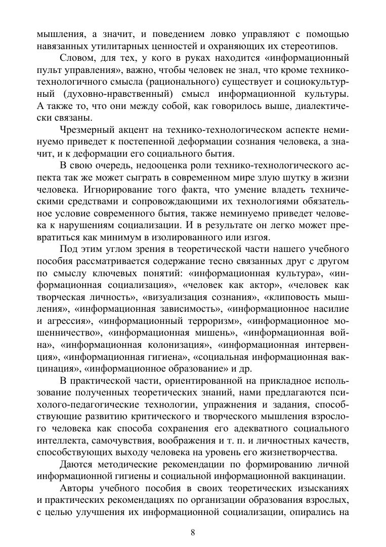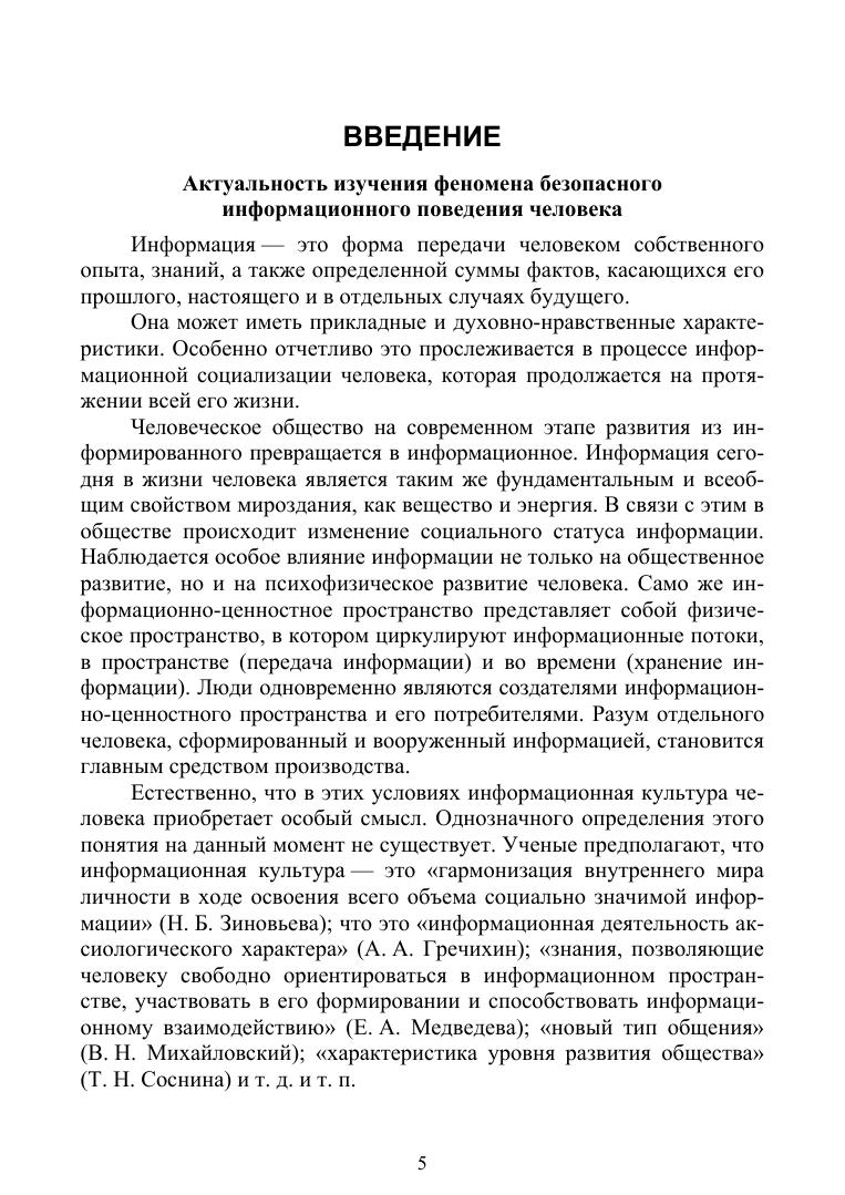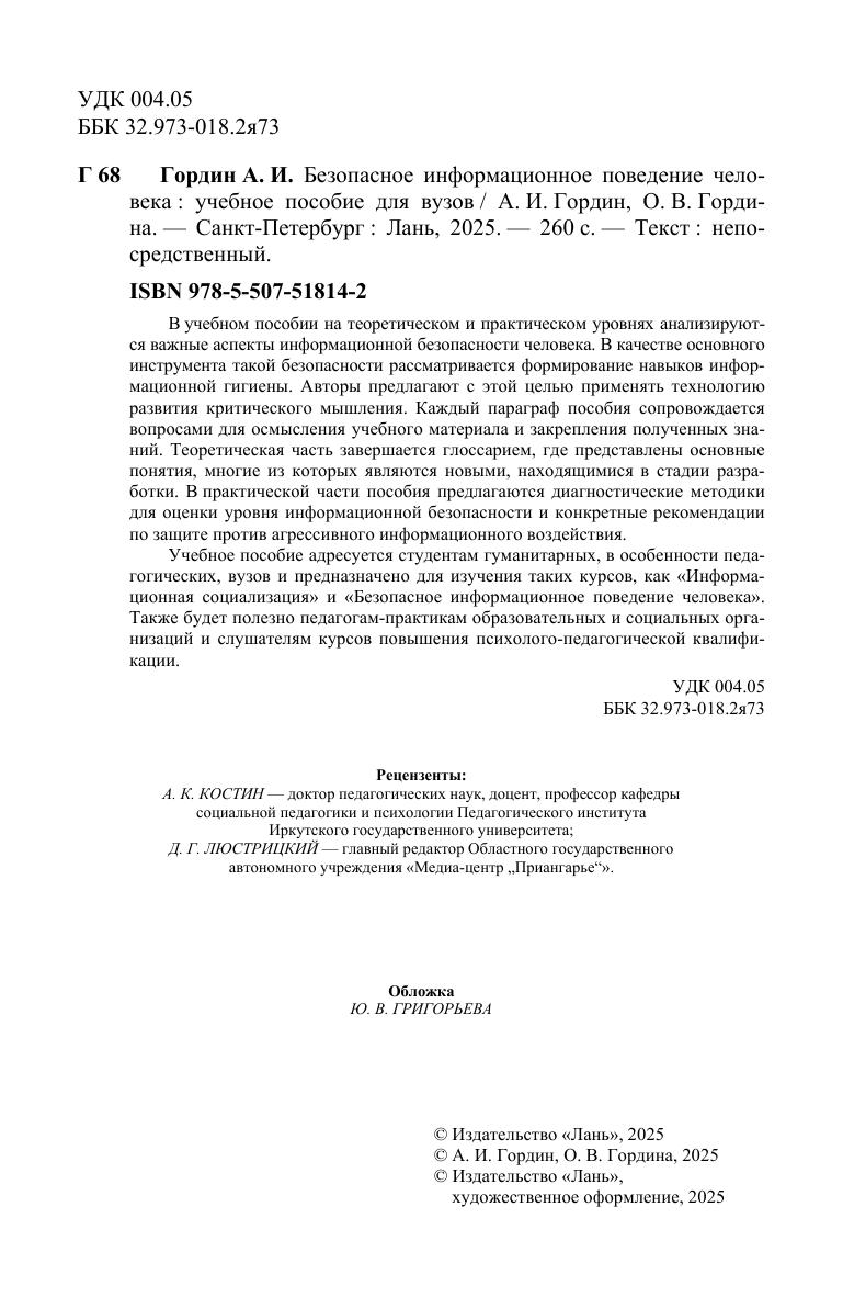 В учебном пособии на теоретическом и практическом уровнях анализируются важные аспекты информационной безопасности человека. В качестве основного инструмента такой безопасности рассматривается формирование навыков информационной гигиены. Авторы предлагают с этой целью применять технологию развития критического мышления. Каждый параграф пособия сопровождается вопросами для осмысления учебного материала и закрепления полученных знаний. Теоретическая часть завершается глоссарием, где представлены основные понятия, многие из которых являются новыми, находящимися в стадии разработки. В практической части пособия предлагаются диагностические методики для оценки уровня информационной безопасности и конкретные рекомендации по защите против агрессивного информационного воздействия. Учебное пособие адресуется студентам гуманитарных, в особенности педагогических, вузов и предназначено для изучения таких курсов, как «Информационная социализация» и «Безопасное информационное поведение человека». Также будет полезно педагогам-практикам образовательных и социальных организаций и слушателям курсов повышения психолого-педагогической квалификации.