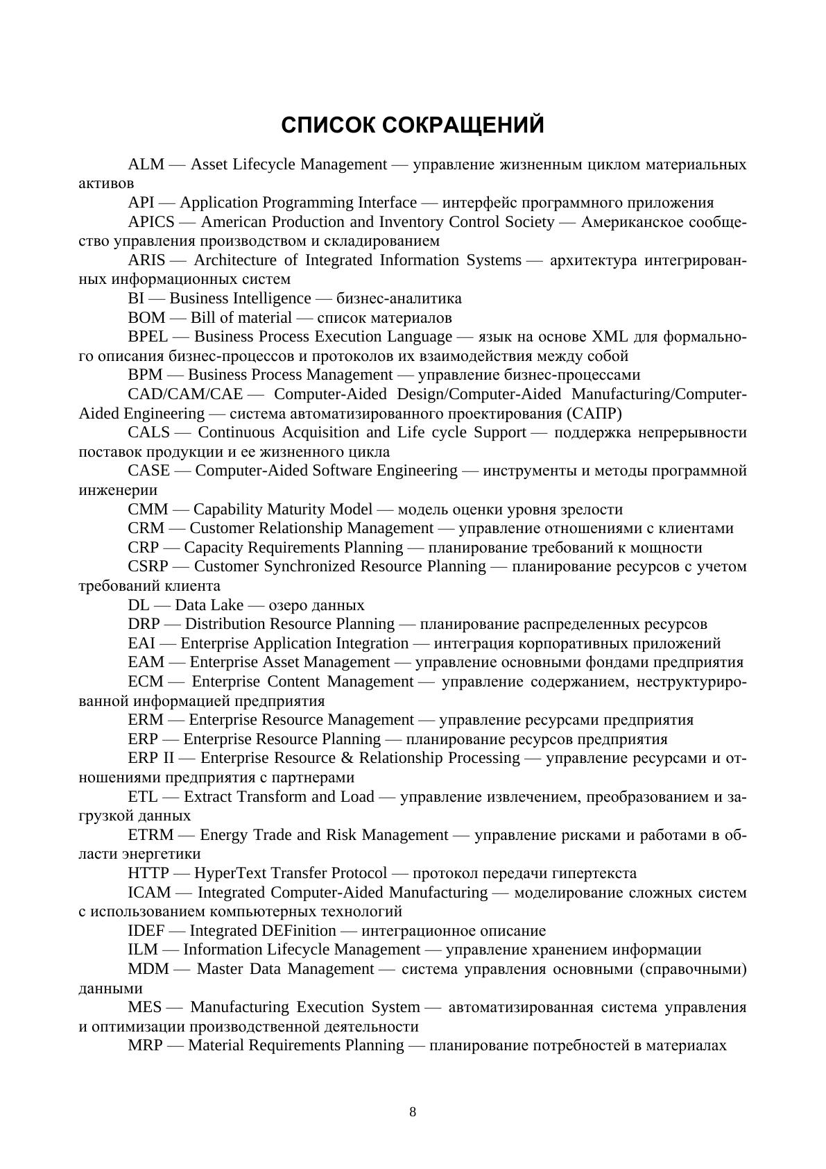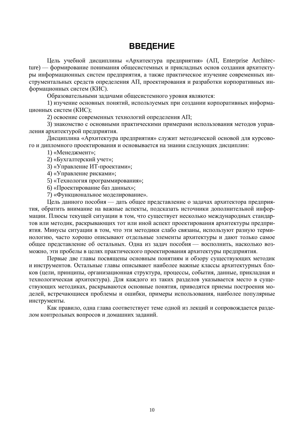 Учебное пособие содержит тезисы лекций и контрольные вопросы по курсу «Архитектура предприятия». Описаны основные разделы архитектуры предприятия, средства, приемы и примеры их проектирования с учетом существующих международных стандартов и методик. При составлении пособия использовался опыт преподавания курсов «Архитектура предприятия» и «Корпоративные информационные системы» в МИФИ, а также опыт практического использования приемов управления архитектурой крупного предприятия.