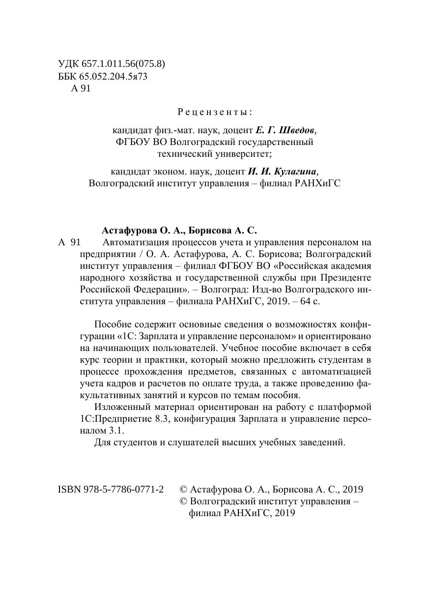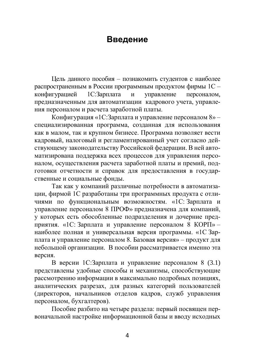Пособие содержит основные сведения о возможностях конфи-гурации «1С: Зарплата и управление персоналом» и ориентировано на начинающих пользователей. Учебное пособие включает в себя курс теории и практики, который можно предложить студентам в процессе прохождения предметов, связанных с автоматизацией учета кадров и расчетов по оплате труда, а также проведению фа-культативных занятий и курсов по темам пособия. Изложенный материал ориентирован на работу с платформой 1С:Предприетие 8.3, конфигурация Зарплата и управление персо-налом 3.1. Для студентов и слушателей высших учебных заведений.