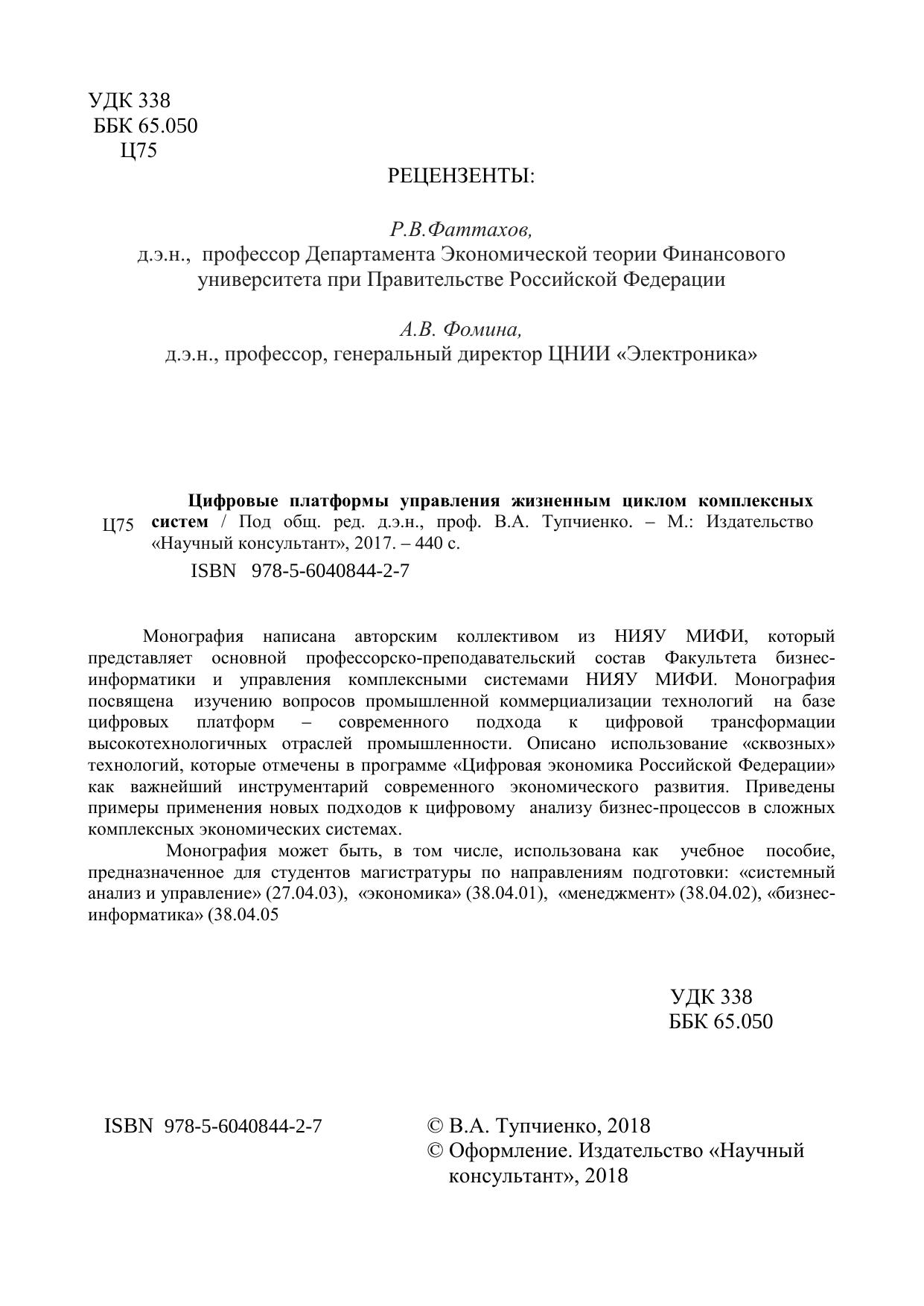 Монография написана авторским коллективом из НИЯУ МИФИ, который представляет основной профессорско-преподавательский состав Факультета бизнес-информатики и управления комплексными системами НИЯУ МИФИ. Монография посвящена изучению вопросов промышленной коммерциализации технологий на базе цифровых платформ – современного подхода к цифровой трансформации высокотехнологичных отраслей промышленности. Описано использование «сквозных» технологий, которые отмечены в программе «Цифровая экономика Российской Федерации» как важнейший инструментарий современного экономического развития. Приведены примеры применения новых подходов к цифровому анализу бизнес-процессов в сложных комплексных экономических системах. Монография может быть, в том числе, использована как учебное пособие, предназначенное для студентов магистратуры по направлениям подготовки: «системный анализ и управление» (27.04.03), «экономика» (38.04.01), «менеджмент» (38.04.02), «бизнес-информатика» (38.04.05)