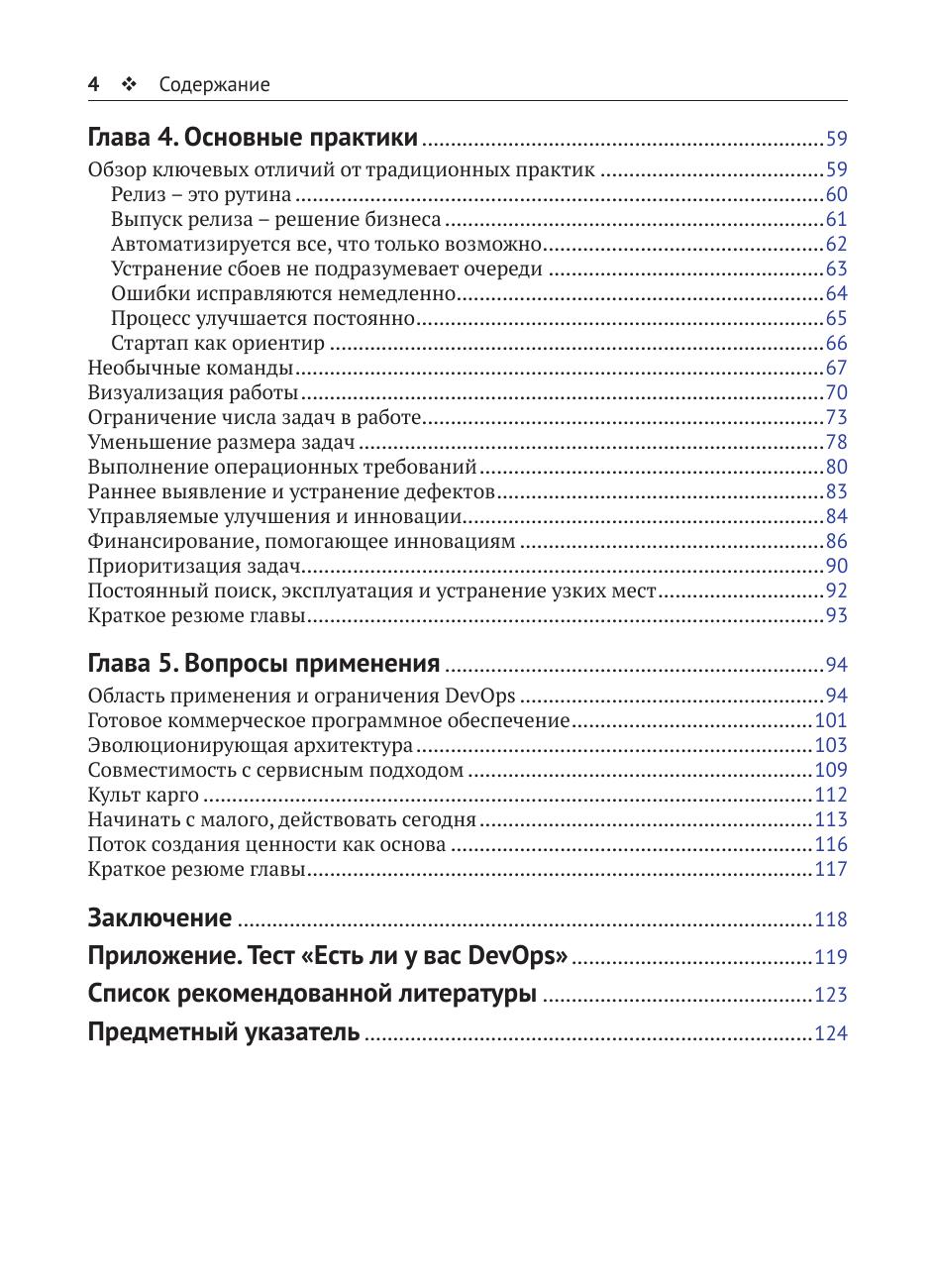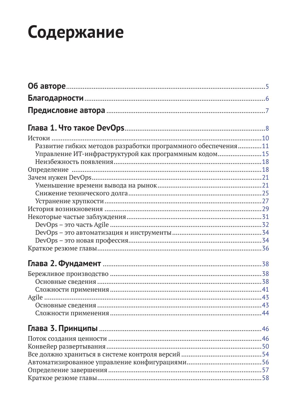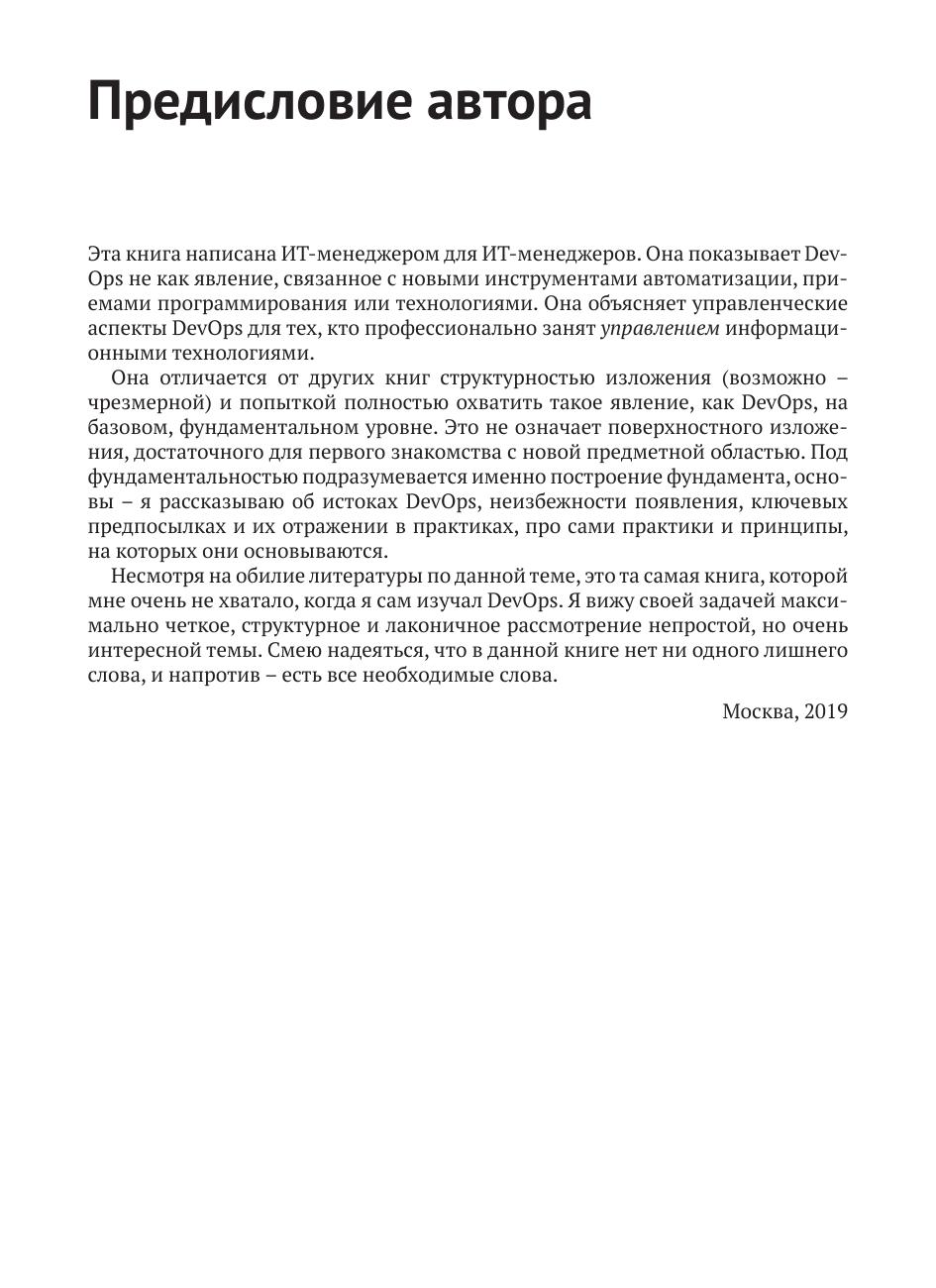 В книге четко и последовательно изложены ключевые понятия, принципы и практики DevOps, дано определение DevOps и его место относительно других методологий управления ИТ, включая Agile. Эта книга не про автоматизацию, она акцентирована на разъяснение сути DevOps, построение команды и управление ИТ, без привязки к конкретным технологиям и инструментам. Книга не носит развлекательный характер, не является пособием «как делать DevOps», скорее, это настольный справочник для тех, кто хочет применять DevOps вдумчиво и со смыслом, со знанием дела оперируя понятиями и терминами. Благодаря тому что число технических терминов в книге сведено к минимуму, она отлично подойдет для чтения как специалистам в области информационных технологий, так и руководителям бизнес-подразделений и владельцам компаний.