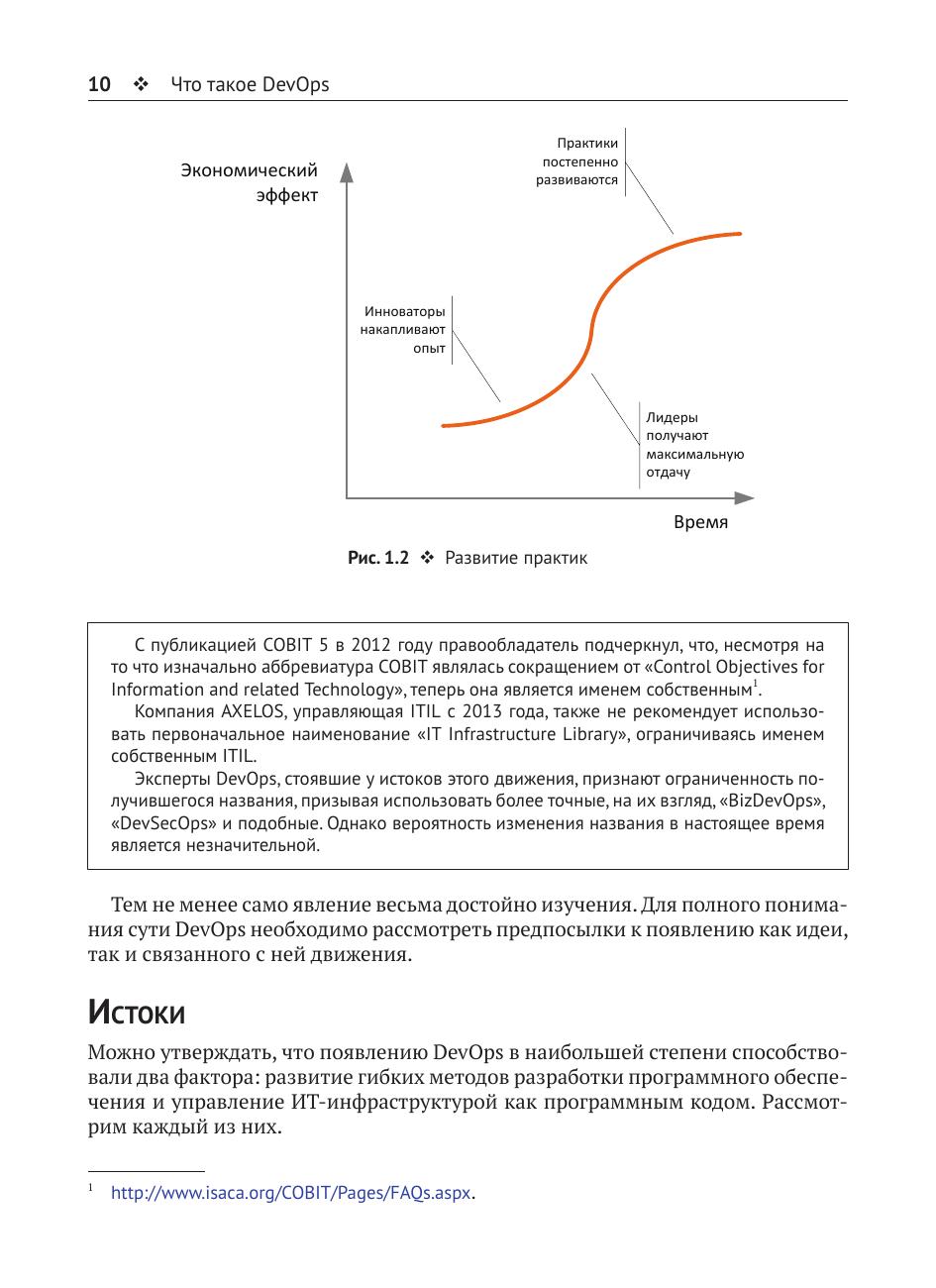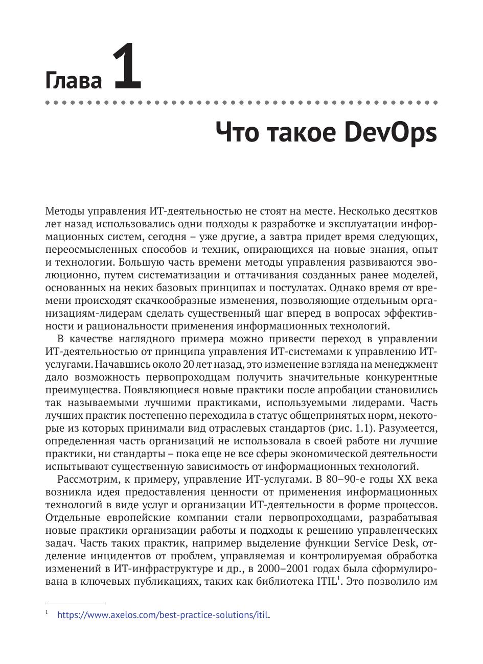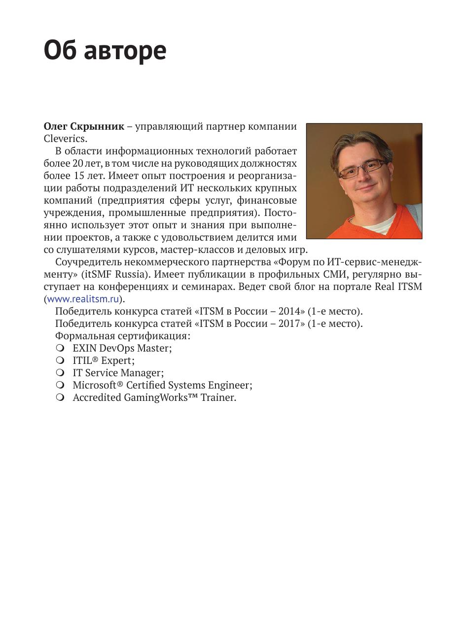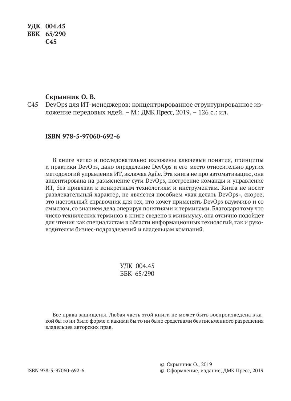 В книге четко и последовательно изложены ключевые понятия, принципы и практики DevOps, дано определение DevOps и его место относительно других методологий управления ИТ, включая Agile. Эта книга не про автоматизацию, она акцентирована на разъяснение сути DevOps, построение команды и управление ИТ, без привязки к конкретным технологиям и инструментам. Книга не носит развлекательный характер, не является пособием «как делать DevOps», скорее, это настольный справочник для тех, кто хочет применять DevOps вдумчиво и со смыслом, со знанием дела оперируя понятиями и терминами. Благодаря тому что число технических терминов в книге сведено к минимуму, она отлично подойдет для чтения как специалистам в области информационных технологий, так и руководителям бизнес-подразделений и владельцам компаний.