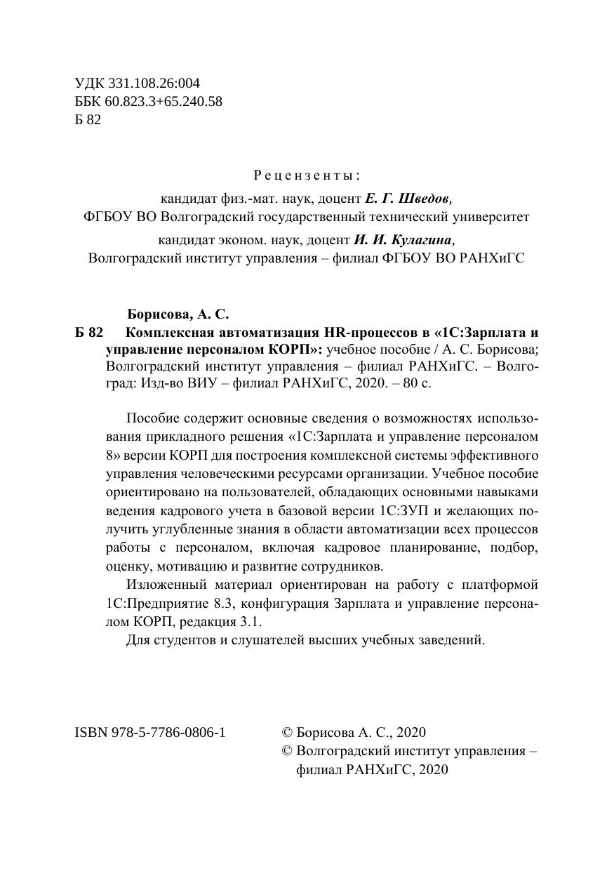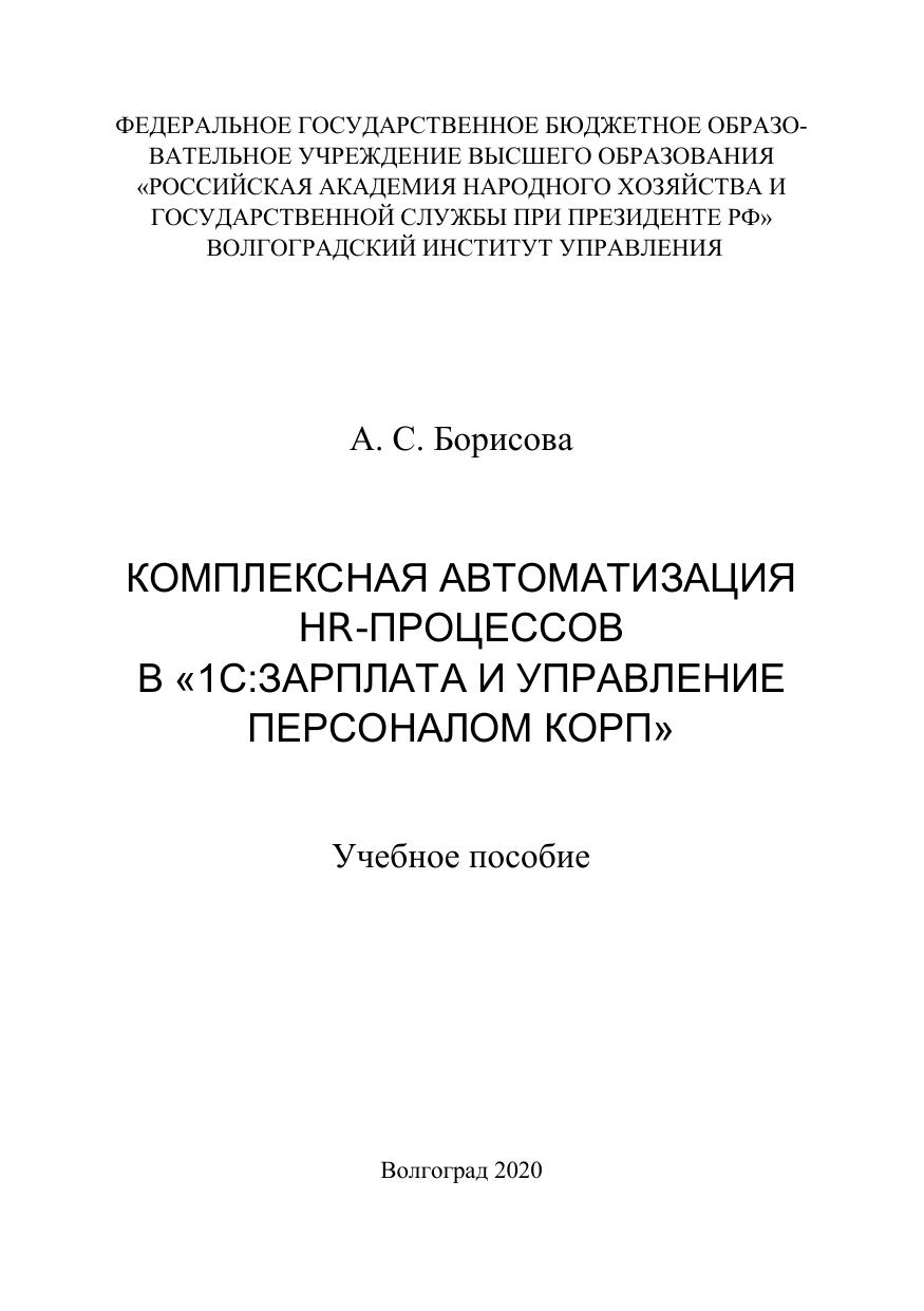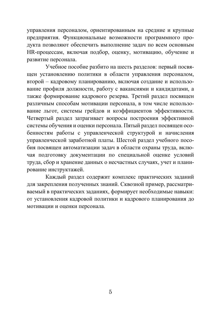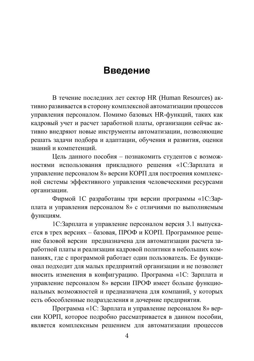 Пособие содержит основные сведения о возможностях использо-вания прикладного решения «1С:Зарплата и управление персоналом 8» версии КОРП для построения комплексной системы эффективного управления человеческими ресурсами организации. Учебное пособие ориентировано на пользователей, обладающих основными навыками ведения кадрового учета в базовой версии 1С:ЗУП и желающих по-лучить углубленные знания в области автоматизации всех процессов работы с персоналом, включая кадровое планирование, подбор, оценку, мотивацию и развитие сотрудников. Изложенный материал ориентирован на работу с платформой 1С:Предприятие 8.3, конфигурация Зарплата и управление персона-лом КОРП, редакция 3.1. Для студентов и слушателей высших учебных заведений.
