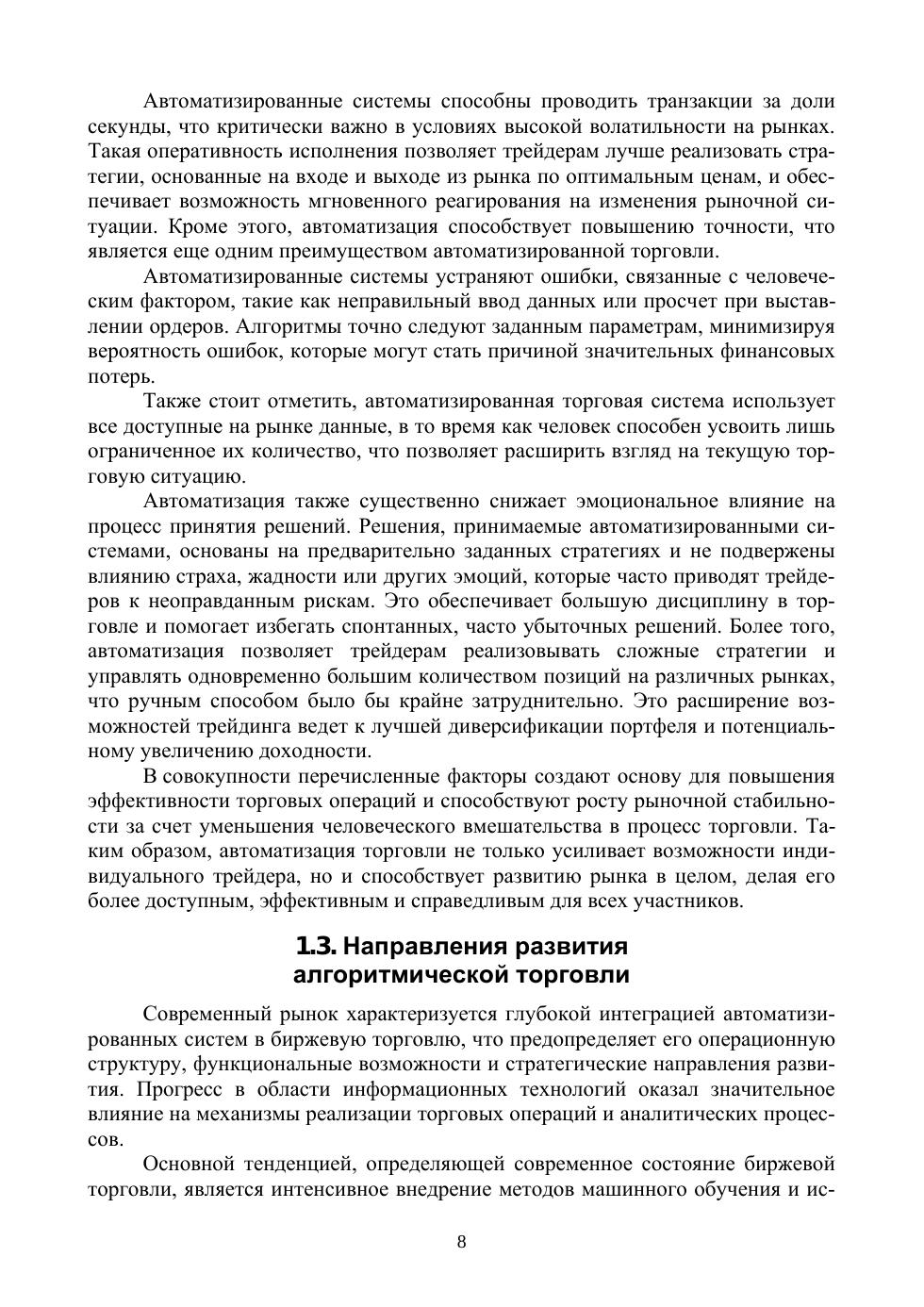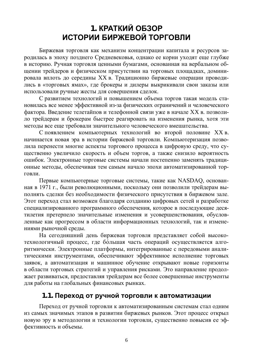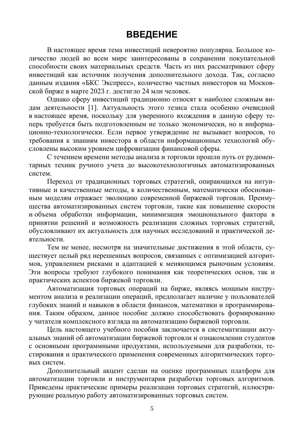 Настоящее учебное пособие содержит основные сведения о создании автоматизированных систем принятия решений для торговли на финансовых рынках. Представлена попытка систематизации актуальных знаний в области автоматизации биржевой торговли. Рассматриваются основные подходы, использующиеся для создания так называемых торговых роботов, и способы их программной реализации. Проводится сравнительный анализ существующих цифровых решений для разработки и тестирования торговых стратегий. В учебном пособии содержатся краткие теоретические сведения, приводятся примеры торговых стратегий и их реализации в виде компьютерных программ, а также примеры визуализации результатов тестирования разработанных алгоритмов на исторических данных. Учебное пособие предназначено для студентов направлений «Информационные системы и технологии» и «Бизнес-информатика», а также для аспирантов и преподавателей, имеющих базовые знания в сфере финансов и инвестиций и обладающих навыками программирования. Соответствует Государственному образовательному стандарту и действующим программам. В учебном пособии последовательно вводится понятийный аппарат, формулируются основные объекты, приводятся примеры программ.