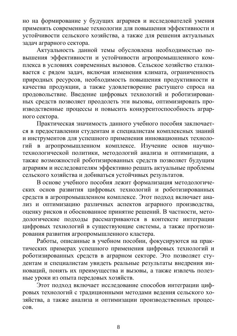 Целью данного учебного пособия является формирование основ научно-технологической политики, основанной на формализации методологических основ формирования, оптимизации и прогноза развития комплексов, систем и парков машин агропромышленного кластера. В первой главе описывается введение в цифровые технологии в агропромышленном комплексе, рассматриваются исторические аспекты. Во второй главе исследуется научно-технологическая политика в агропромышленном комплексе, включая понятие и цели политики. В третьей главе рассмотрены методологические основы развития цифровых технологий в агропромышленном комплексе, такие как методологии анализа и оптимизации. Четвертая глава посвящена роботизированным средствам в агропромышленном комплексе, описываются их виды и кейс-стадии. Учебное пособие предназначено для изучения средств и методов агроинженерии и пищевых технологий. Содержание учебного пособия соответствует шифру научной специальности «Технологии, машины и оборудование для агропромышленного комплекса», предоставляя исследователям значимые знания и методологические основы в этой области.