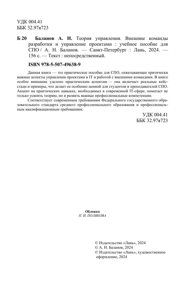 Данная книга — это практическое пособие для СПО, охватывающее критически важные аспекты управления проектами в IT и работой с внешними командами. В книге особое внимание уделено практическим аспектам — она включает реальные кейс-стади и примеры, что делает ее особенно ценной для студентов и преподавателей СПО. Акцент на практических навыках, необходимых в современной IT-сфере, помогает не только усвоить теорию, но и развить важные профессиональные компетенции. Соответствует современным требованиям Федерального государственного образовательного стандарта среднего профессионального образования и профессиональным квалификационным требованиям.