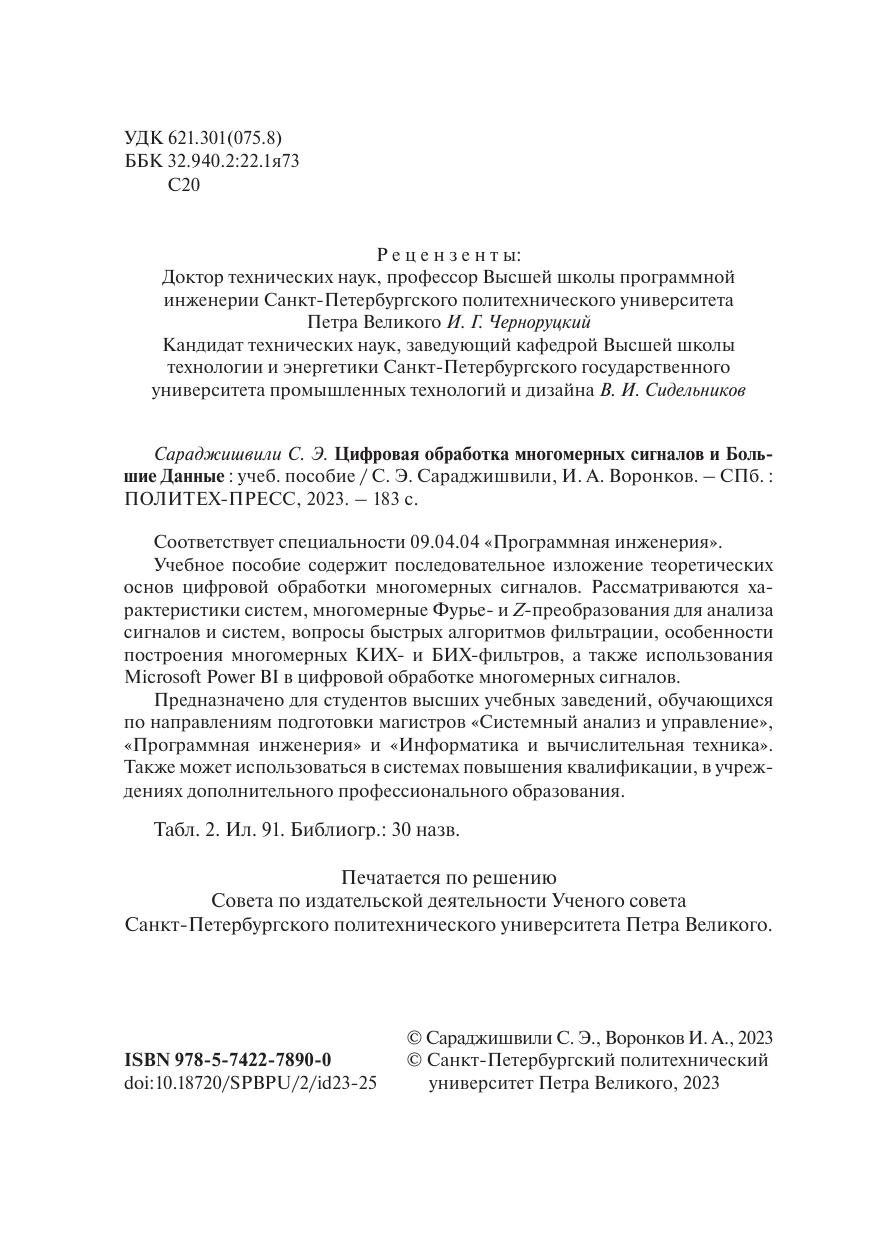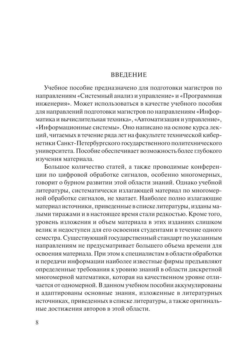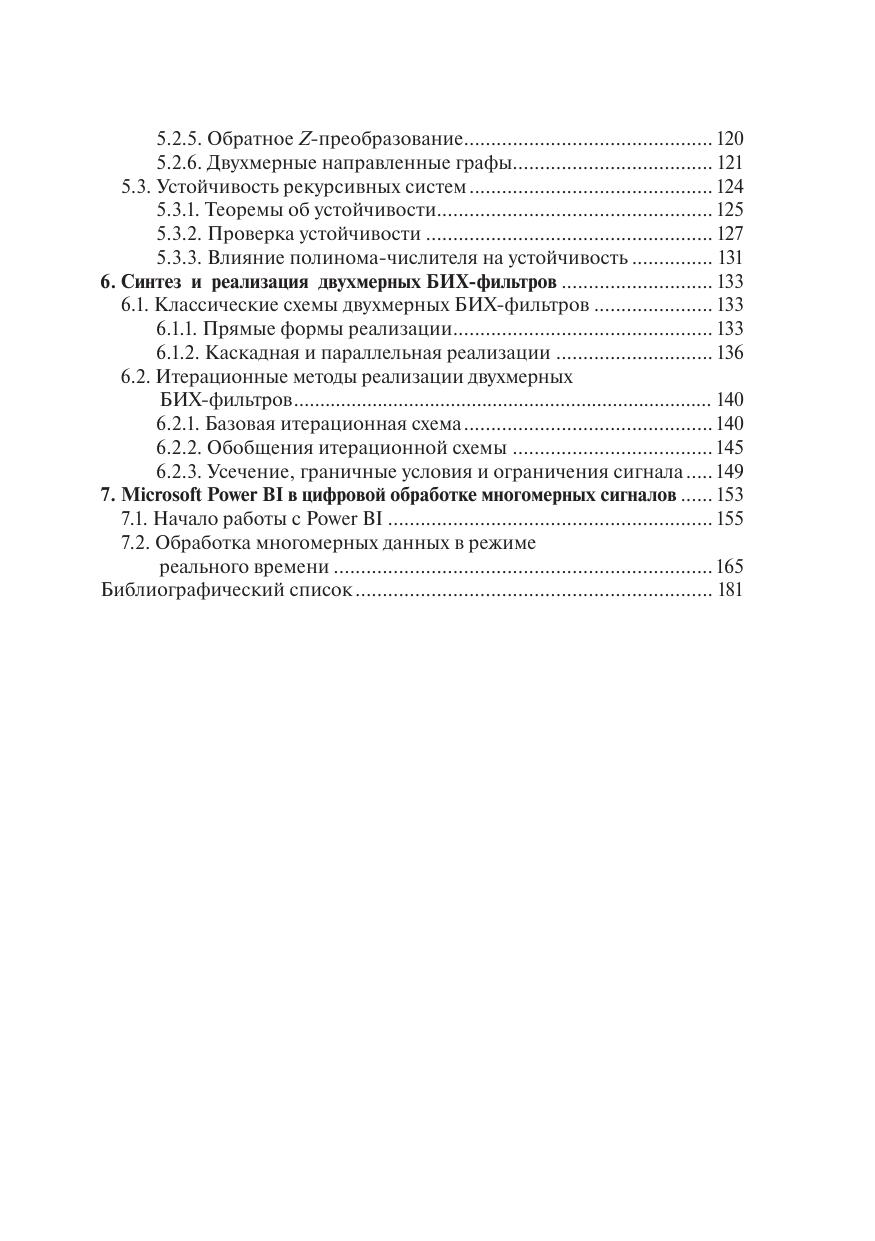 Соответствует специальности 09.04.04 «Программная инженерия». Учебное пособие содержит последовательное изложение теоретических основ цифровой обработки многомерных сигналов. Рассматриваются характеристики систем, многомерные Фурье- и Z-преобразования для анализа сигналов и систем, вопросы быстрых алгоритмов фильтрации, особенности построения многомерных КИХ- и БИХ-фильтров, а также использования Microsoft Power BI в цифровой обработке многомерных сигналов. Предназначено для студентов высших учебных заведений, обучающихся по направлениям подготовки магистров «Системный анализ и управление», «Программная инженерия» и «Информатика и вычислительная техника». Также может использоваться в системах повышения квалификации, в учреждениях дополнительного профессионального образования.