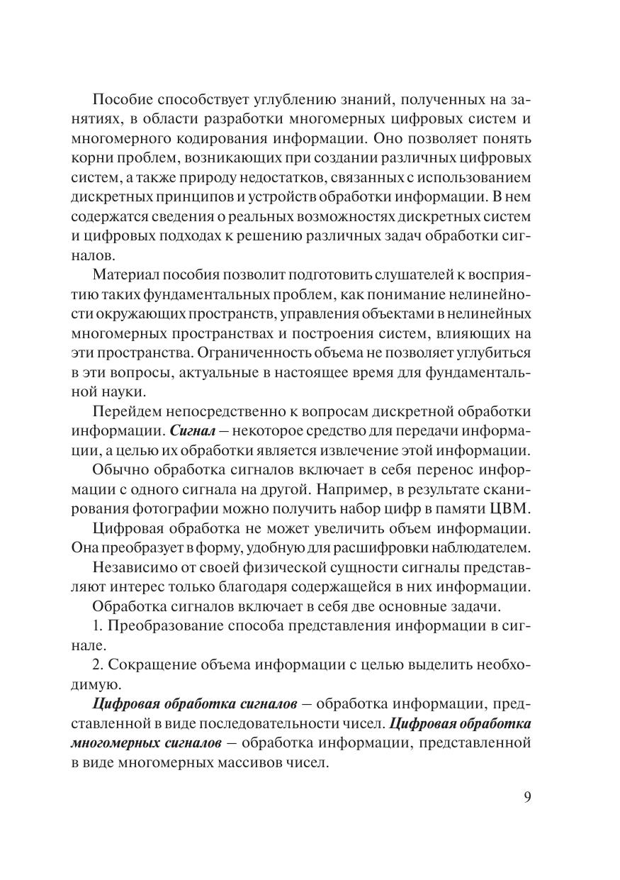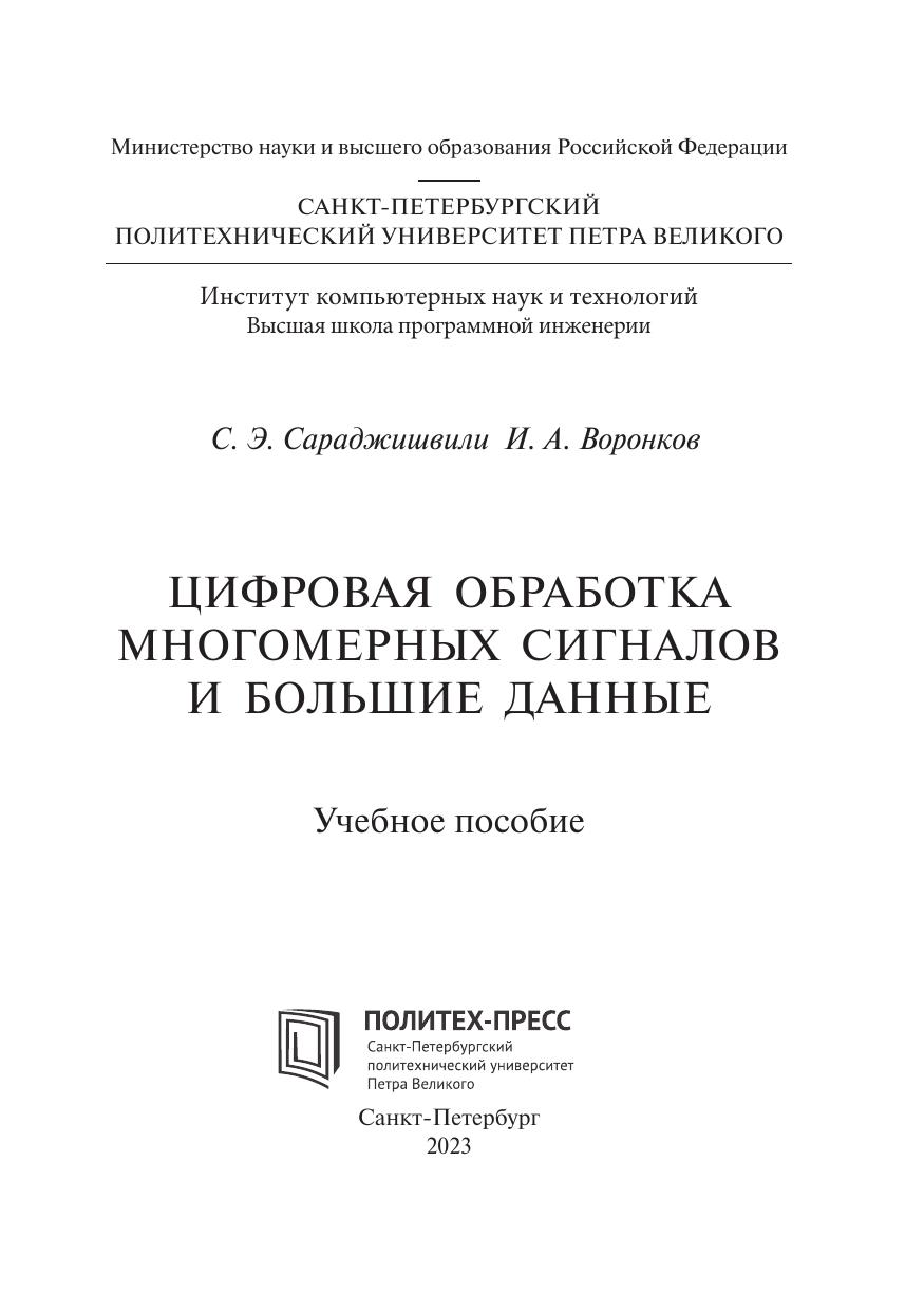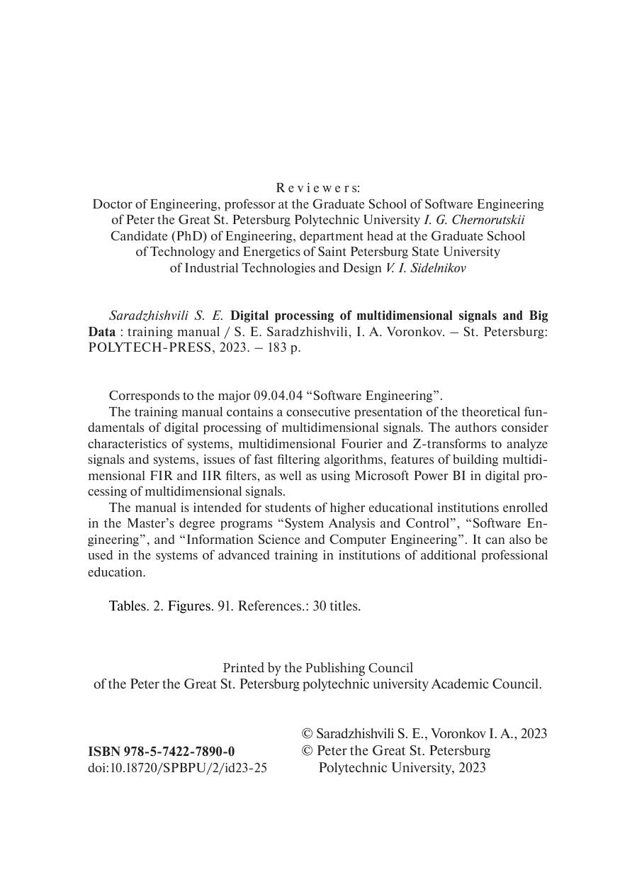 Соответствует специальности 09.04.04 «Программная инженерия». Учебное пособие содержит последовательное изложение теоретических основ цифровой обработки многомерных сигналов. Рассматриваются характеристики систем, многомерные Фурье- и Z-преобразования для анализа сигналов и систем, вопросы быстрых алгоритмов фильтрации, особенности построения многомерных КИХ- и БИХ-фильтров, а также использования Microsoft Power BI в цифровой обработке многомерных сигналов. Предназначено для студентов высших учебных заведений, обучающихся по направлениям подготовки магистров «Системный анализ и управление», «Программная инженерия» и «Информатика и вычислительная техника». Также может использоваться в системах повышения квалификации, в учреждениях дополнительного профессионального образования.