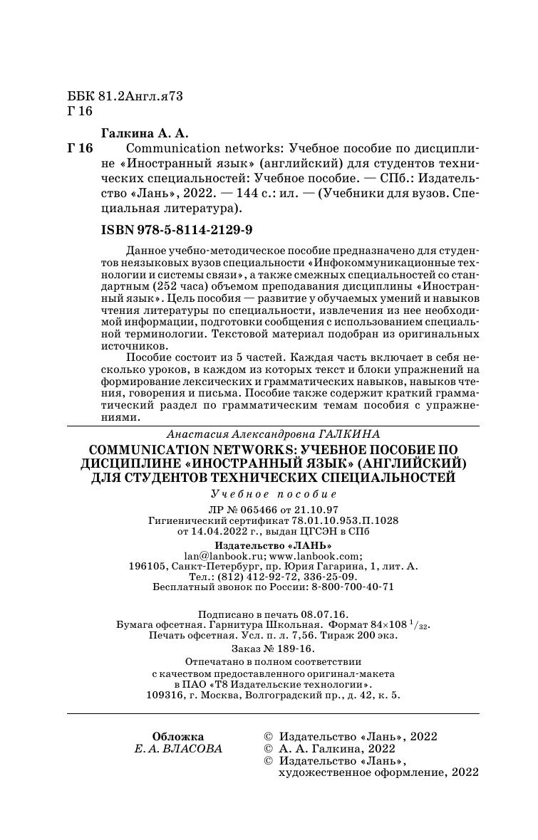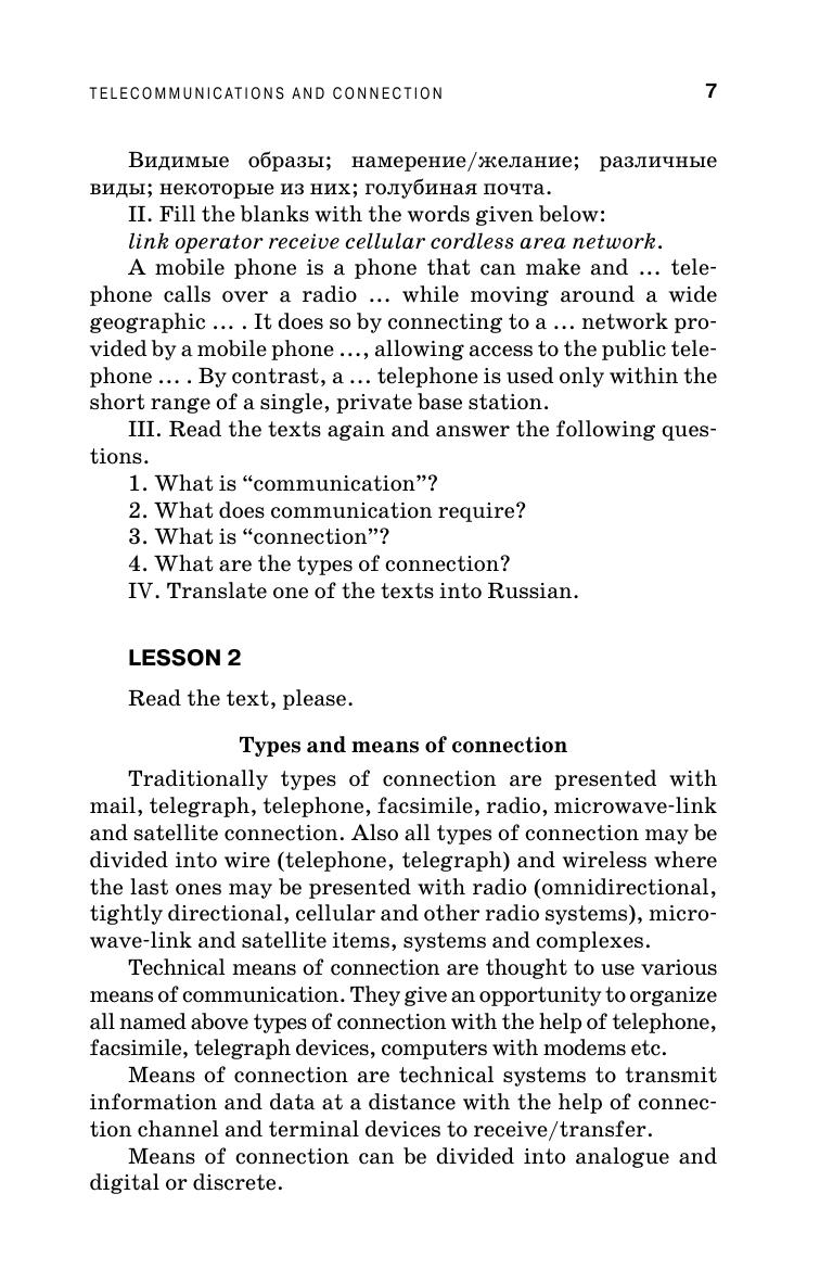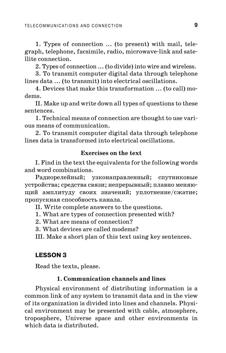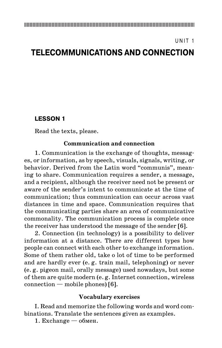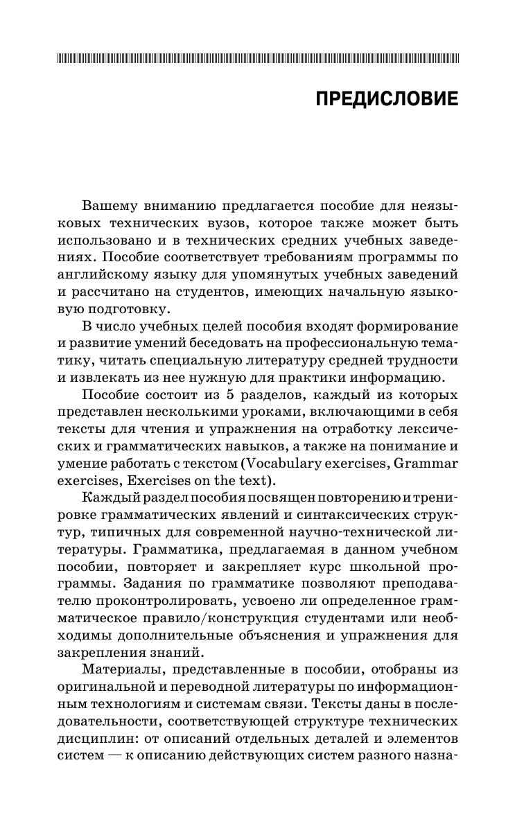 Данное учебно-методическое пособие предназначено для студентов неязыковых вузов специальности «Инфокоммуникационные технологии и системы связи», а также смежных специальностей со стандартным (252 часа) объемом преподавания дисциплины «Иностранный язык». Цель пособия — развитие у обучаемых умений и навыков чтения литературы по специальности, извлечения из нее необходимой информации, подготовки сообщения с использованием специальной терминологии. Текстовой материал подобран из оригинальных источников. Пособие состоит из 5 частей. Каждая часть включает в себя несколько уроков, в каждом из которых текст и блоки упражнений на формирование лексических и грамматических навыков, навыков чтения, говорения и письма. Пособие также содержит краткий грамматический раздел по грамматическим темам пособия с упражнениями.