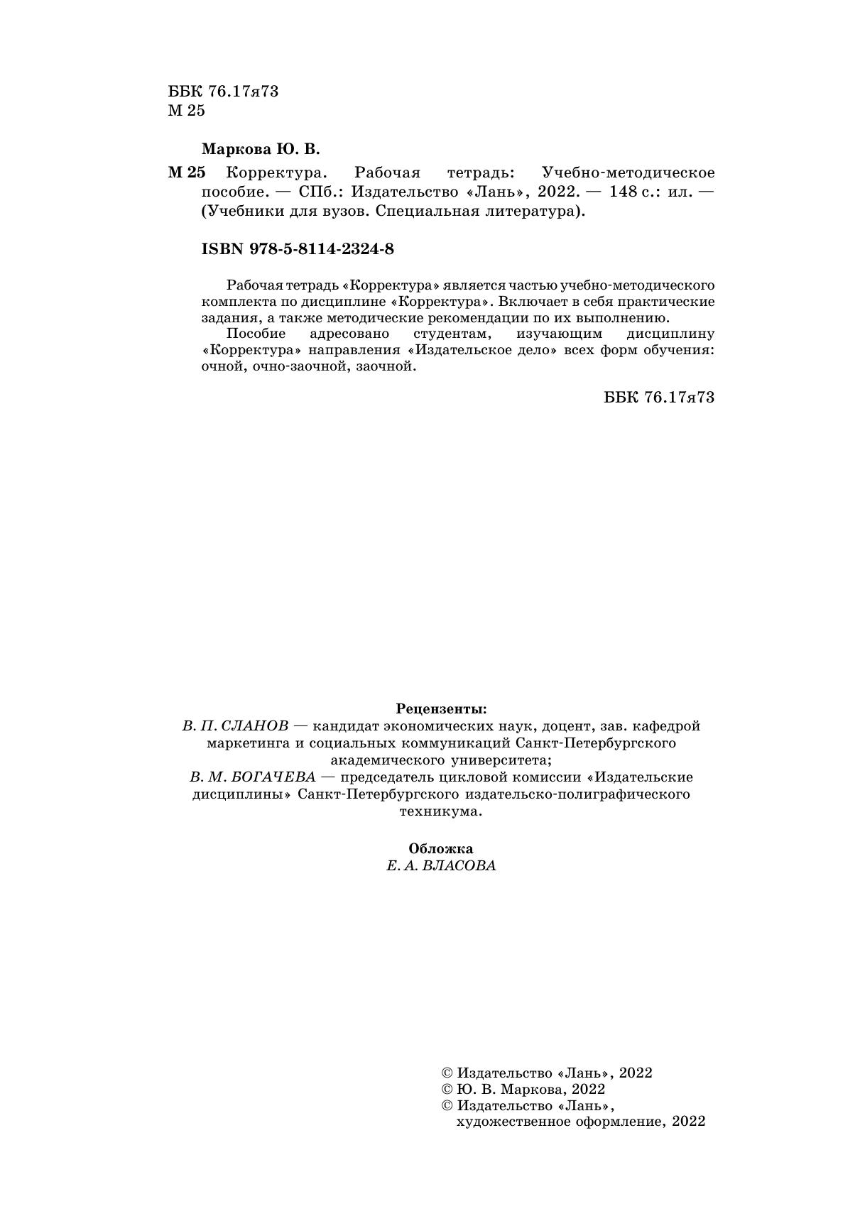 Рабочая тетрадь «Корректура» является частью учебно-методического комплекта по дисциплине «Корректура». Включает в себя практические задания, а также методические рекомендации по их выполнению. Пособие адресовано студентам, изучающим дисциплину «Корректура» направления «Издательское дело» всех форм обучения: очной, очно-заочной, заочной.