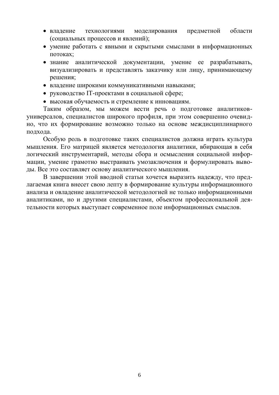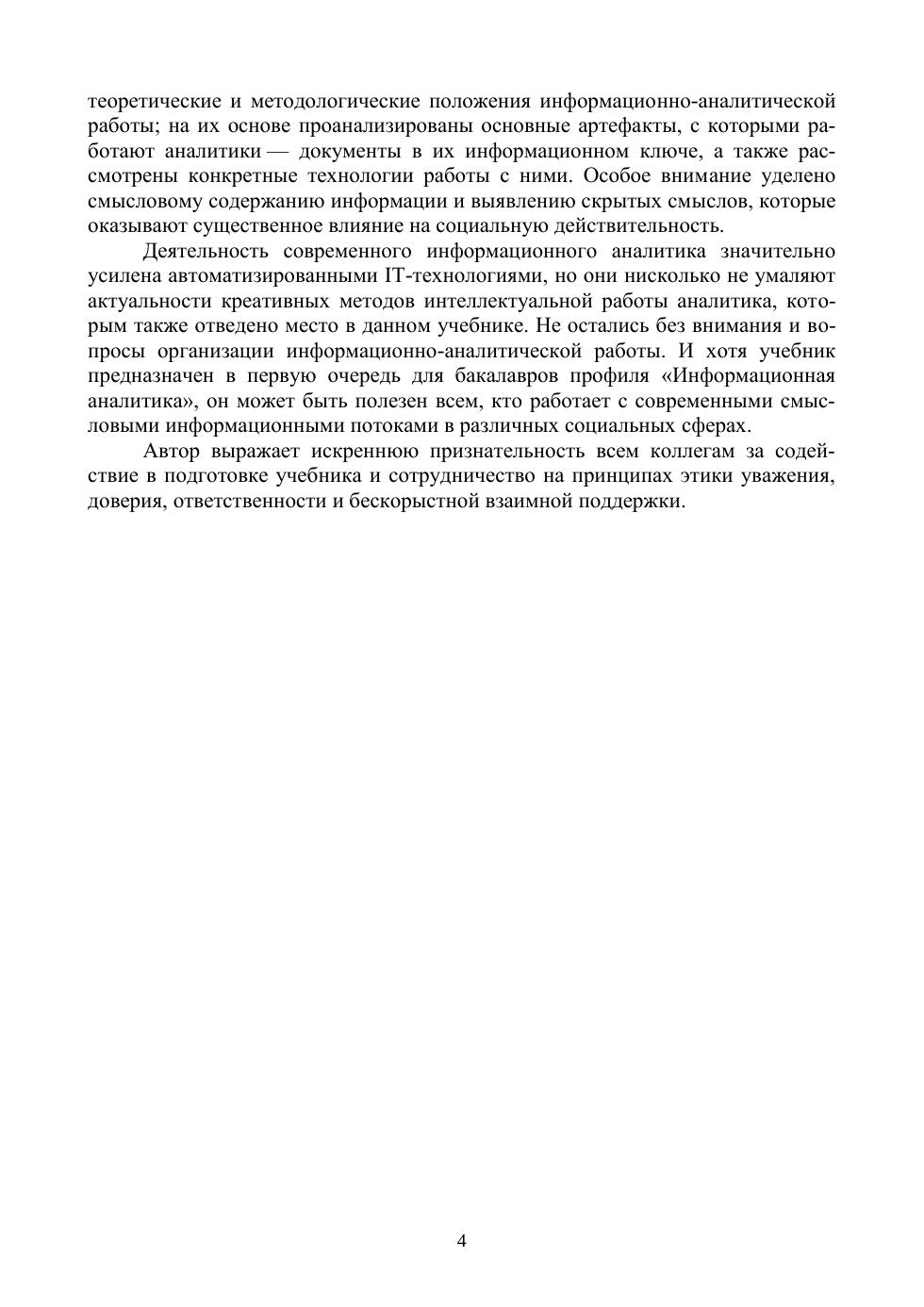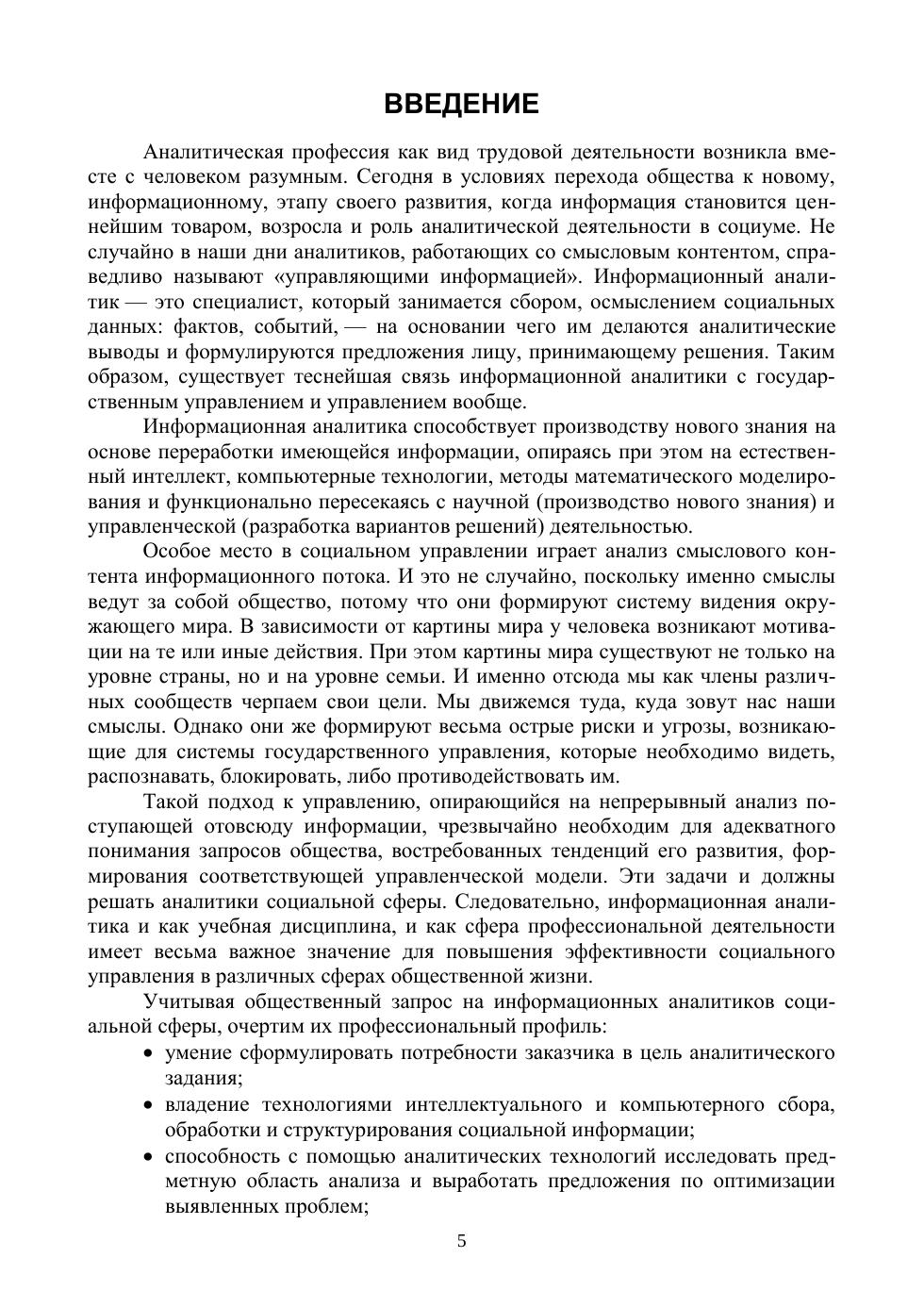 Предлагаемый учебник предназначен для обучения студентов вузов основам информационно-аналитической работы в области социального (экономического, муниципального, государственного) управления. В нем подробно излагаются базовые теоретические и методологические сведения формирующегося научного направления – информационная аналитика, а также рассматриваются конкретные технологии аналитической работы с социальной информацией, практикуемые профессиональными аналити-ками: «мозговой штурм», контент-анализ, event-анализ, интент-анализ и другие. Учебник предназначен для студентов вузов, обучающихся по направлениям подготовки «Прикладная информатика», «Информационные системы и технологии», «Государственное и муниципальное управление», «Международные отношения», «Социология», а также по другим направлениям, связанным с анализом смысловой информации и подготовкой предложений лицу, принимающему управленческие решения.