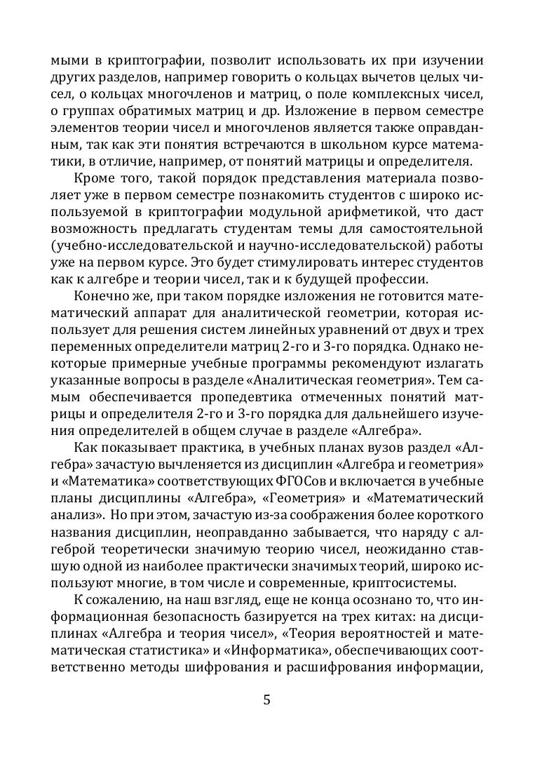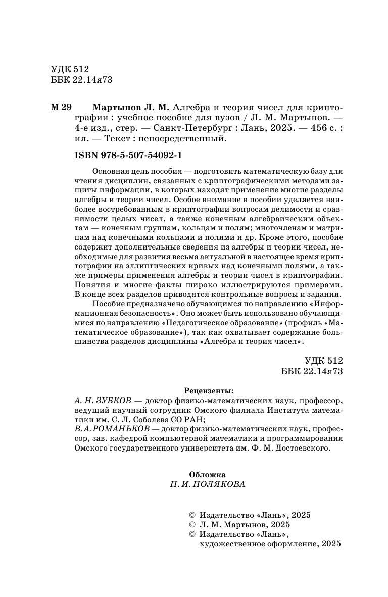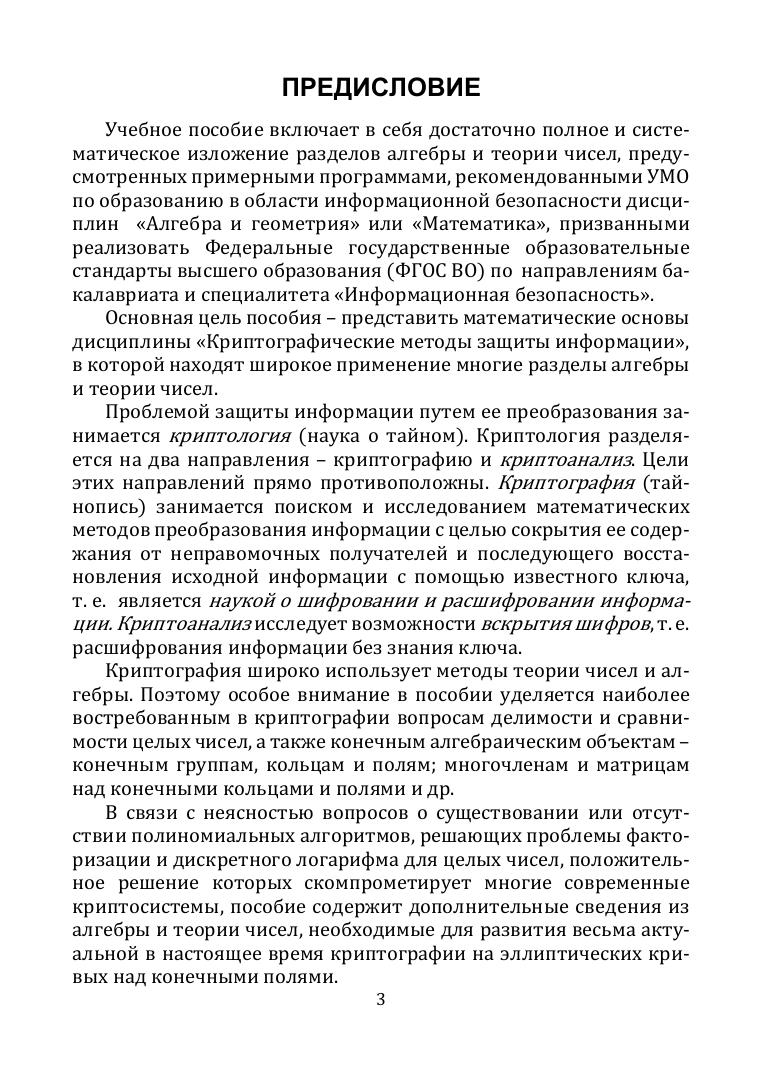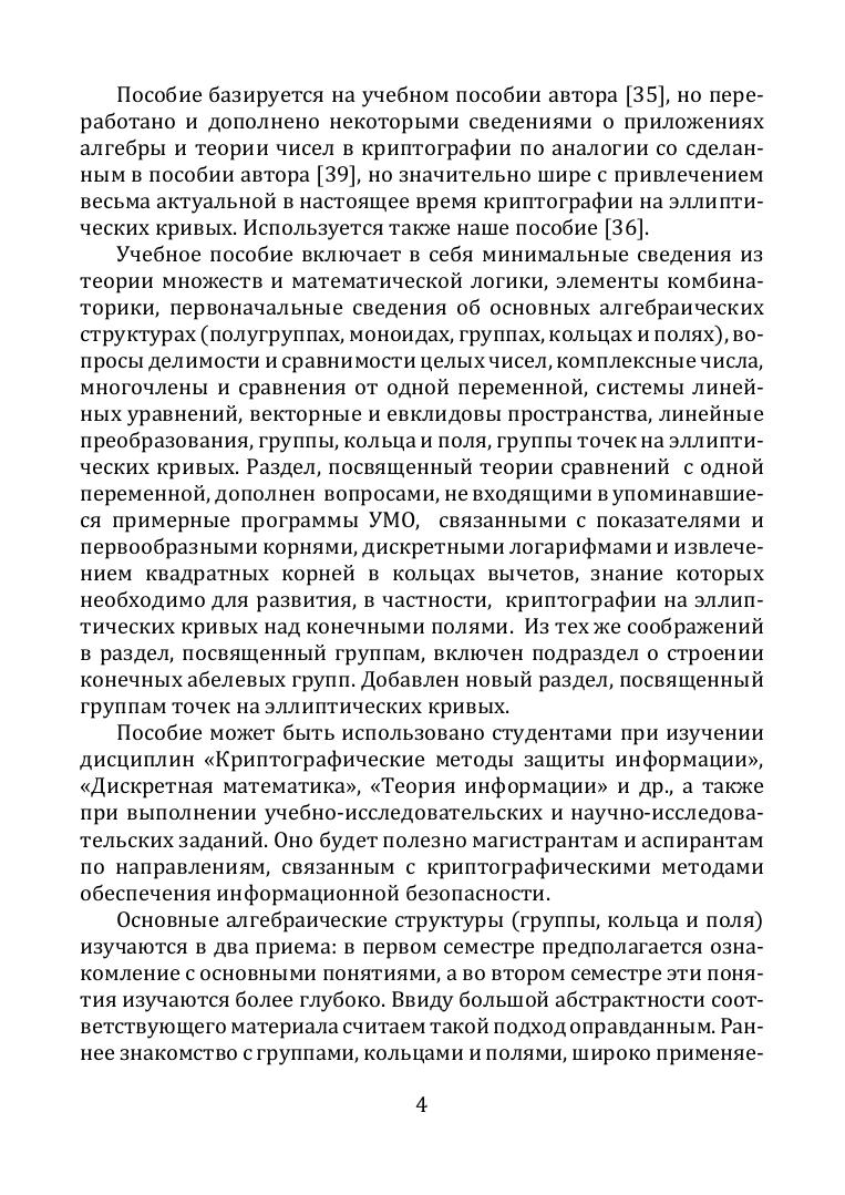 Основная цель пособия — подготовить математическую базу для чтения дисциплин, связанных с криптографическими методами защиты информации, в которых находят применение многие разделы алгебры и теории чисел. Особое внимание в пособии уделяется наиболее востребованным в криптографии вопросам делимости и сравнимости целых чисел, а также конечным алгебраическим объектам — конечным группам, кольцам и полям, многочленам и матрицам над конечными кольцами и полями и др. Кроме этого, пособие содержит дополнительные сведения из алгебры и теории чисел, необходимые для развития весьма актуальной в настоящее время криптографии на эллиптических кривых над конечными полями, а также содержит примеры применения алгебры и теории чисел в криптографии. Понятия и многие факты широко иллюстрируются примерами. В конце всех разделов приводятся контрольные вопросы и задания. Пособие предназначено обучающимся по направлениям бакалавриата и специалитета «Информационная безопасность». Оно может быть использовано обучающимися по направлению бакалавриата «Педагогическое образование» (профиль «Математическое образование»), так как охватывает содержание большинства разделов дисциплины «Алгебра и теория чисел».