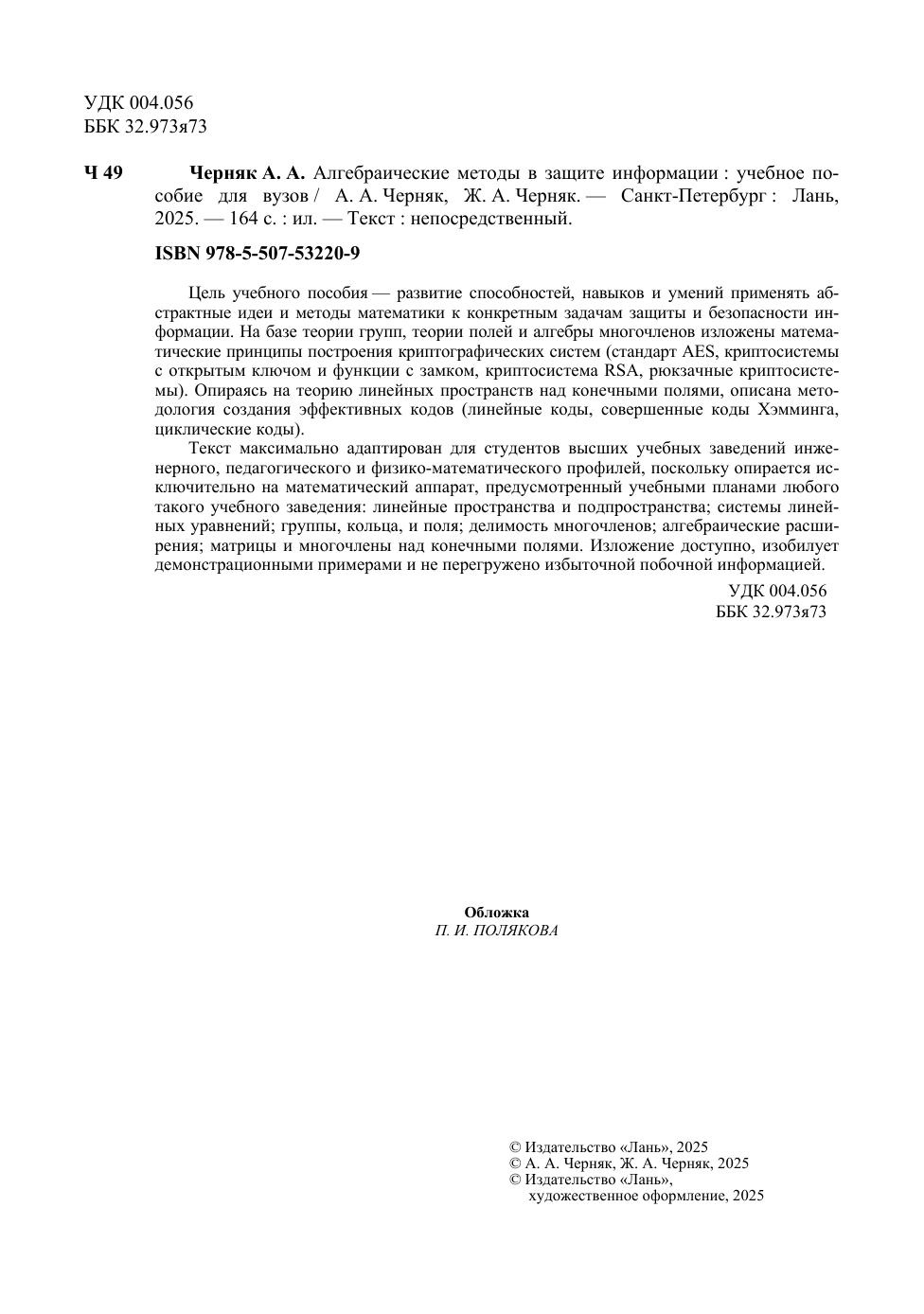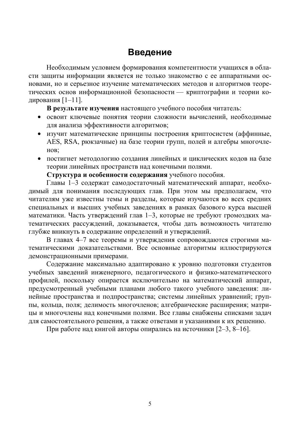 Цель учебного пособия — развитие способностей, навыков и умений применять абстрактные идеи и методы математики к конкретным задачам защиты и безопасности информации. На базе теории групп, теории полей и алгебры многочленов изложены математические принципы построения криптографических систем (стандарт AES, криптосистемы с открытым ключом и функции с замком, криптосистема RSA, рюкзачные криптосистемы). Опираясь на теорию линейных пространств над конечными полями, описана методология создания эффективных кодов (линейные коды, совершенные коды Хэмминга, циклические коды). Текст максимально адаптирован для студентов высших учебных заведений инженерного, педагогического и физико-математического профилей, поскольку опирается исключительно на математический аппарат, предусмотренный учебными планами любого такого учебного заведения: линейные пространства и подпространства, системы линейных уравнений, группы, кольца, и поля, делимость многочленов, алгебраические расширения, матрицы и многочлены над конечными полями. Изложение доступно, изобилует демонстрационными примерами и не перегружено избыточной побочной информацией.
