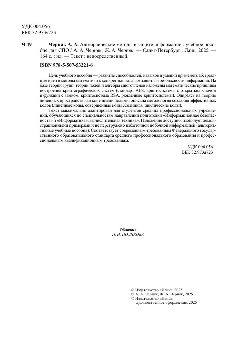 Цель учебного пособия — развитие способностей, навыков и умений применять абстрактные идеи и методы математики к конкретным задачам защиты и безопасности информации. На базе теории групп, теории полей и алгебры многочленов изложены математические принципы построения криптографических систем (стандарт AES, криптосистемы с открытым ключом и функции с замком, криптосистема RSA, рюкзачные криптосистемы). Опираясь на теорию линейных пространств над конечными полями, описана методология создания эффективных кодов (линейные коды, совершенные коды Хэмминга, циклические коды). Текст максимально адаптирован для студентов средних профессиональных учреждений, обучающихся по специальностям направлений подготовки «Информационная безопасность» и «Информатика и вычислительная техника». Изложение доступно, изобилует демонстрационными примерами и не перегружено избыточной побочной информацией (альтернативные учебные пособия). Соответствует современным требованиям Федерального государственного образовательного стандарта среднего профессионального образования и профессиональным квалификационным требованиям.