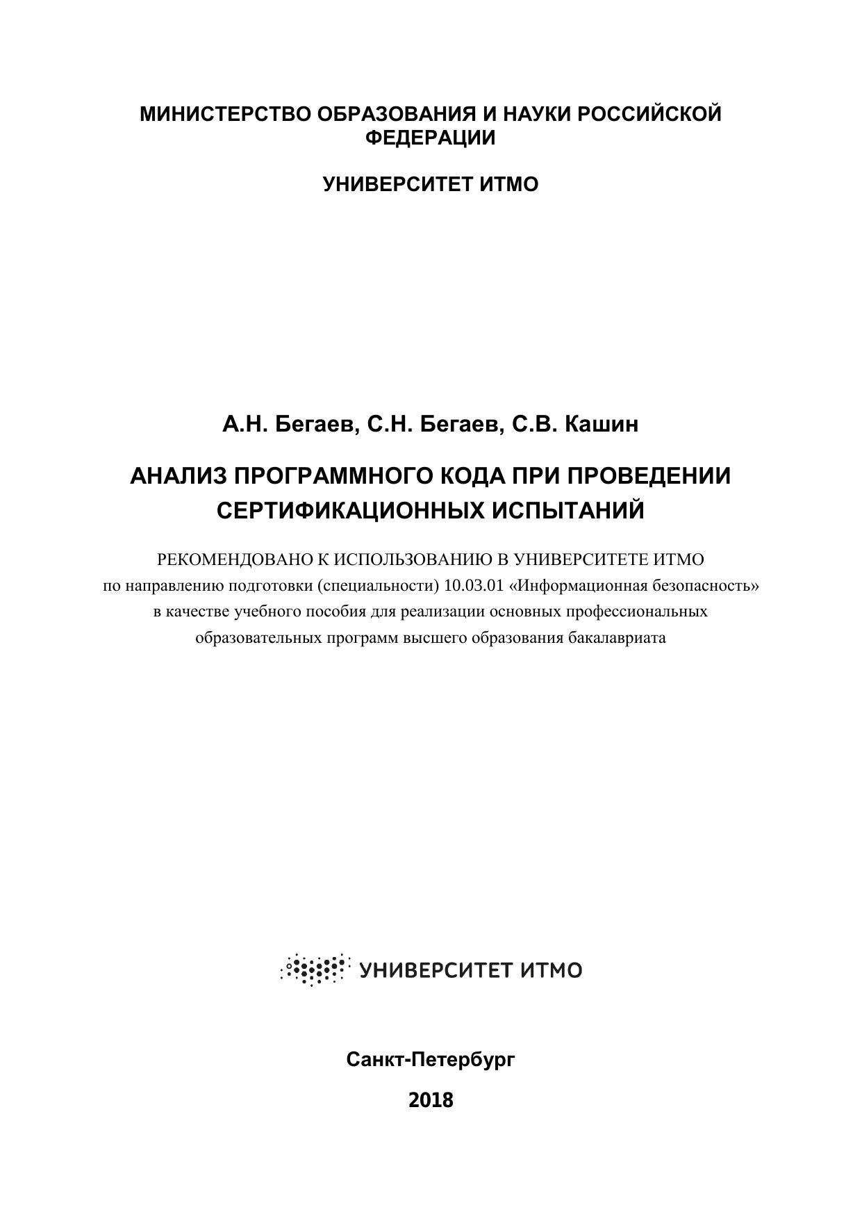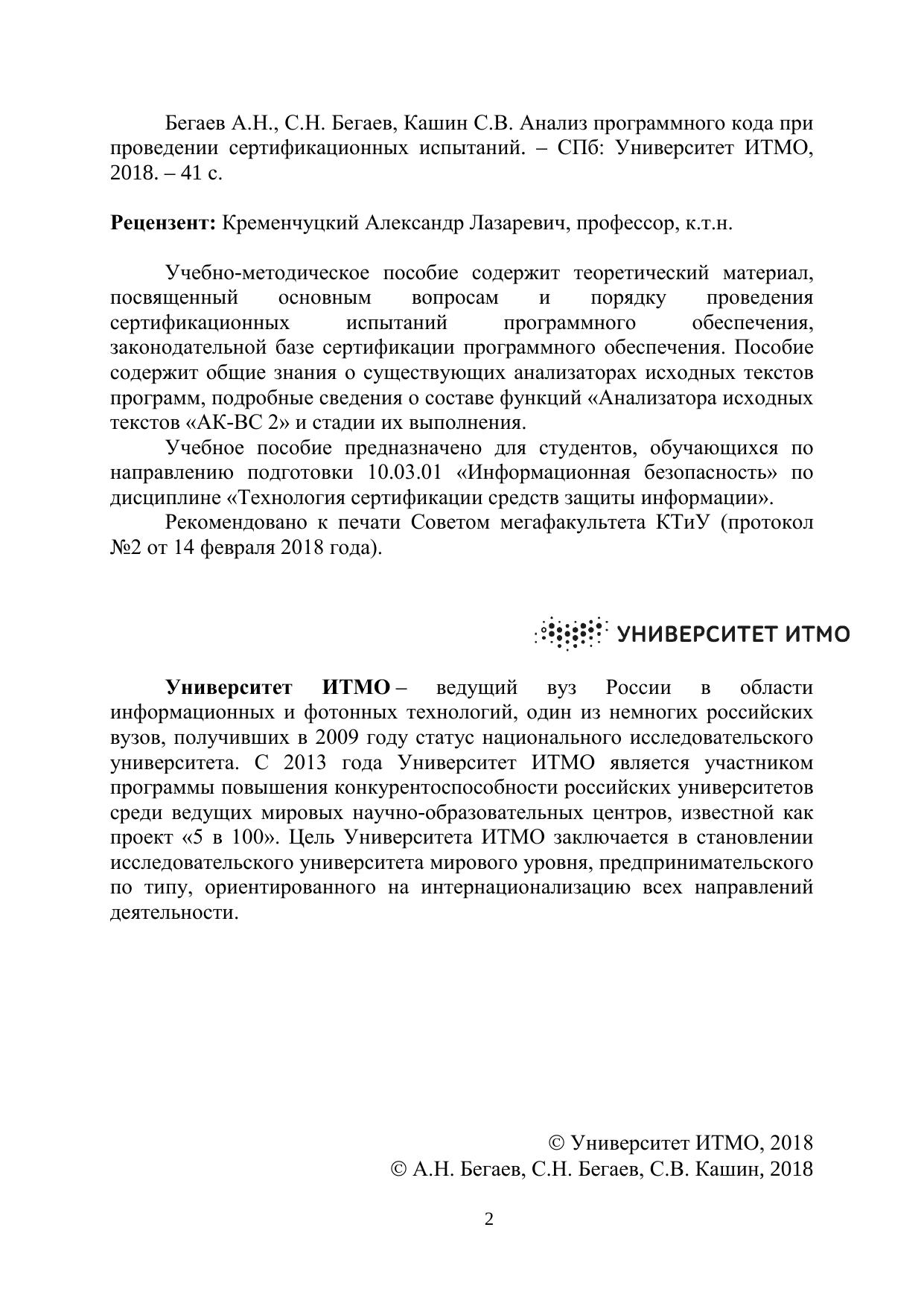 Учебно-методическое пособие содержит теоретический материал, посвященный основным вопросам и порядку проведения сертификационных испытаний программного обеспечения, законодательной базе сертификации программного обеспечения. Пособие содержит общие знания о существующих анализаторах исходных текстов программ, подробные сведения о составе функций «Анализатора исходных текстов «АК-ВС 2» и стадии их выполнения. Учебное пособие предназначено для студентов, обучающихся по направлению подготовки 10.03.01 «Информационная безопасность» по дисциплине «Технология сертификации средств защиты информации».
