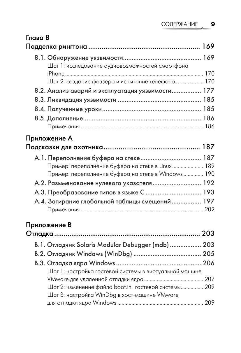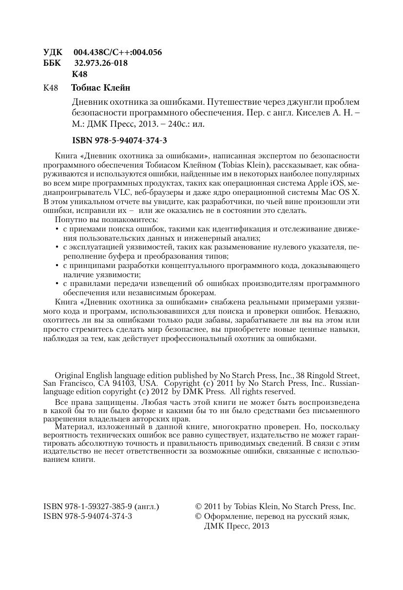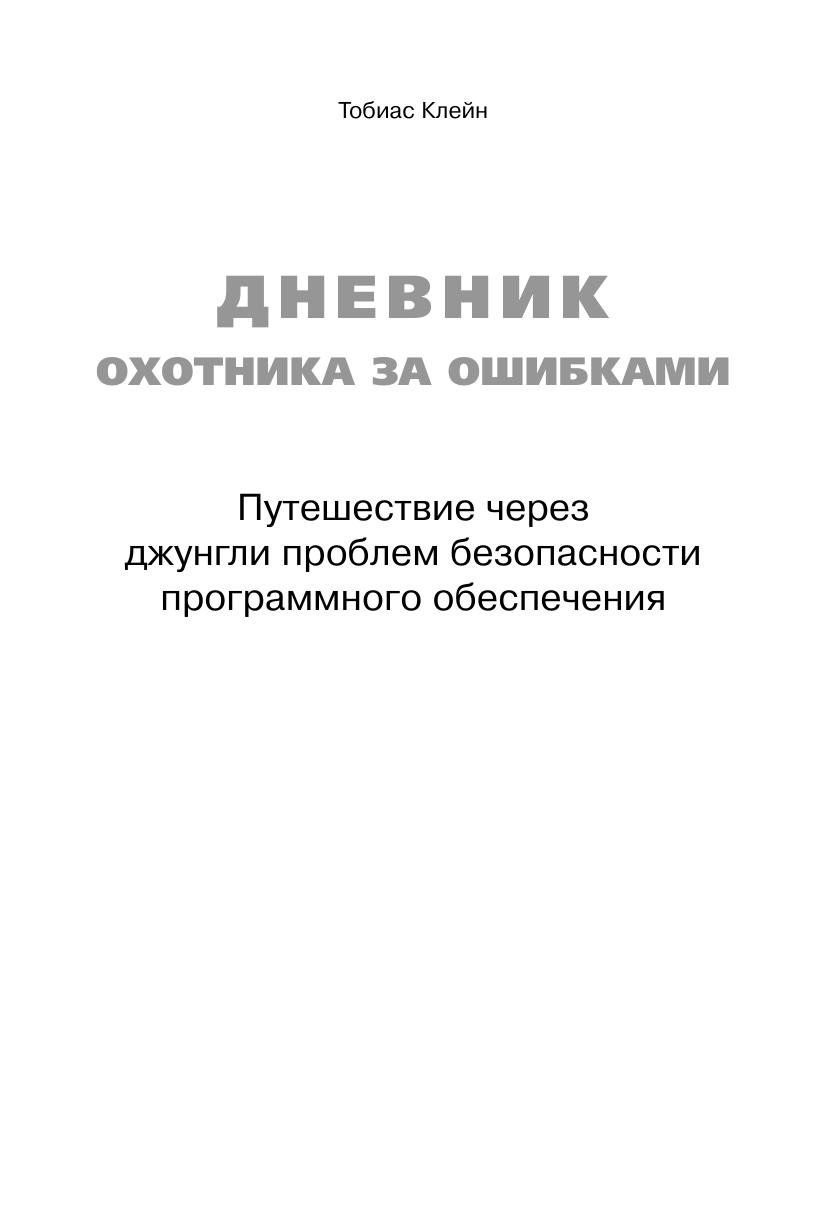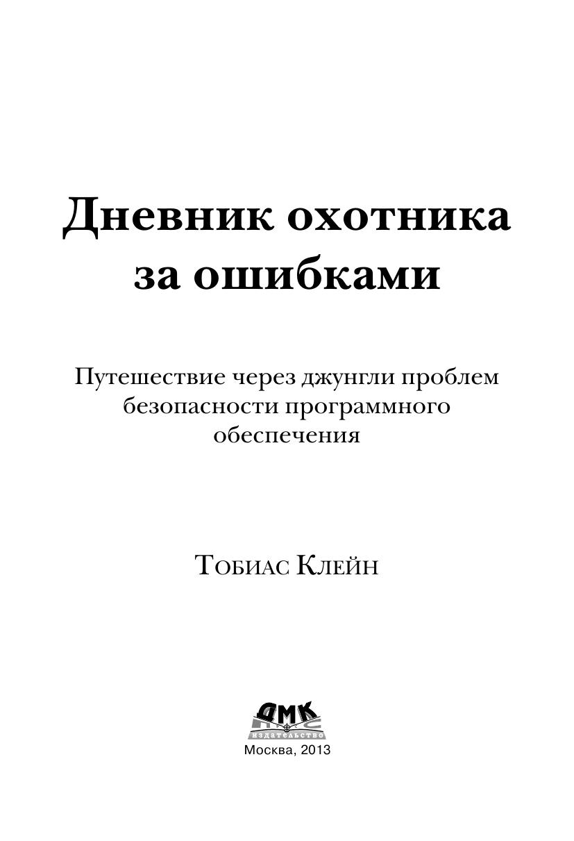 Книга «Дневник охотника за ошибками», написанная экспертом по безопасности программного обеспечения Тобиасом Клейном (Tobias Klein), рассказывает, как обнаруживаются и используются ошибки, найденные им в некоторых наиболее популярных во всем мире программных продуктах, таких как операционная система Apple iOS, медиапроигрыватель VLC, веб-браузеры и даже ядро операционной системы Mac OS X. В этом уникальном отчете вы увидите, как разработчики, по чьей вине произошли эти ошибки, исправили их – или же оказались не в состоянии это сделать. Книга «Дневник охотника за ошибками» снабжена реальными примерами уязвимого кода и программ, использовавшихся для поиска и проверки ошибок. Неважно, охотитесь ли вы за ошибками только ради забавы, зарабатываете ли вы на этом или просто стремитесь сделать мир безопаснее, вы приобретете новые ценные навыки, наблюдая за тем, как действует профессиональный охотник за ошибками.