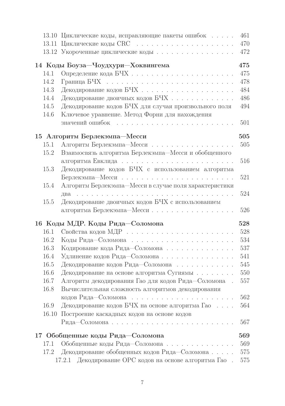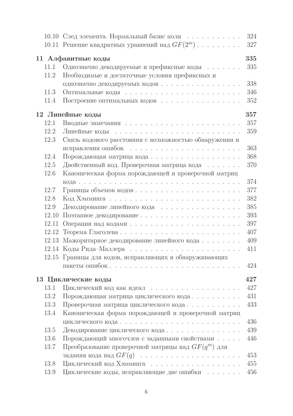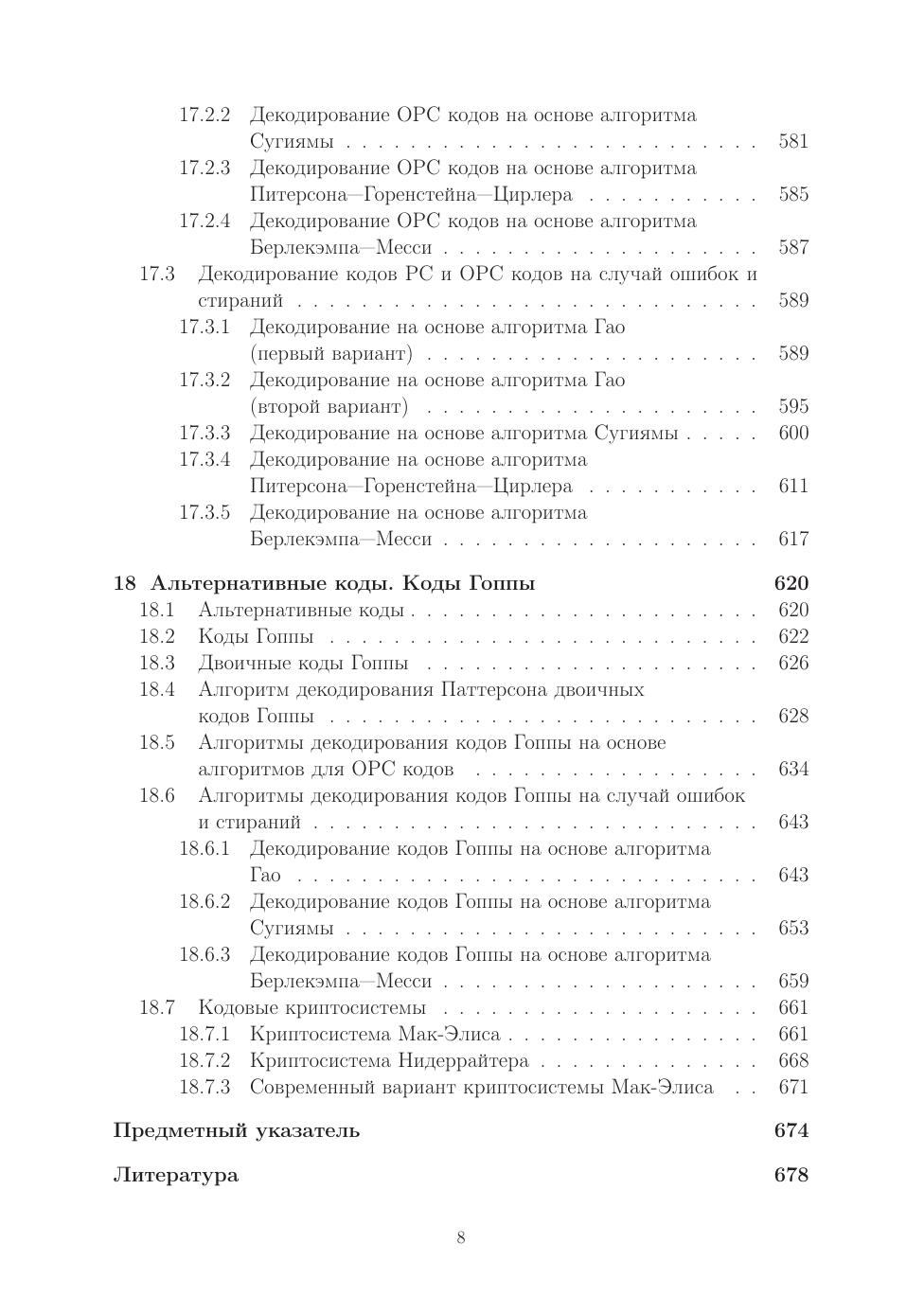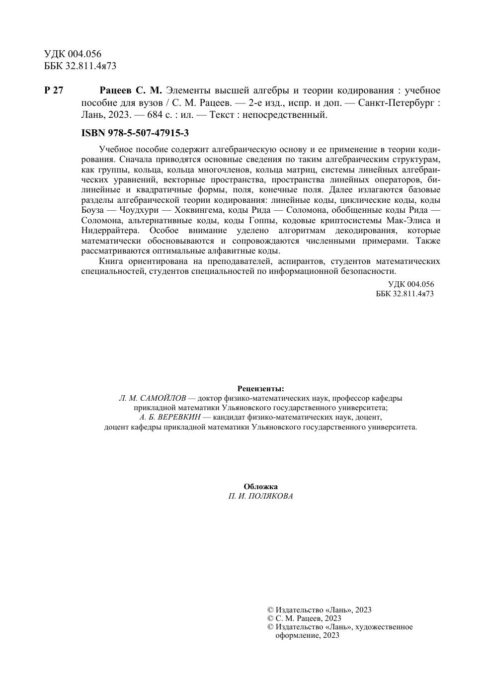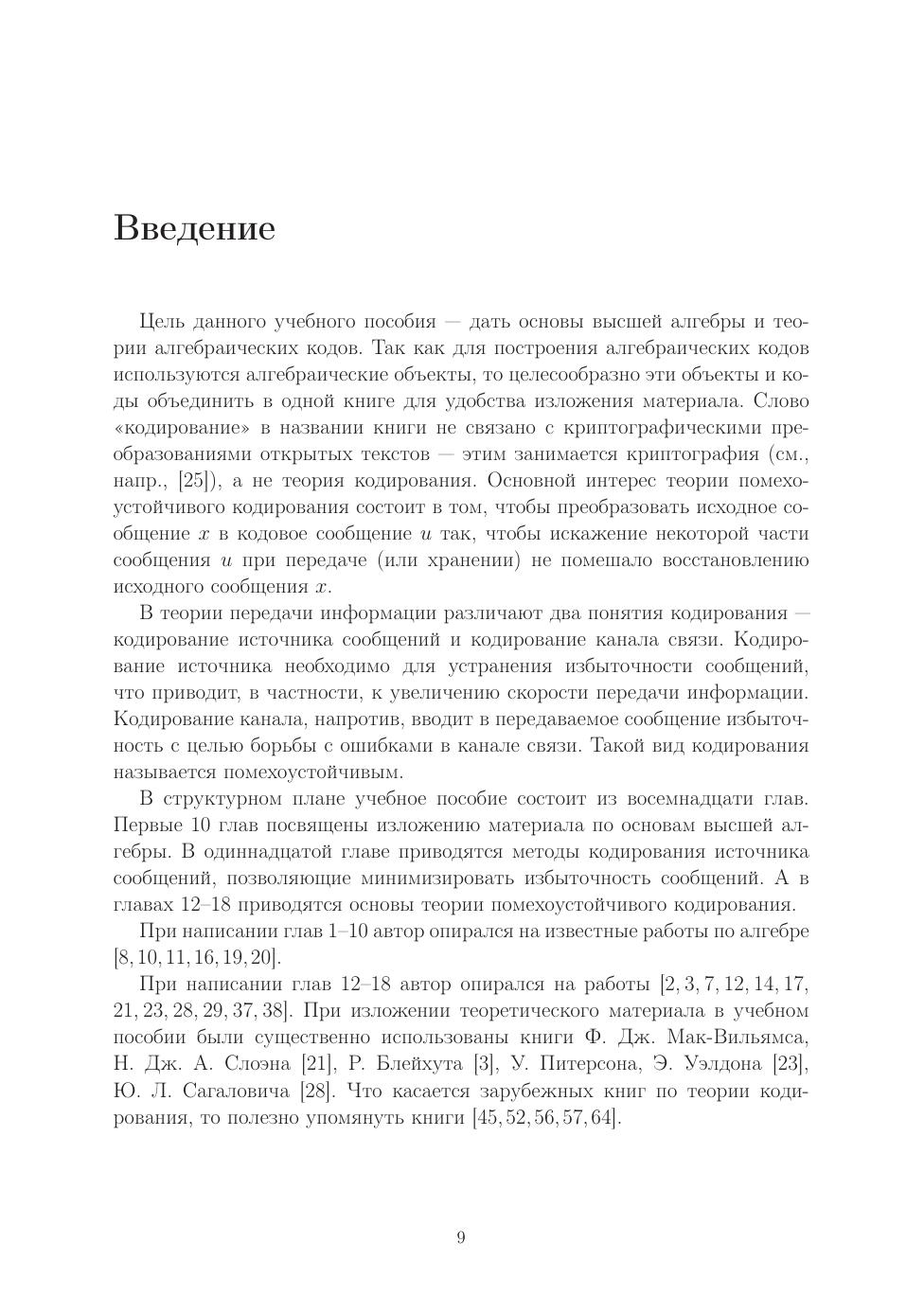 Учебное пособие содержит алгебраическую основу и ее применение в теории кодирования. Сначала приводятся основные сведения по таким ал- гебраическим структурам, как группы, кольца, кольца многочленов, кольца матриц, системы линейных алгебраических уравнений, векторные про- странства, пространства линейных операторов, билинейные и квадратич- ные формы, поля, конечные поля. Далее излагаются базовые разделы ал- гебраической теории кодирования: линейные коды, циклические коды, коды Боуза-Чоудхури-Хоквингема, коды Рида-Соломона, обобщенные коды Рида-Соломона, альтернативные коды, коды Гоппы, кодовые криптосистемы Мак-Элиса и Нидеррайтера. Особое внимание уделено алгоритмам де- кодирования, которые математически обосновываются и сопровождаются численными примерами. Также рассматриваются оптимальные алфавитные коды. Книга ориентирована на преподавателей, аспирантов, студентов ма- тематических специальностей, студентов специальностей по информационной безопасности.
