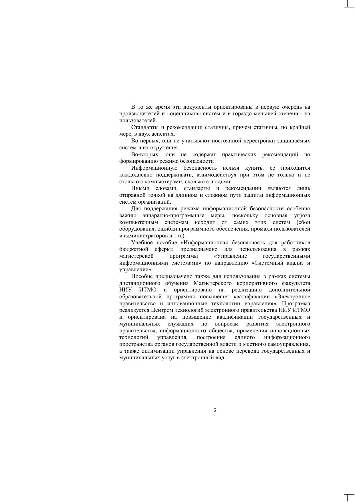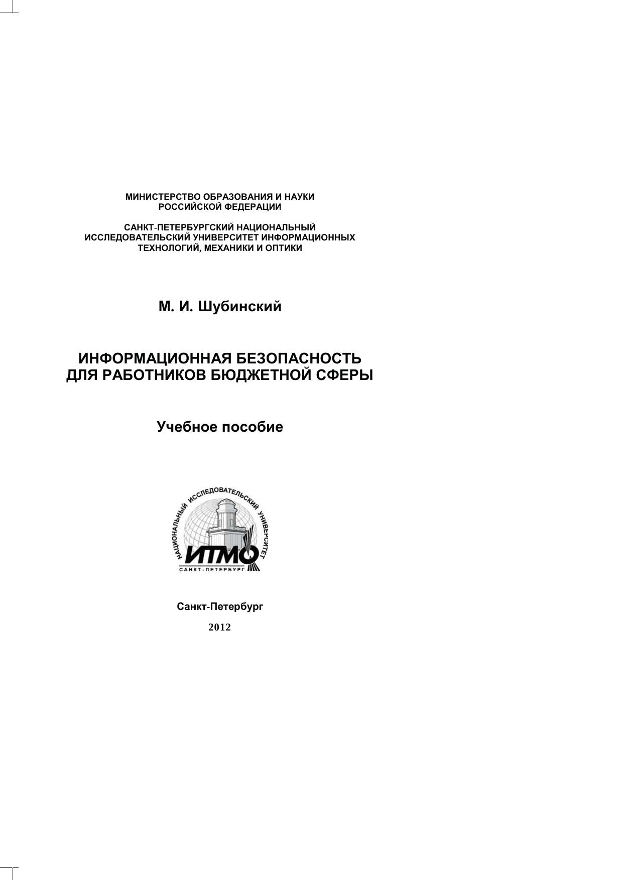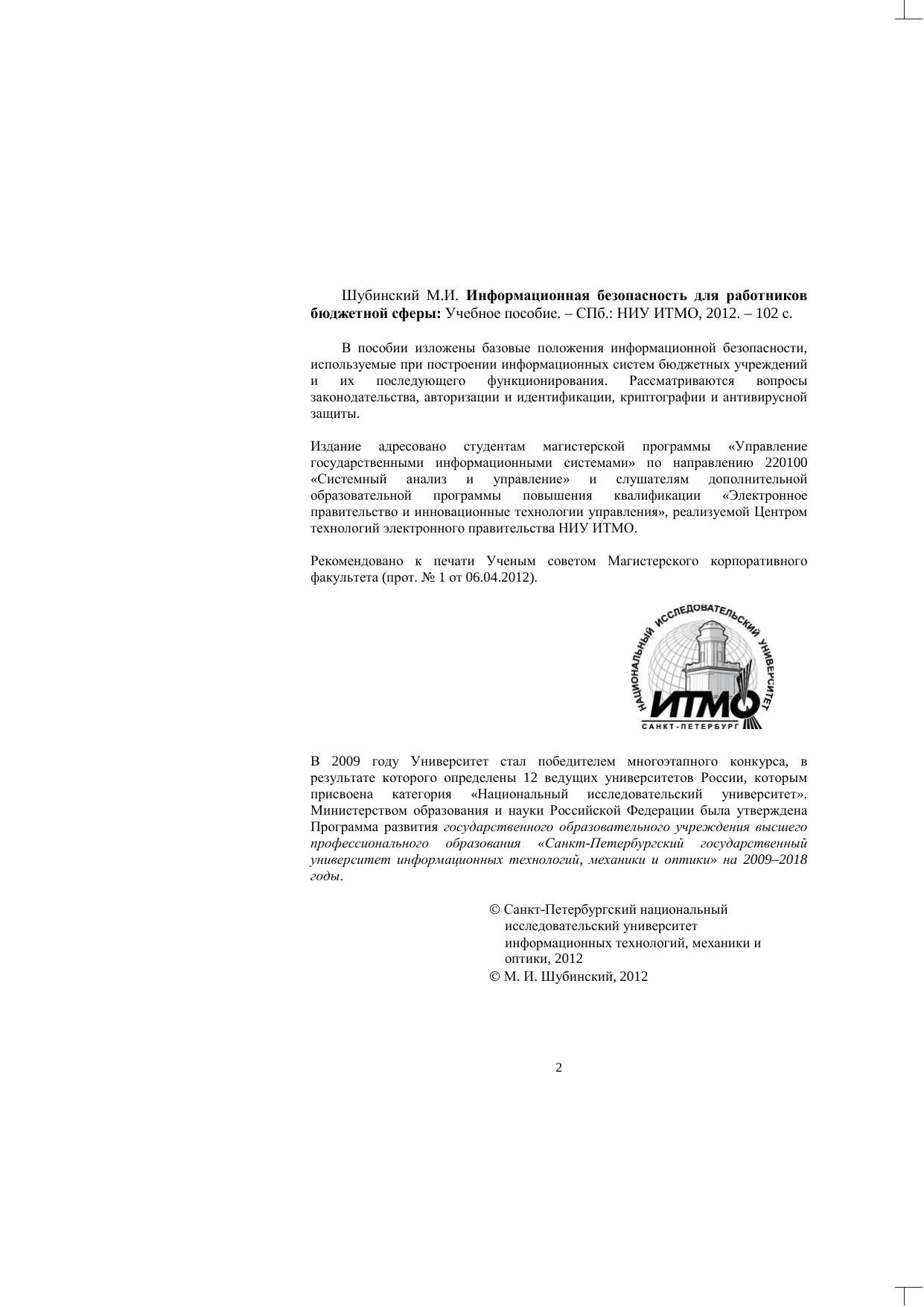 В пособии изложены базовые положения информационной безопасности, используемые при построении информационных систем бюджетных учреждений и их последующего функционирования. Рассматриваются вопросы законодательства, авторизации и идентификации, криптографии и антивирусной защиты. Издание адресовано студентам магистерской программы «Управление государственными информационными системами» по направлению 220100 «Системный анализ и управление» и слушателям дополнительной образовательной программы повышения квалификации «Электронное правительство и инновационные технологии управления», реализуемой Центром технологий электронного правительства НИУ ИТМО.