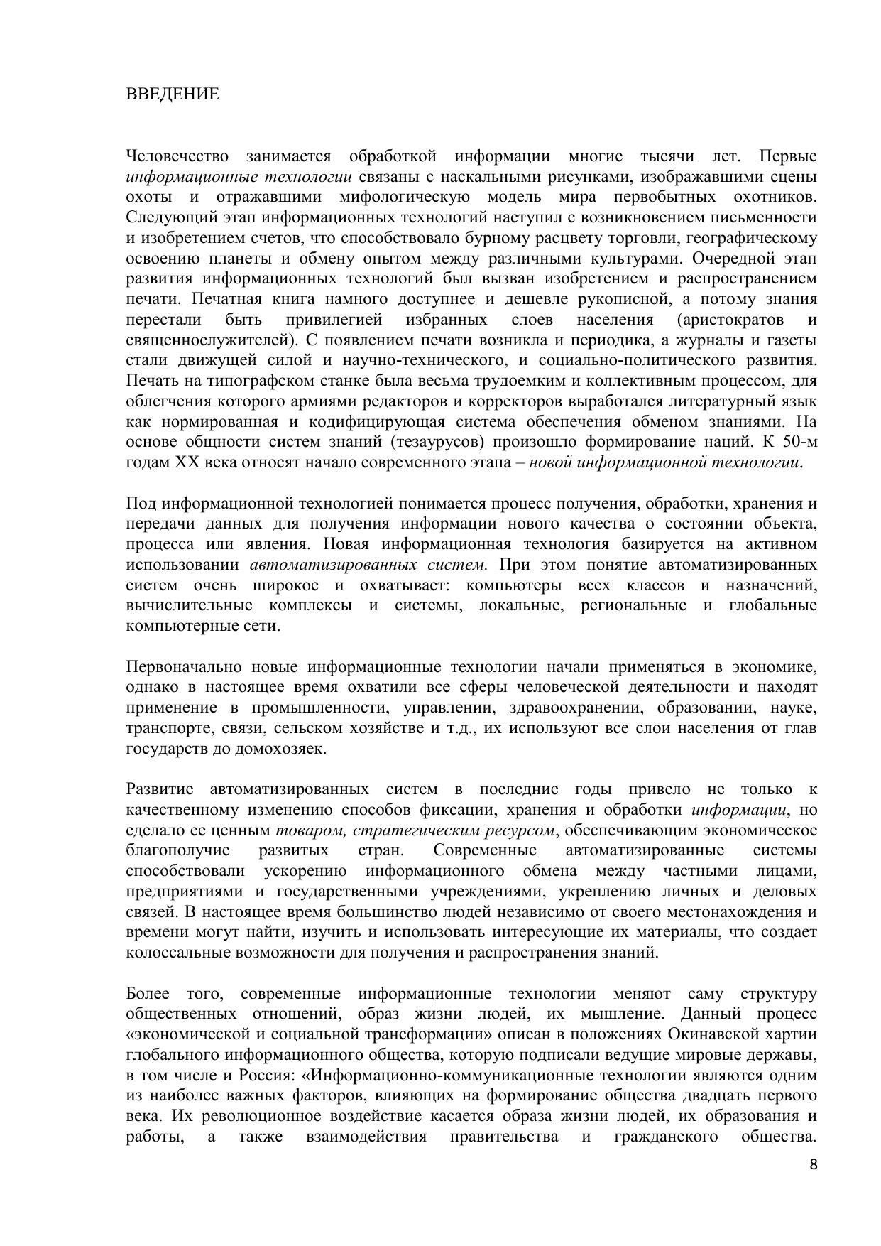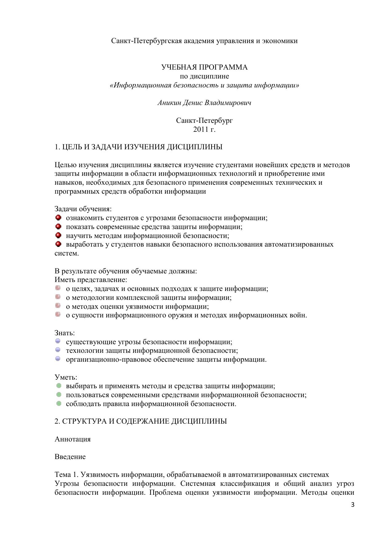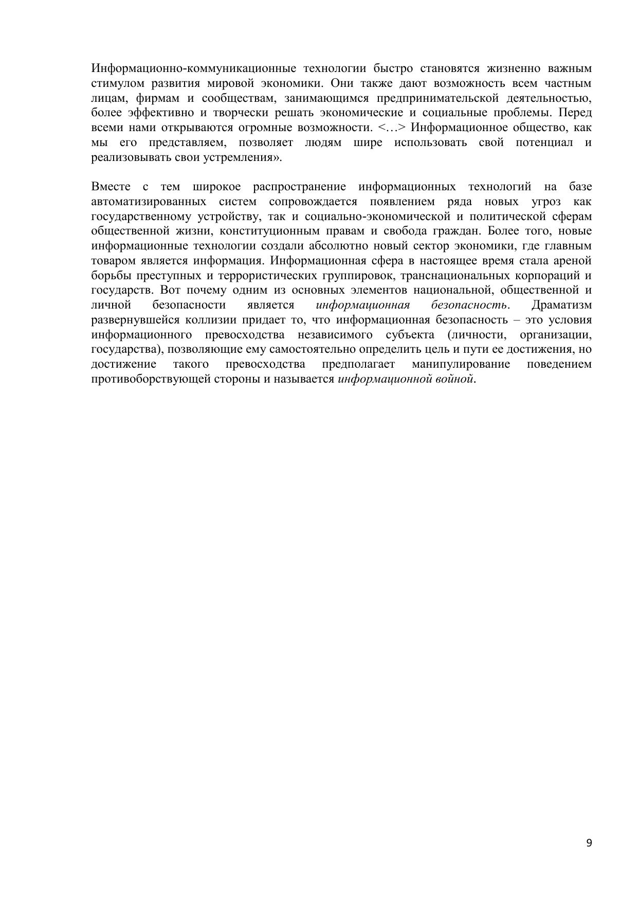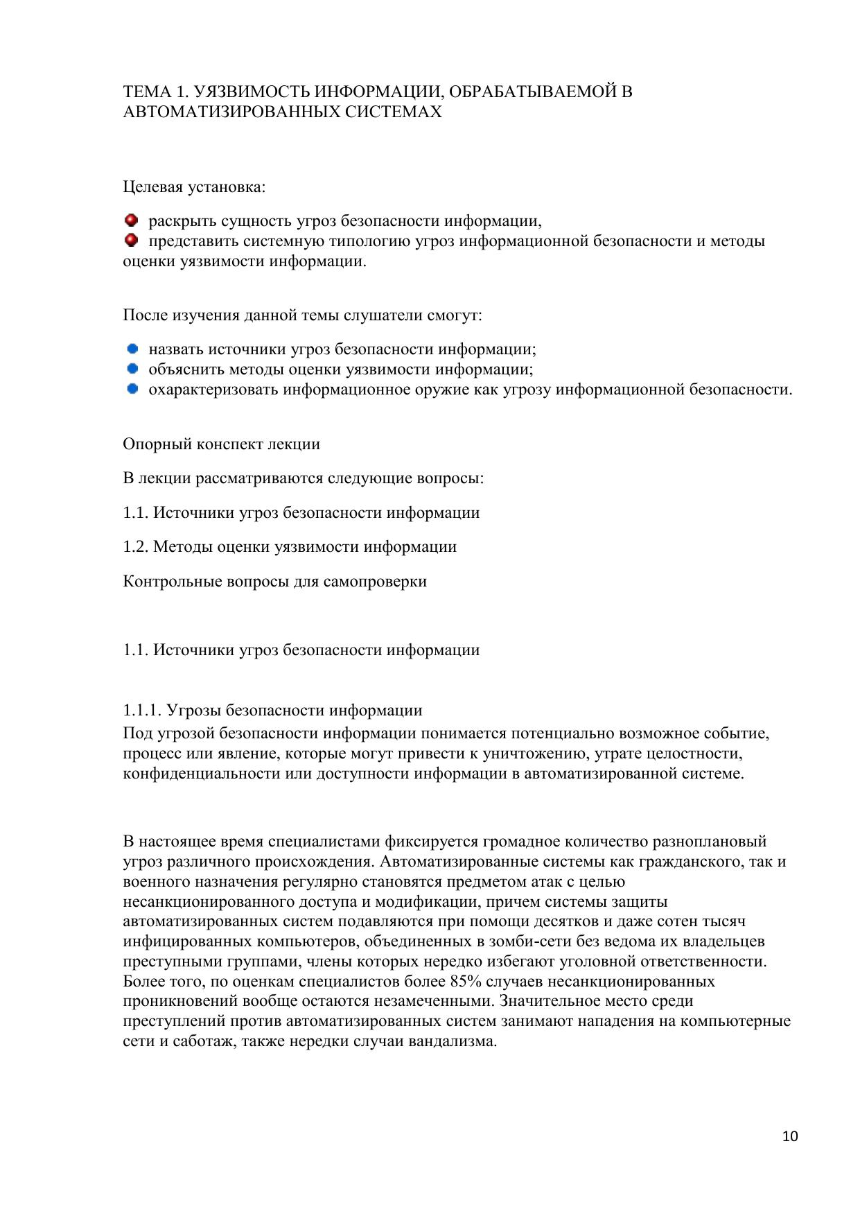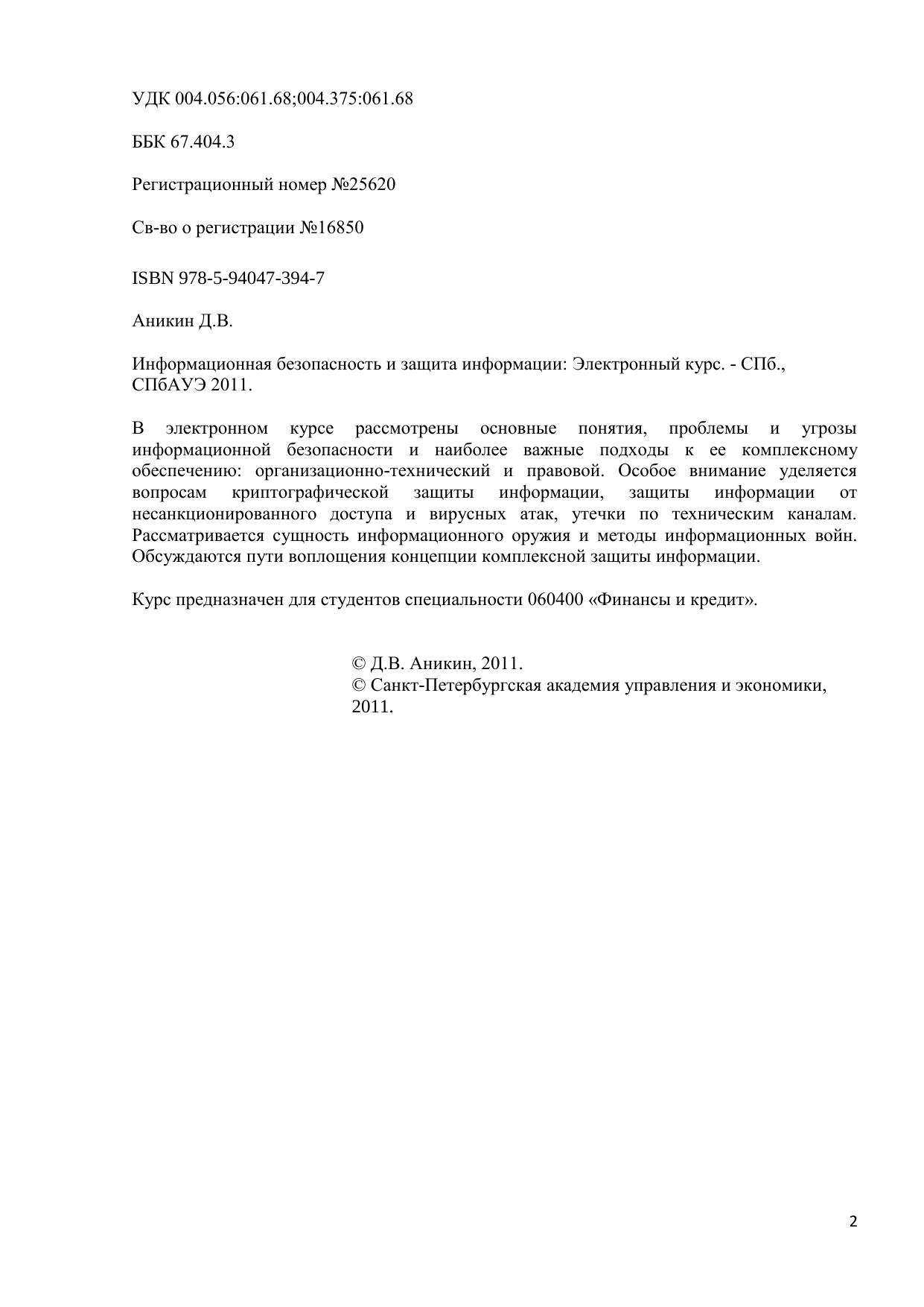В электронном курсе рассмотрены основные понятия, проблемы и угрозы информационной безопасности и наиболее важные подходы к ее комплексному обеспечению: организационно-технический и правовой. Особое внимание уделяется вопросам криптографической защиты информации, защиты информации от несанкционированного доступа и вирусных атак, утечки по техническим каналам. Рассматривается сущность информационного оружия и методы информационных войн. Обсуждаются пути воплощения концепции комплексной защиты информации. Курс предназначен для студентов специальности 060400 «Финансы и кредит».