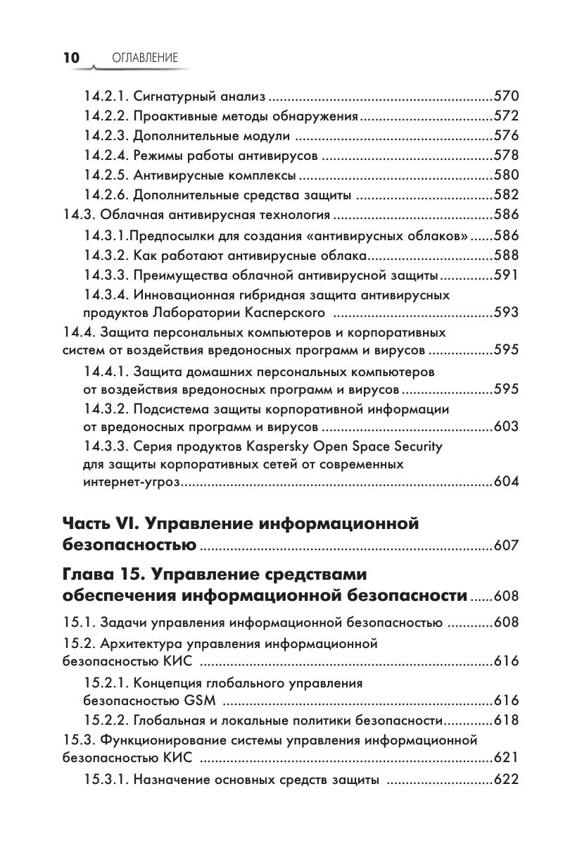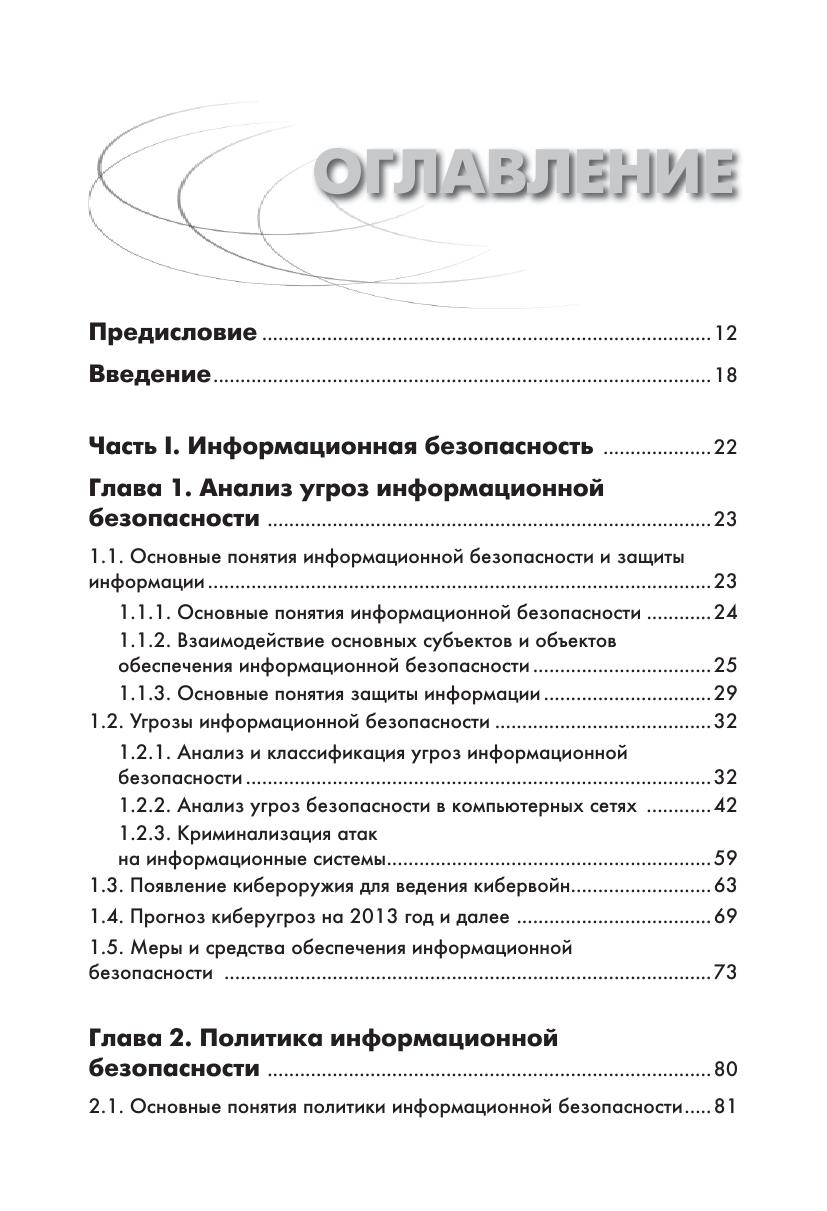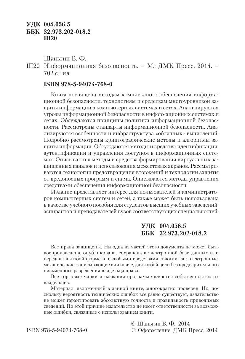 Книга посвящена методам комплексного обеспечения информационной безопасности, технологиям и средствам многоуровневой защиты информации в компьютерных системах и сетях. Анализируются угрозы информационной безопасности в информационных системах и сетях. Обсуждаются принципы политики информационной безопасности. Рассмотрены стандарты информационной безопасности. Анализируются особенности и инфраструктура «облачных» вычислений. Подробно рассмотрены криптографические методы и алгоритмы защиты информации. Обсуждаются методы и средства идентификации, аутентификации и управления доступом в информационных системах. Описываются методы и средства формирования виртуальных защищенных каналов и использования межсетевых экранов. Рассматриваются технологии предотвращения вторжений и технологии защиты от вредоносных программ и спама. Описываются методы управления средствами обеспечения информационной безопасности. Издание представляет интерес для пользователей и администраторов компьютерных систем и сетей, а также может быть использована в качестве учебного пособия для студентов высших учебных заведений, аспирантов и преподавателей вузов соответствующих специальностей.