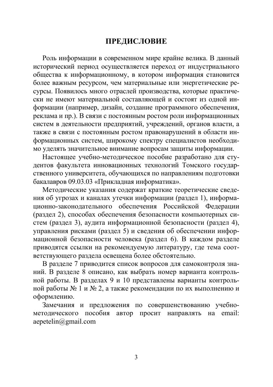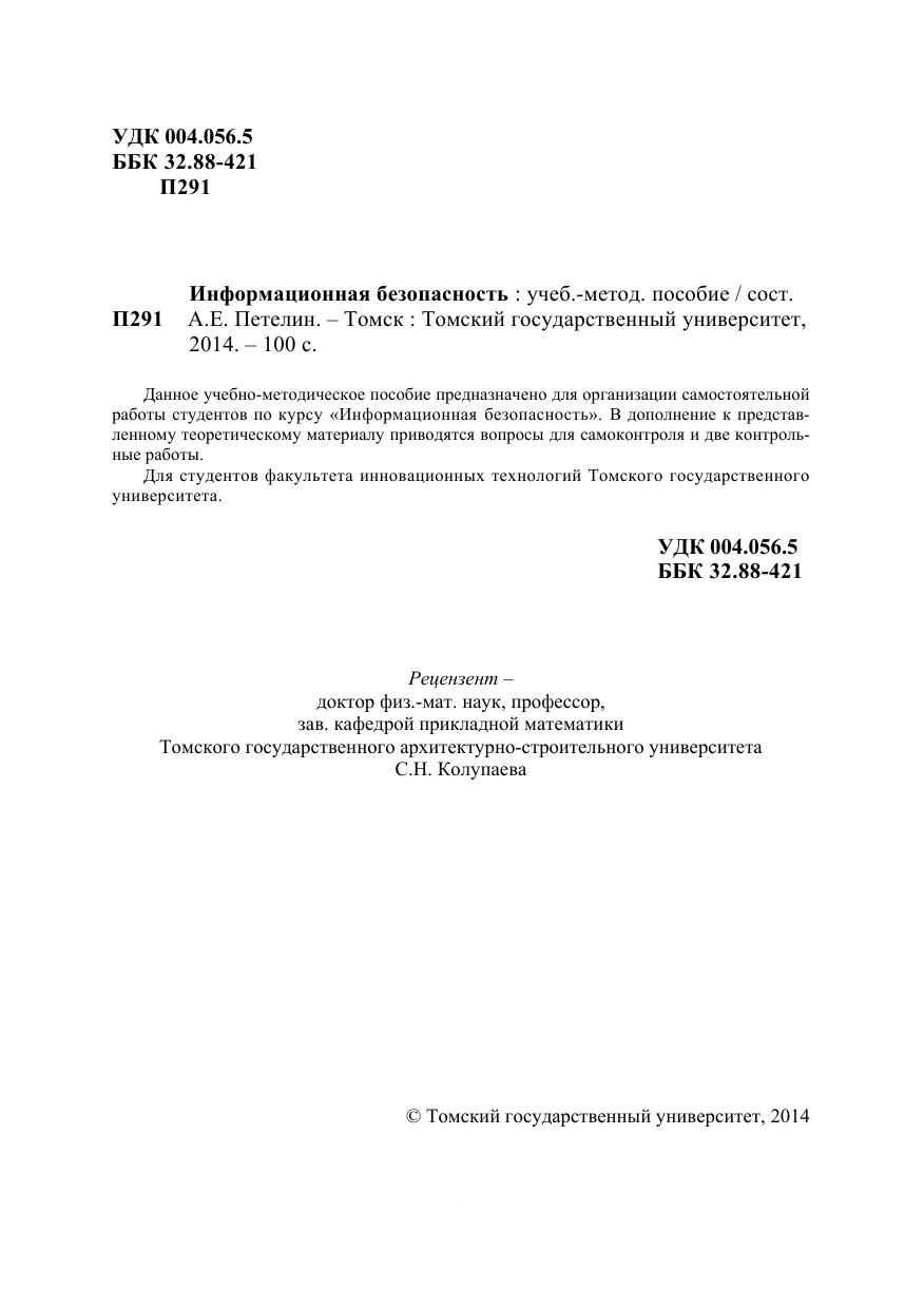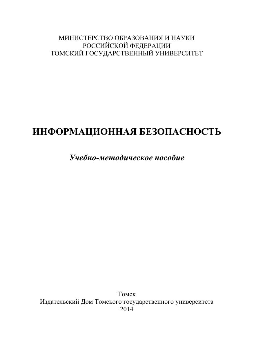 Данное учебно-методическое пособие предназначено для организации самостоятельной работы студентов по курсу «Информационная безопасность». В дополнение к представленному теоретическому материалу приводятся вопросы для самоконтроля и две контрольные работы. Для студентов факультета инновационных технологий Томского государственного университета.
