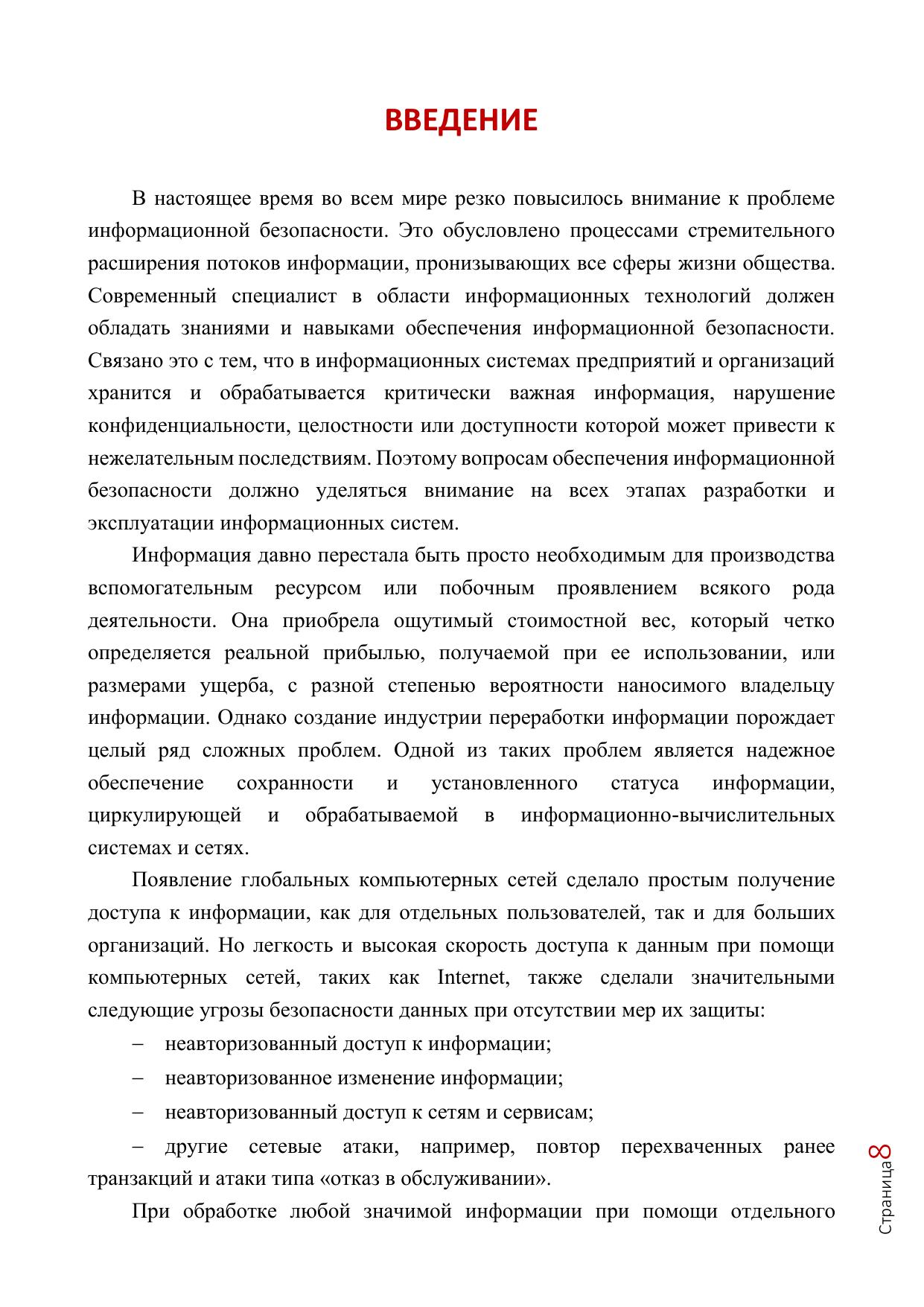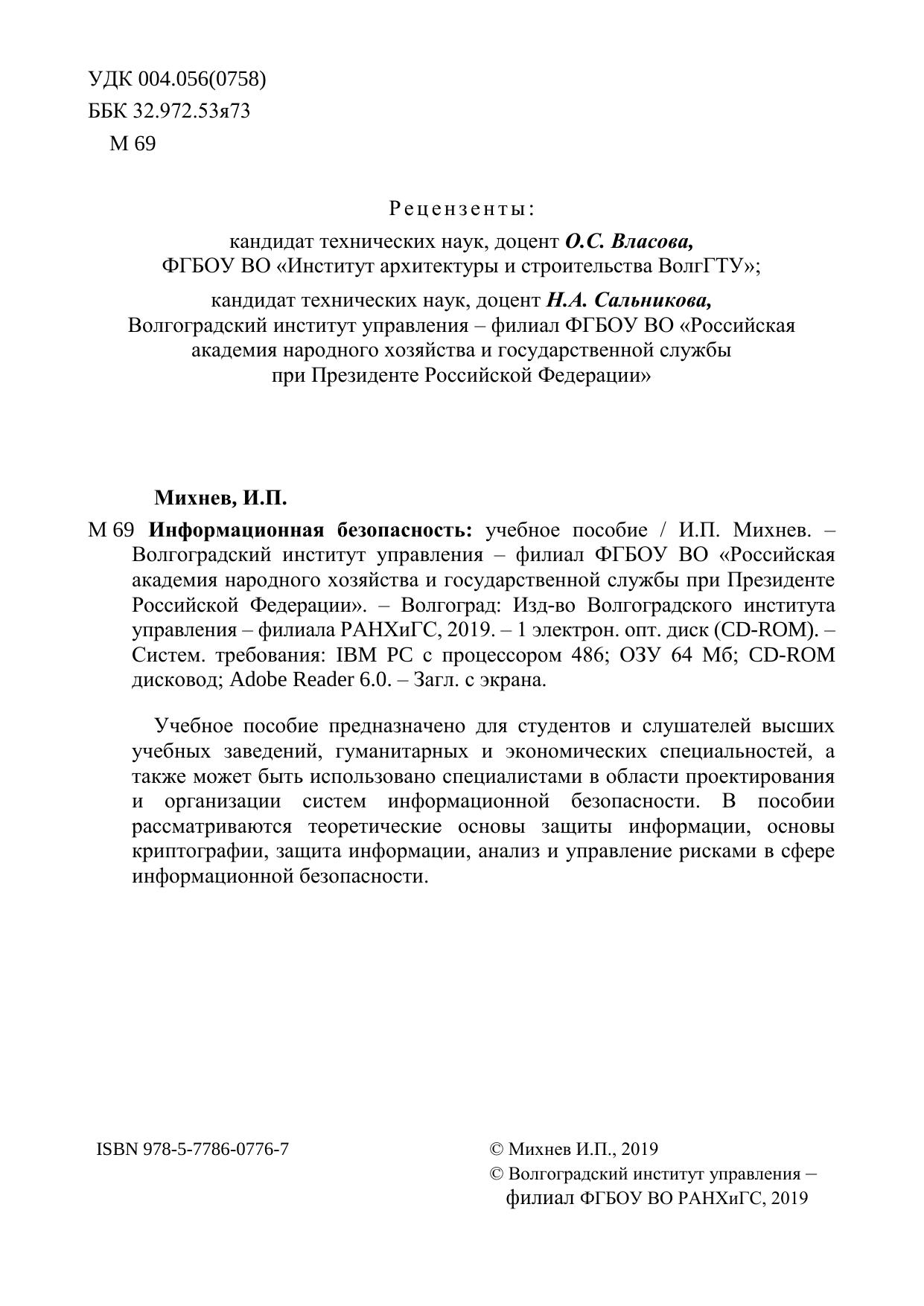 Учебное пособие предназначено для студентов и слушателей высших учебных заведений, гуманитарных и экономических специальностей, а также может быть использовано специалистами в области проектирования и организации систем информационной безопасности. В пособии рассматриваются теоретические основы защиты информации, основы криптографии, защита информации, анализ и управление рисками в сфере информационной безопасности.