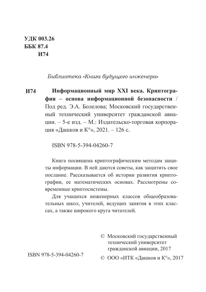 Книга посвящена криптографическим методам защиты информации. В ней даются советы, как защитить свое послание. Рассказывается об истории развития криптографии, ее математических основах. Рассмотрены современные криптосистемы. Для учащихся инженерных классов общеобразовательных школ, учителей, ведущих занятия в этих классах, а также широкого круга читателей.