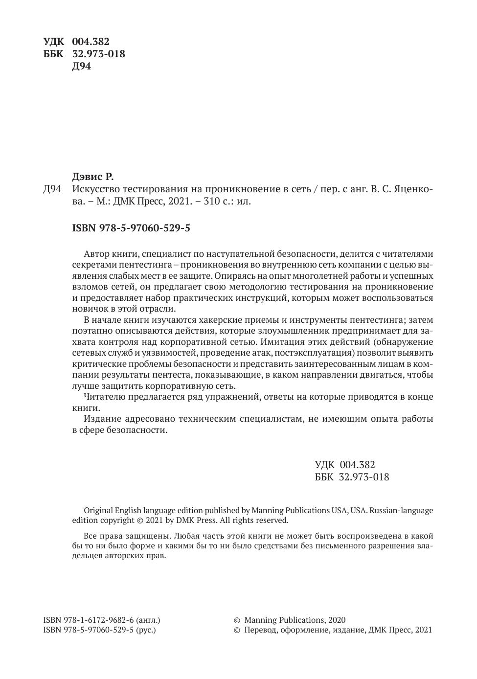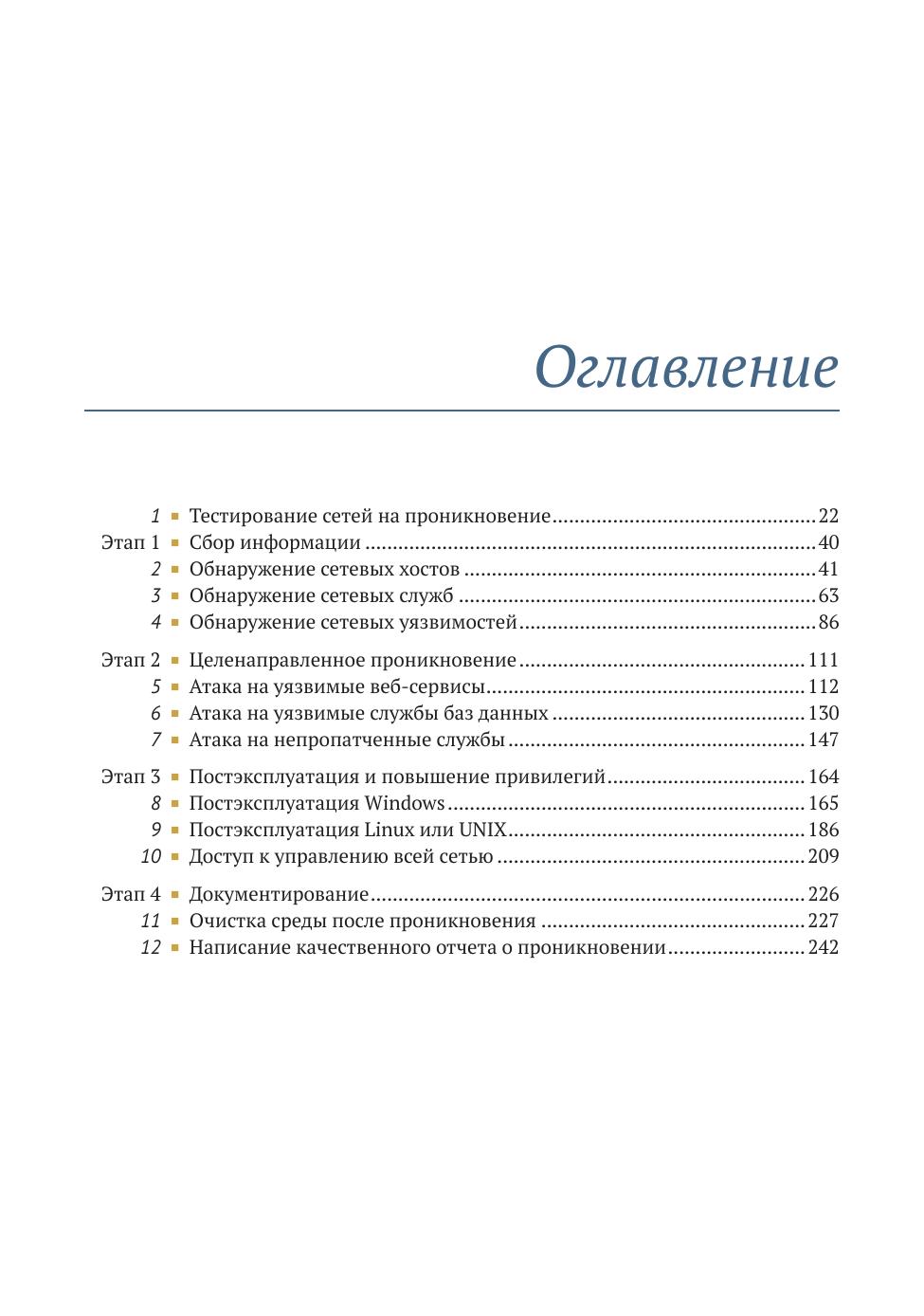 "Искусство тестирования на проникновение в сеть" – это руководство по моделированию недостатков внутренней безопасности компании. В роли злоумышленника вы пройдете все этапы профессионального пентеста, от сбора информации до захвата полного контроля над сетью. Подбирая пароли, обнаруживая открытые порты и повышая права доступа до уровня администратора, вы на практике усвоите, в чем заключаются сетевые уязвимости и как ими воспользоваться.