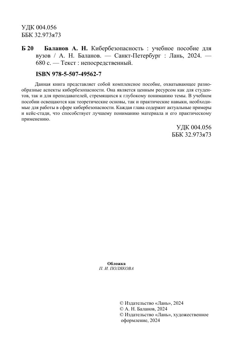 Данная книга представляет собой комплексное пособие, охватывающее разнообразные аспекты кибербезопасности. Она является ценным ресурсом как для студентов, так и для преподавателей, стремящихся к глубокому пониманию темы. В учебном пособии освещаются как теоретические основы, так и практические навыки, необходимые для работы в сфере кибербезопасности. Каждая глава содержит актуальные примеры и кейс-стади, что способствует лучшему пониманию материала и его практическому применению.