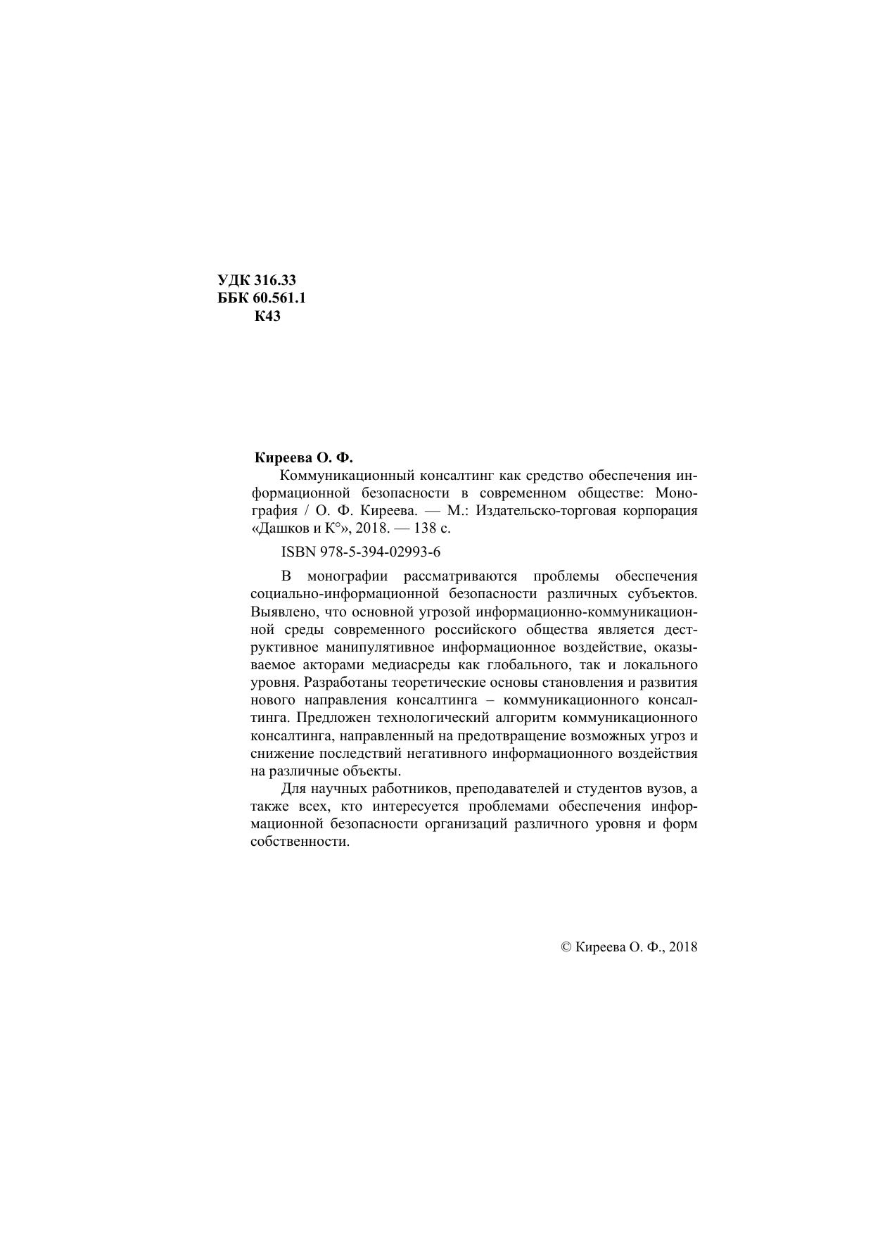В монографии рассматриваются проблемы обеспечения социально-информационной безопасности различных субъектов. Выявлено, что основной угрозой информационно-коммуникационной среды современного российского общества является деструктивное манипулятивное информационное воздействие, оказываемое акторами медиасреды как глобального, так и локального уровня. Разработаны теоретические основы становления и развития нового направления консалтинга – коммуникационного консалтинга. Предложен технологический алгоритм коммуникационного консалтинга, направленный на предотвращение возможных угроз и снижение последствий негативного информационного воздействия на различные объекты. Для научных работников, преподавателей и студентов вузов, а также всех, кто интересуется проблемами обеспечения информационной безопасности организаций различного уровня и форм собственности.