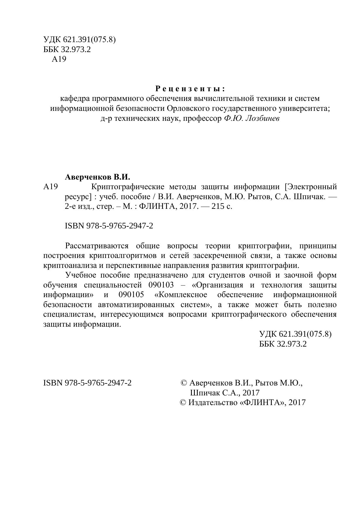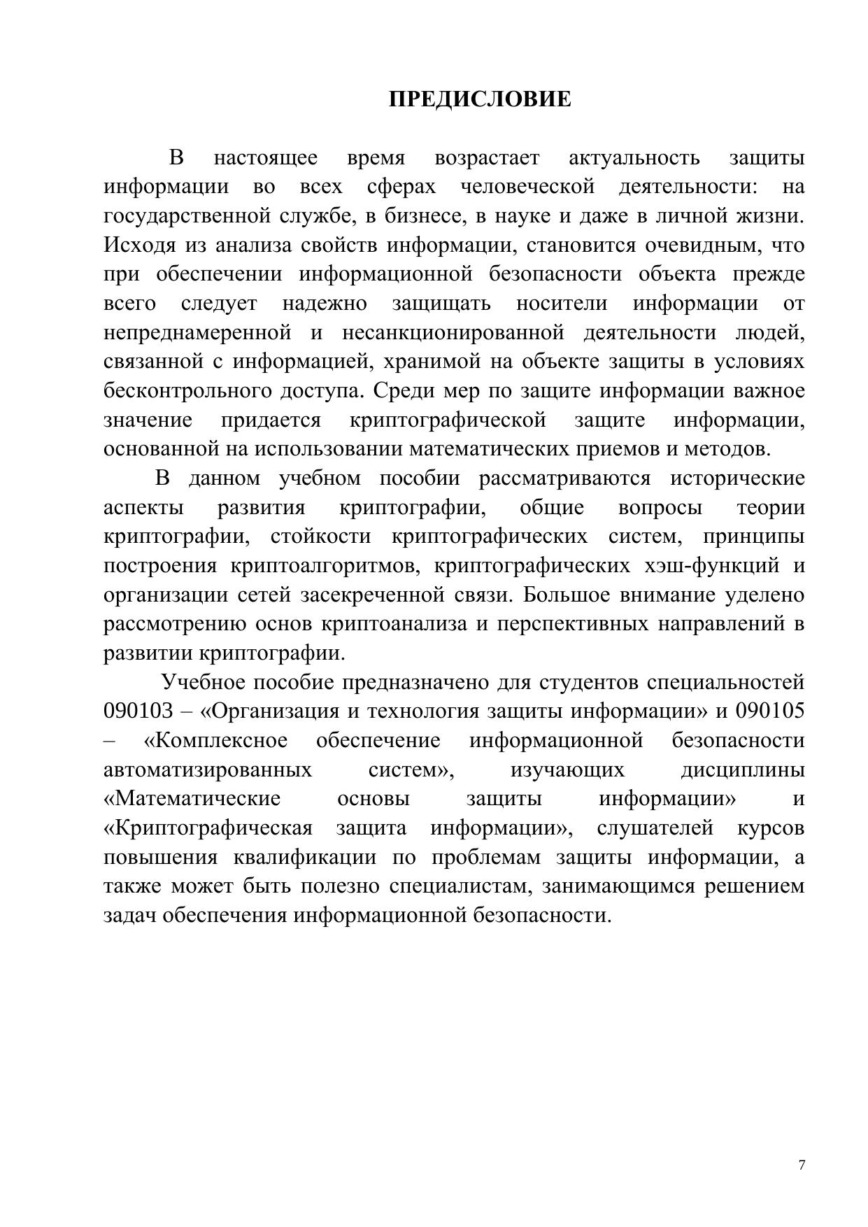 Рассматриваются общие вопросы теории криптографии, принципы построения криптоалгоритмов и сетей засекреченной связи, а также основы криптоанализа и перспективные направления развития криптографии. Учебное пособие предназначено для студентов очной и заочной форм обучения специальностей 090103 – «Организация и технология защиты информации» и 090105 «Комплексное обеспечение информационной безопасности автоматизированных систем», а также может быть полезно