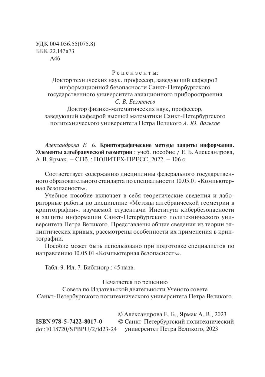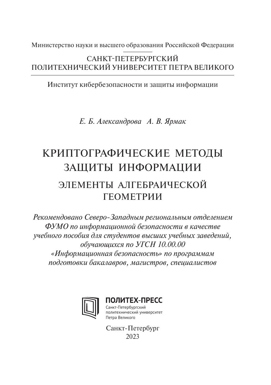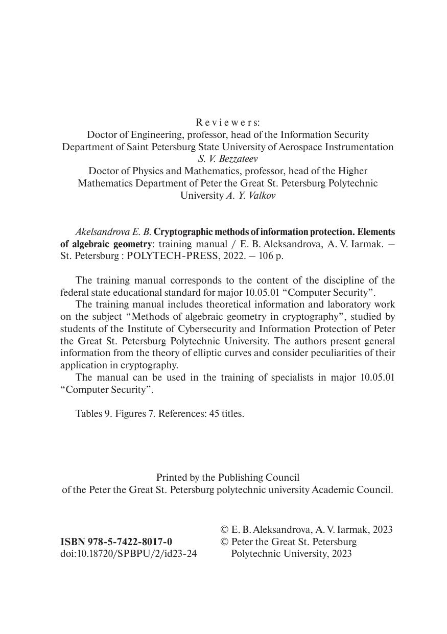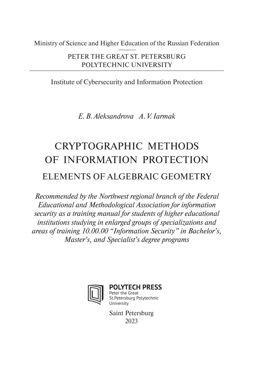 Соответствует содержанию дисциплины федерального государственного образовательного стандарта по специальности 10.05.01 «Компьютерная безопасность». Учебное пособие включает в себя теоретические сведения и лабораторные работы по дисциплине «Методы алгебраической геометрии в криптографии», изучаемой студентами Института кибербезопасности и защиты информации Санкт-Петербургского политехнического университета Петра Великого. Представлены общие сведения из теории эллиптических кривых, рассмотрены особенности их применения в криптографии. Пособие может быть использовано при подготовке специалистов по направлению 10.05.01 «Компьютерная безопасность».