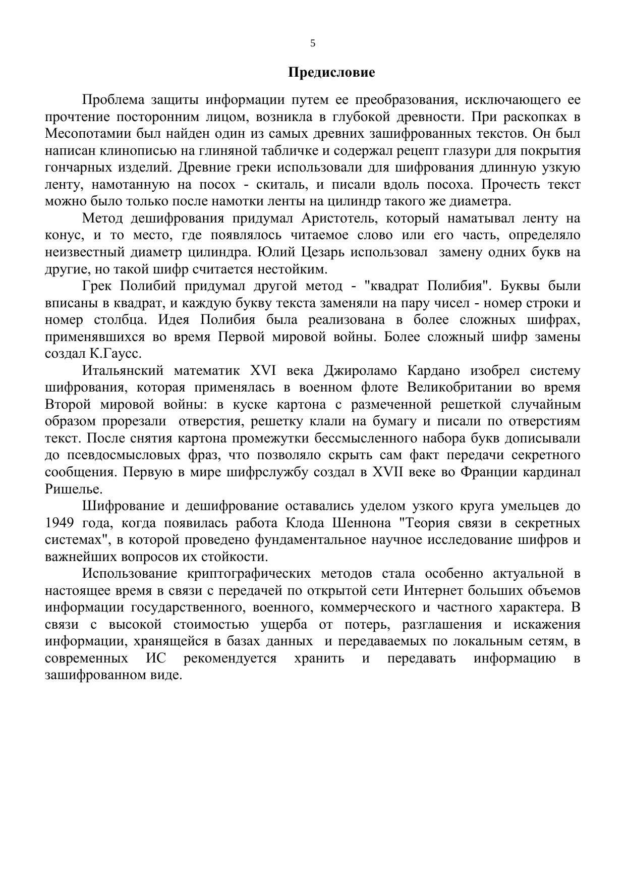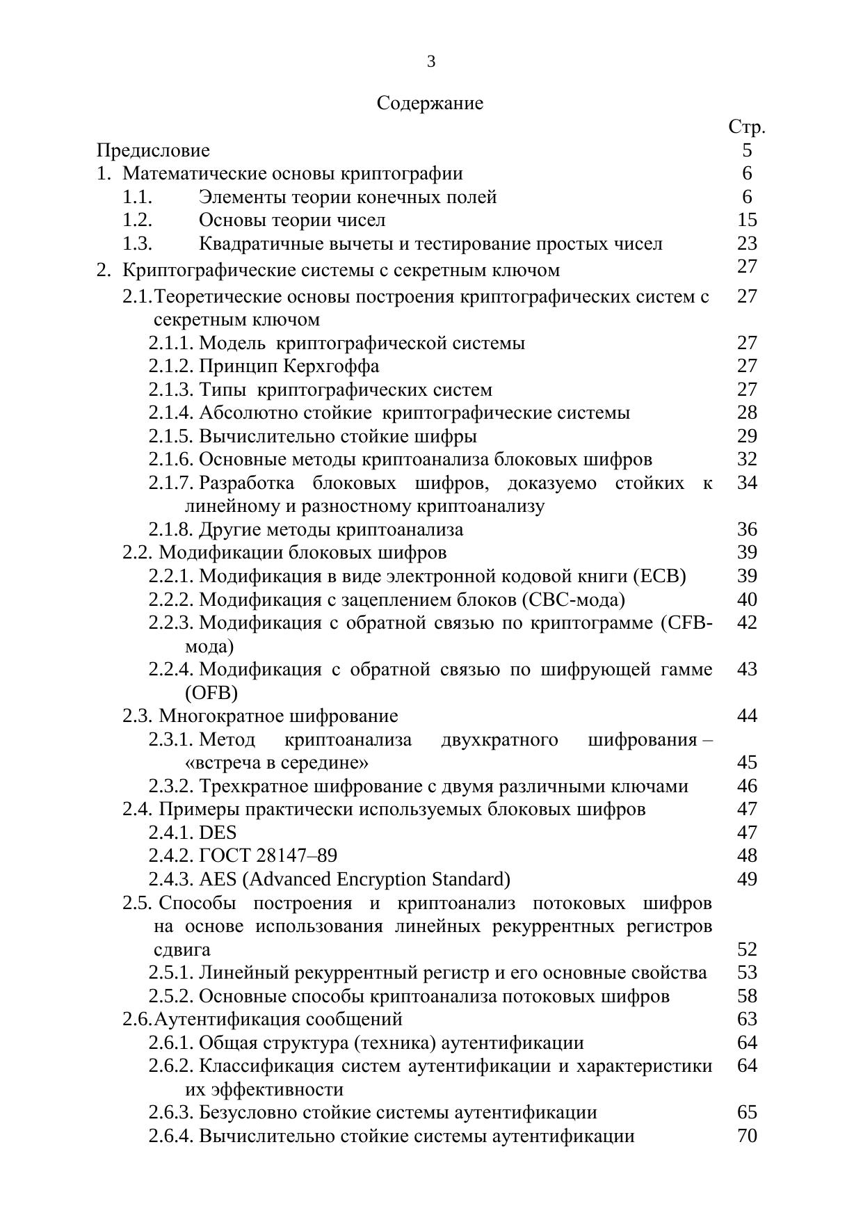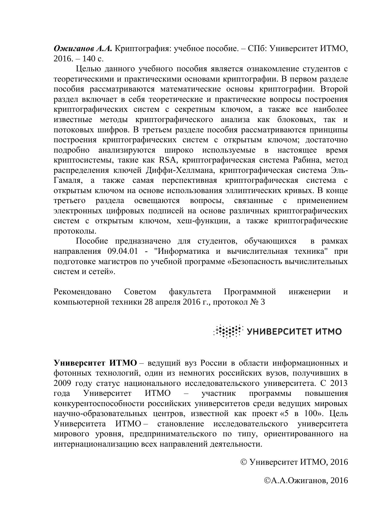 Целью данного учебного пособия является ознакомление студентов с теоретическими и практическими основами криптографии. В первом разделе пособия рассматриваются математические основы криптографии. Второй раздел включает в себя теоретические и практические вопросы построения криптографических систем с секретным ключом, а также все наиболее известные методы криптографического анализа как блоковых, так и потоковых шифров. В третьем разделе пособия рассматриваются принципы построения криптографических систем с открытым ключом; достаточно подробно анализируются широко используемые в настоящее время криптосистемы, такие как RSA, криптографическая система Рабина, метод распределения ключей Диффи-Хеллмана, криптографическая система Эль-Гамаля, а также самая перспективная криптографическая система с открытым ключом на основе использования эллиптических кривых. В конце третьего раздела освещаются вопросы, связанные с применением электронных цифровых подписей на основе различных криптографических систем с открытым ключом, хеш-функции, а также криптографические протоколы.