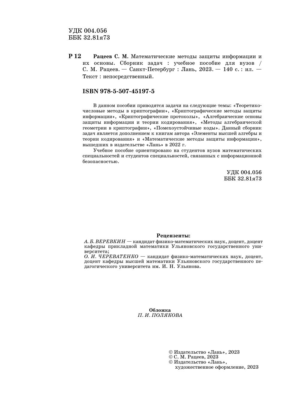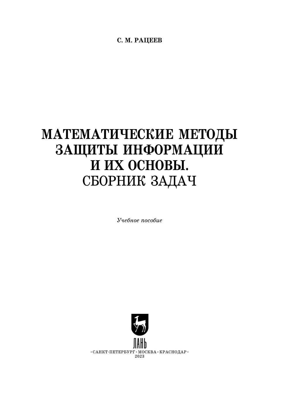 В данном пособии приводятся задачи на следующие темы: «Теоретико-числовые методы в криптографии», «Криптографические методы защиты информации», «Криптографические протоколы», «Алгебраические основы защиты информации и теории кодирования», «Методы алгебраической геометрии в криптографии», «Помехоустойчивые коды». Данный сборник задач является дополнением к книгам автора «Элементы высшей алгебры и теории кодирования» и «Математические методы защиты информации», вышедших в издательстве «Лань» в 2022 г. Учебное пособие ориентировано на студентов вузов математических специальностей и студентов специальностей, связанных с информационной безопасностью.