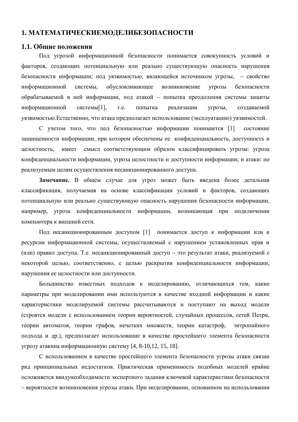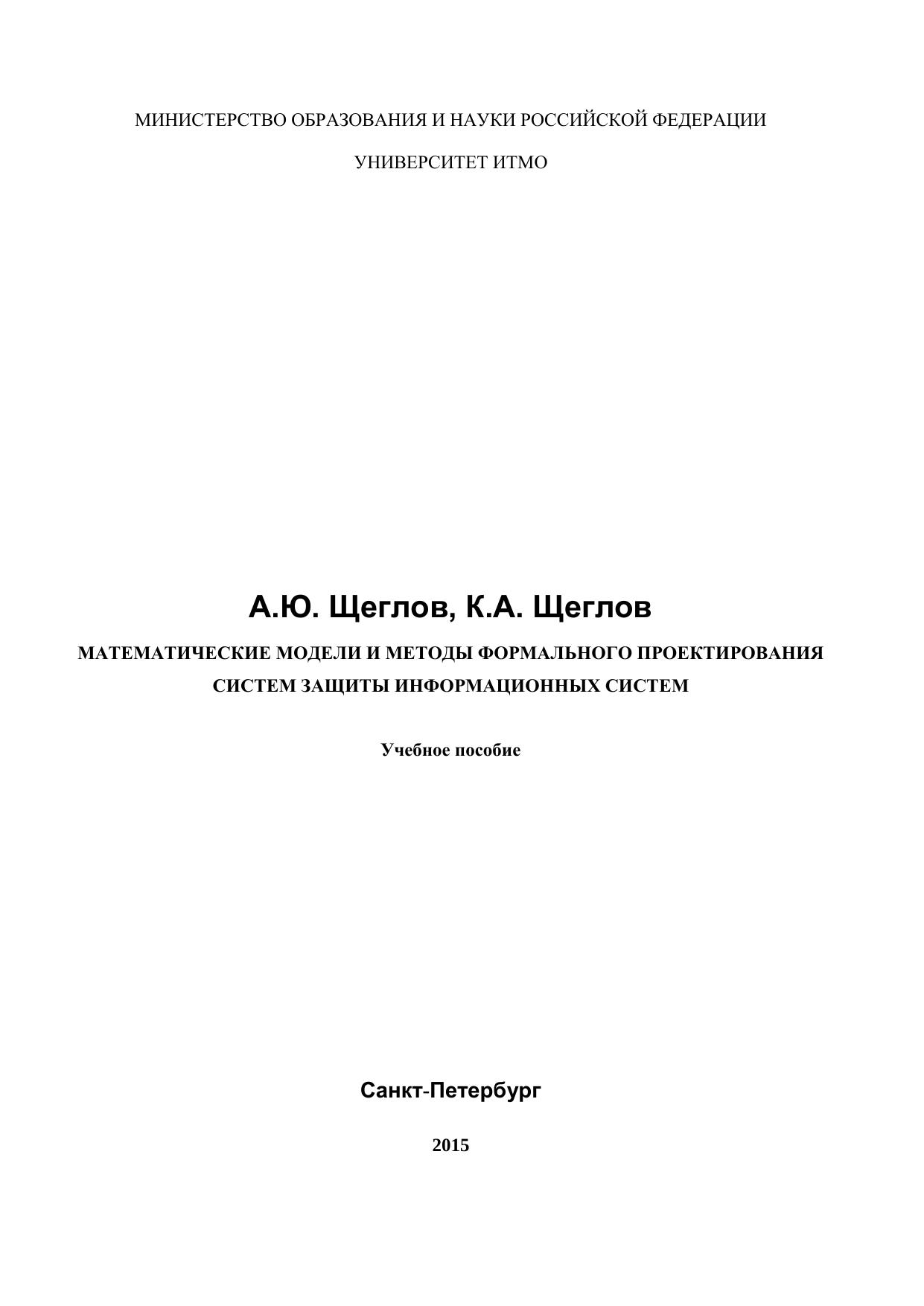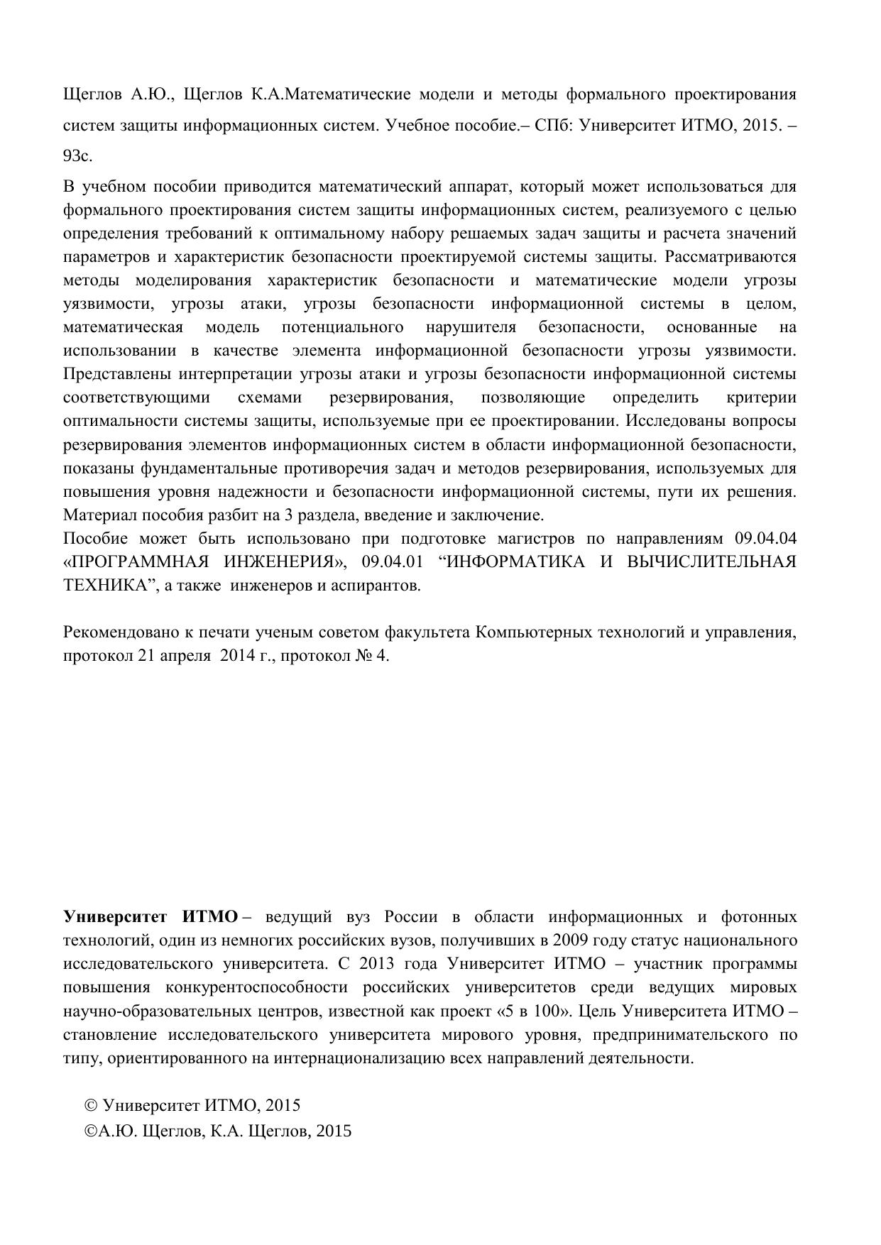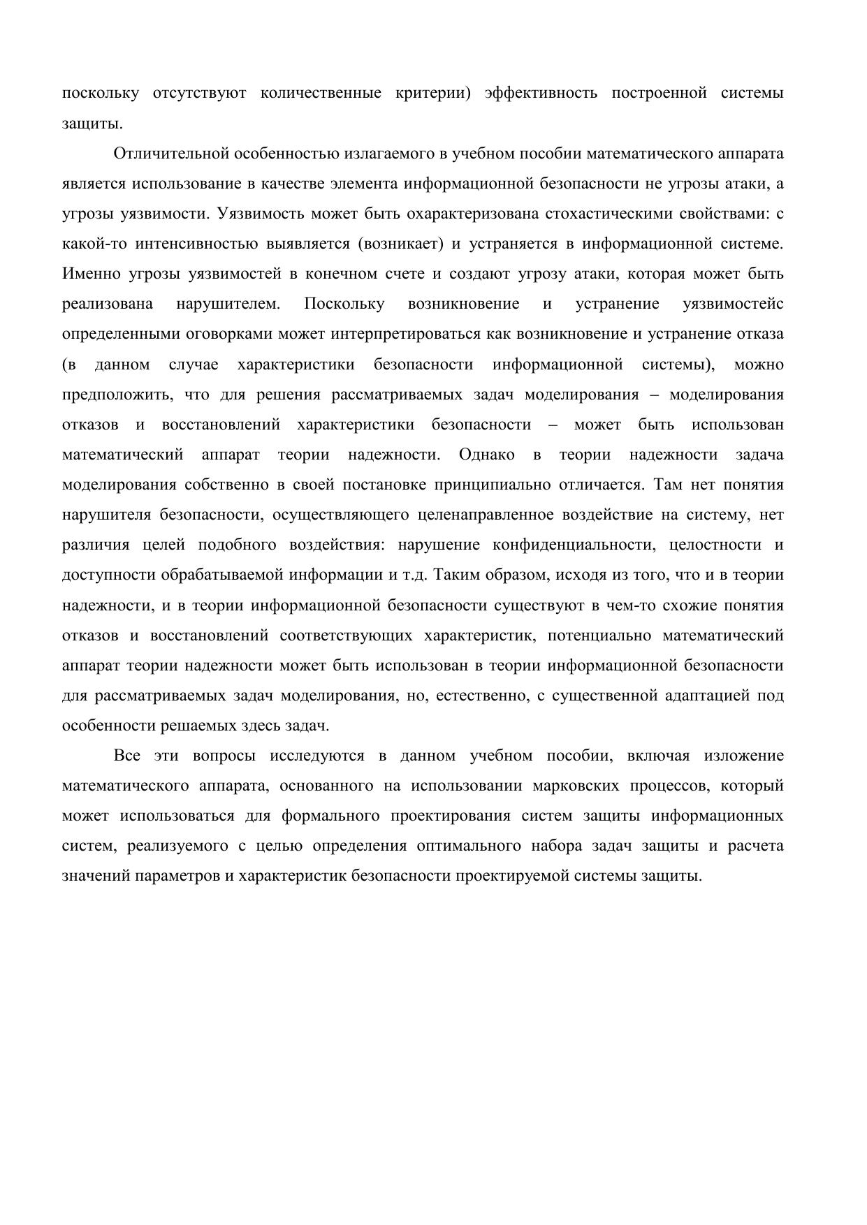 В учебном пособии приводится математический аппарат, который может использоваться для формального проектирования систем защиты информационных систем, реализуемого с целью определения требований к оптимальному набору решаемых задач защиты и расчета значений параметров и характеристик безопасности проектируемой системы защиты. Рассматриваются методы моделирования характеристик безопасности и математические модели угрозы уязвимости, угрозы атаки, угрозы безопасности информационной системы в целом, математическая модель потенциального нарушителя безопасности, основанные на использовании в качестве элемента информационной безопасности угрозы уязвимости. Представлены интерпретации угрозы атаки и угрозы безопасности информационной системы соответствующими схемами резервирования, позволяющие определить критерии оптимальности системы защиты, используемые при ее проектировании. Исследованы вопросы резервирования элементов информационных систем в области информационной безопасности, показаны фундаментальные противоречия задач и методов резервирования, используемых для повышения уровня надежности и безопасности информационной системы, пути их решения. Материал пособия разбит на 3 раздела, введение и заключение. Пособие может быть использовано при подготовке магистров по направлениям 09.04.04 «Программная инженерия», 09.04.01 "Информатика и вычислительная техника", а также инженеров и аспирантов.