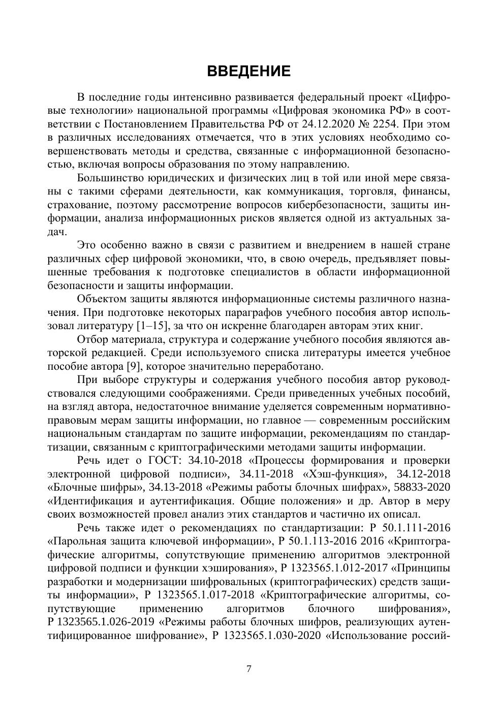 Содержится теоретический и практический материал по дисциплине «Методы и средства защиты информации», состоящий из шести разделов: «Введение в методы и средства защиты информации», «Управление информационной безопасностью и рисками», «Организационно-правовые меры по защите информации», «Криптографические методы защиты конфиденциальности и целостности электронных документов», «Криптографические методы защиты электронного документооборота», «Методы управления доступом и технологии аутентификации». Особенностью данного учебного пособия является изложение методов и средств защиты информации, включая криптографические методы на основе современных российских национальных стандартов, рекомендаций по стандартизации и современной нормативно-правовой базы, которые в меньшей степени рассматриваются в опубликованных учебных пособиях. Рекомендуется студентам, обучающимся по программам специалитета, бакалавриата и магистратуры различных форм обучения, которые изучают дисциплины, связанные с защитой информации, а также практикующим специалистам в области кибербезопасности и информационной безопасности.