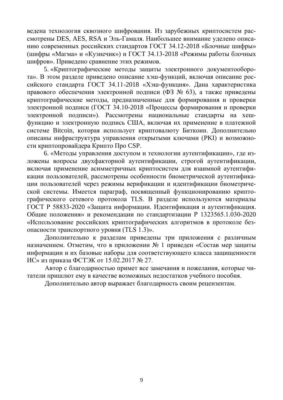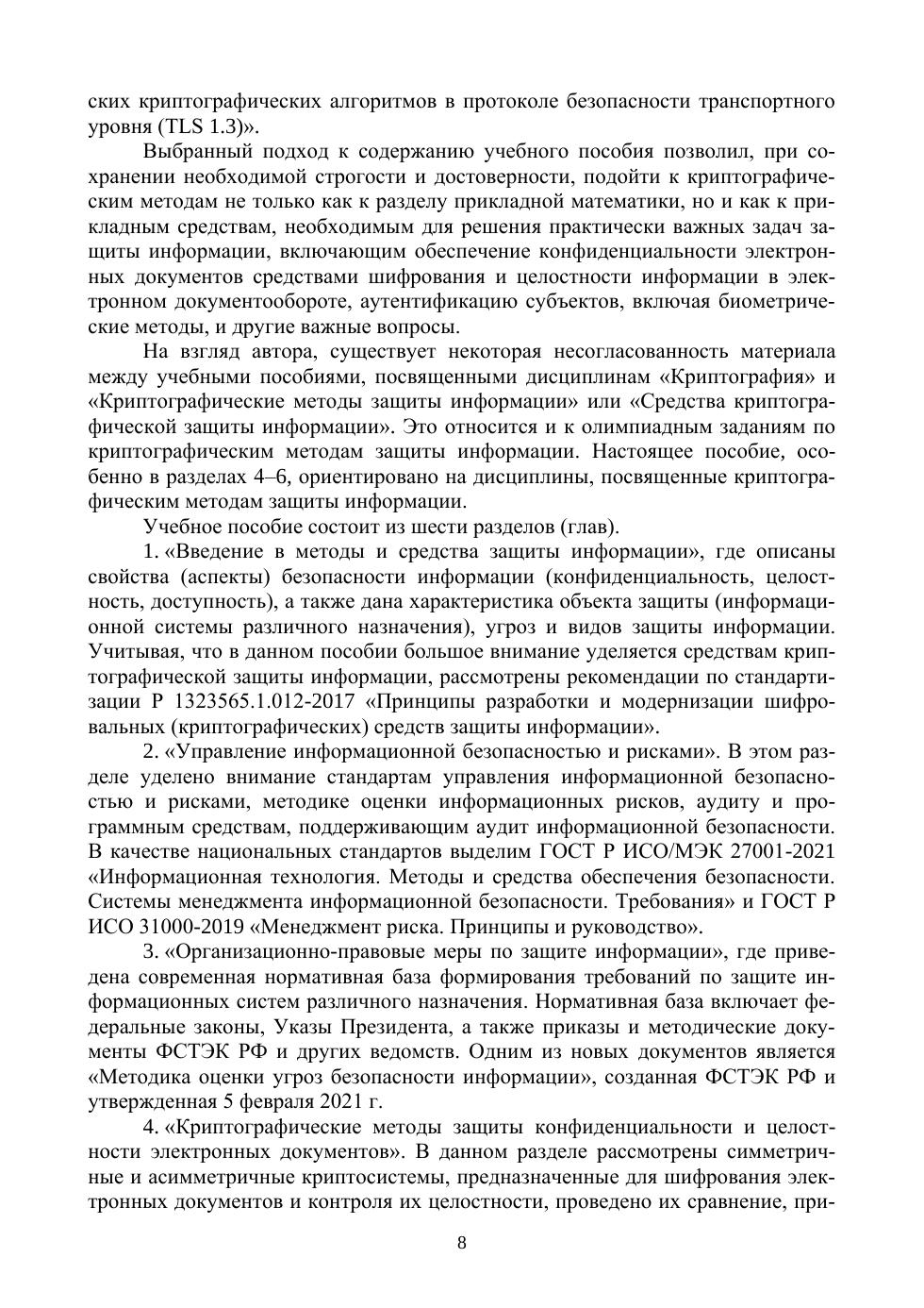 Содержится теоретический и практический материал по дисциплине «Методы и средства защиты информации», состоящий из шести разделов: «Введение в методы и средства защиты информации», «Управление информационной безопасностью и рисками», «Организационно-правовые меры по защите информации», «Криптографические методы защиты конфиденциальности и целостности электронных документов», «Криптографические методы защиты электронного документооборота», «Методы управления доступом и технологии аутентификации». Особенностью данного учебного пособия является изложение методов и средств защиты информации, включая криптографические методы на основе современных российских национальных стандартов, рекомендаций по стандартизации и современной нормативно-правовой базы, которые в меньшей степени рассматриваются в опубликованных учебных пособиях. Рекомендуется студентам обучающимся по направлениям подготовки высшего образования, которые изучают дисциплины, связанные с защитой информации, а также практикующим специалистам в области кибербезопасности и информационной безопасности.