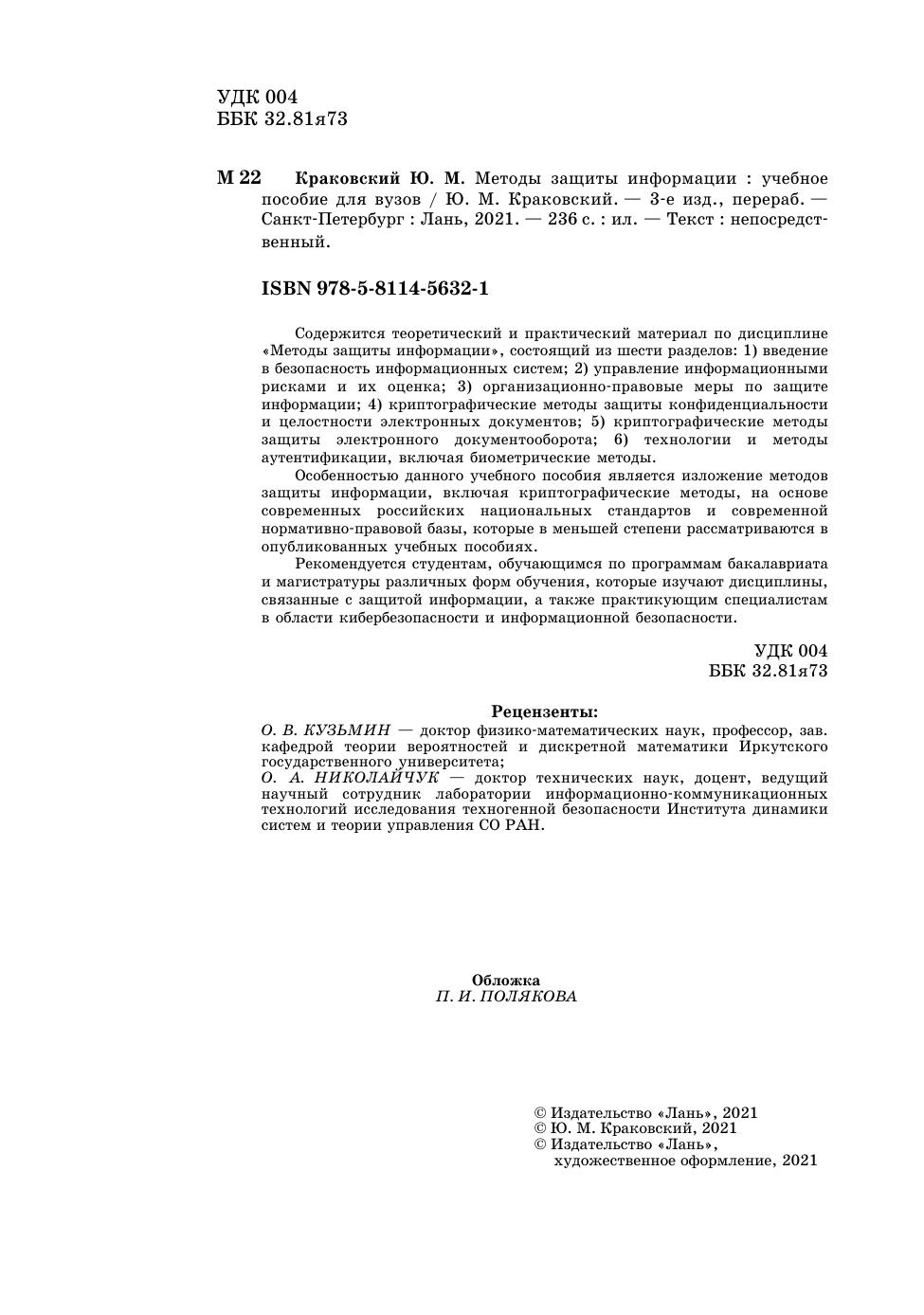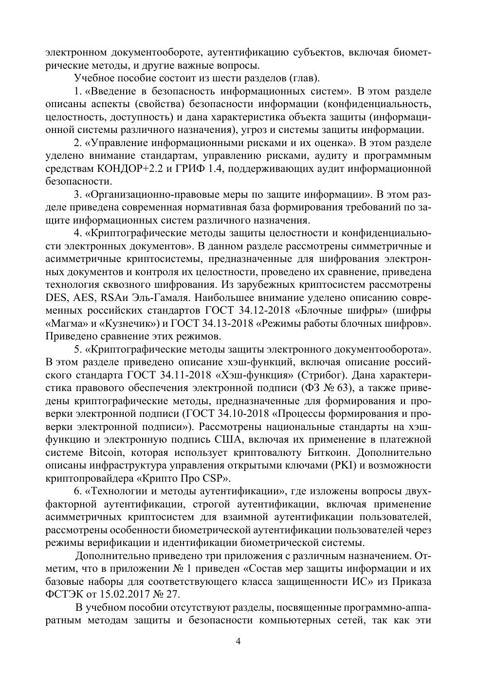 Особенностью данного учебного пособия является изложение методов защи-ты информации, включая криптографические методы, на основе современных российских национальных стандартов и современной нормативно-правовой базы, которые в меньшей степени рассматриваются в опубликованных учебных пособи-ях.