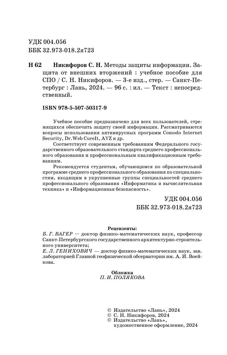 Учебное пособие предназначено для всех пользователей, стремящихся обеспечить защиту своей информации. Рассматриваются вопросы использования антивирусных программ Comodo Internet Security, Dr.Web CureIt, AVZ и другие.Рекомендуется студентам, обучающимся по образовательной программе среднего профессионального образования по специальностям, входящим в укрупненные группы специальностей среднего профессионального образования «Информатика и вычислительная техника» и «Информационная безопасность». Соответствует современным требованиям Федерального государственного образовательного стандарта среднего профессионального образования и профессиональным квалификационным требованиям.