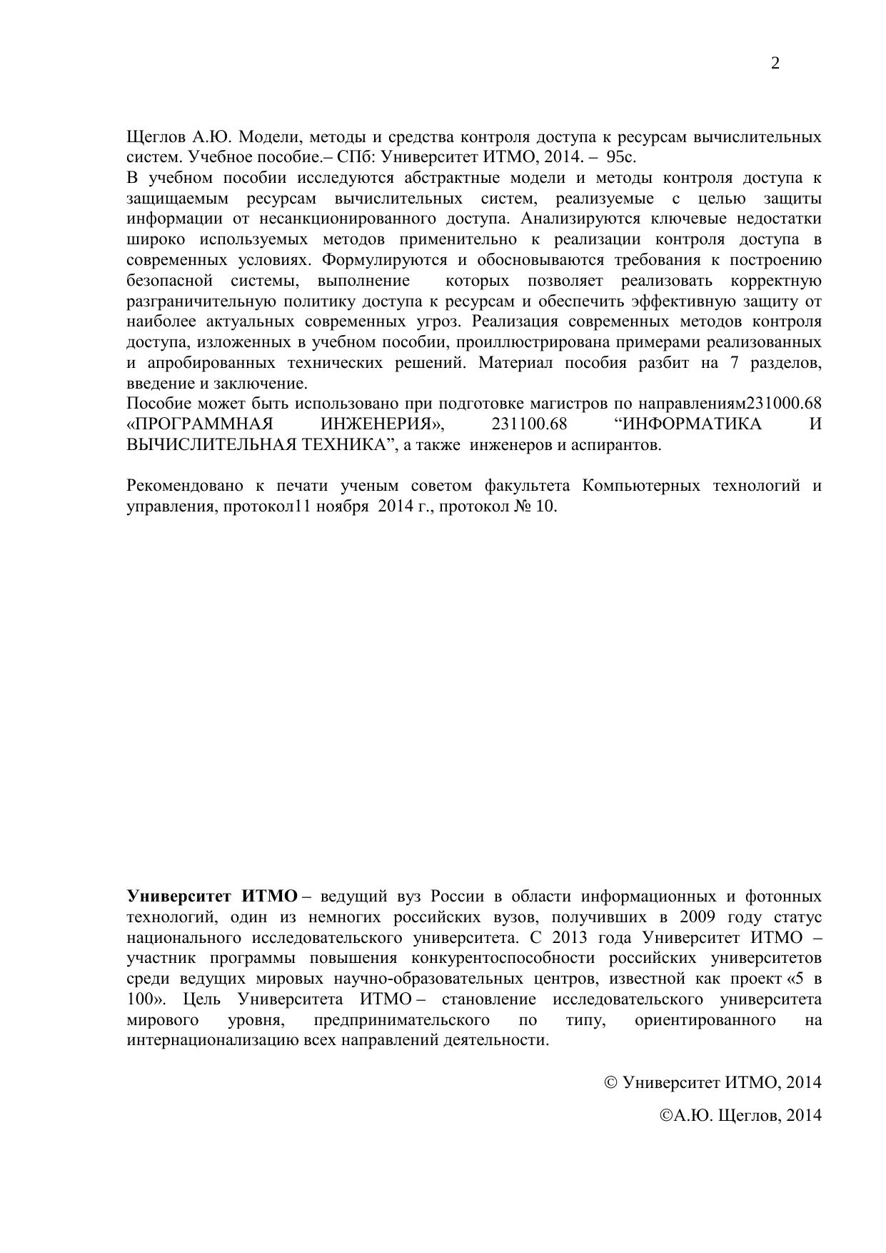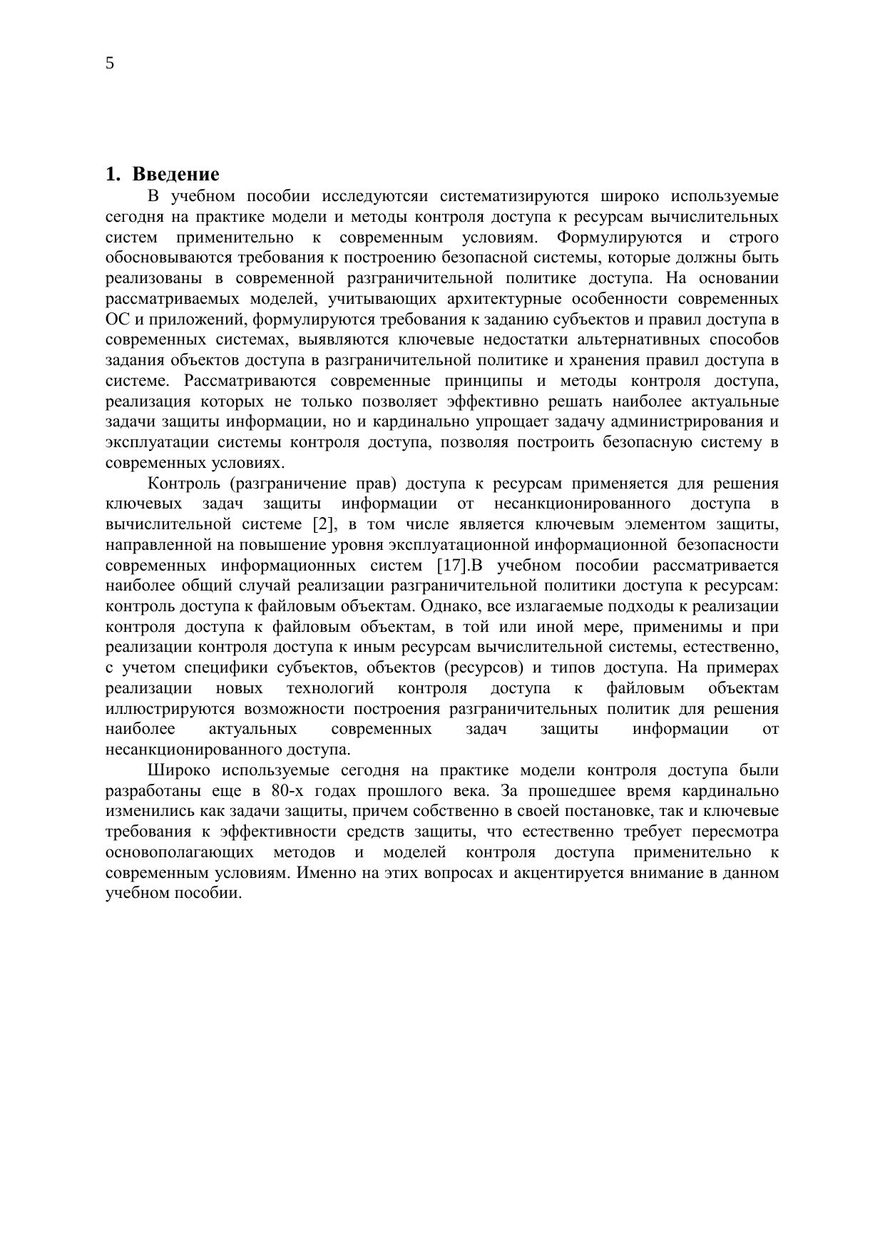 В учебном пособии исследуются абстрактные модели и методы контроля доступа к защищаемым ресурсам вычислительных систем, реализуемые с целью защиты информации от несанкционированного доступа. Анализируются ключевые недостаткишироко используемых методов применительно к реализации контроля доступа в современных условиях. Формулируются и обосновываются требования к построению безопасной системы, выполнение которых позволяет реализовать корректнуюразграничительную политику доступа к ресурсам и обеспечить эффективную защиту от наиболее актуальных современных угроз. Реализация современных методов контроля доступа, изложенных в учебном пособии, проиллюстрирована примерами реализованных и апробированных технических решений. Материал пособия разбит на 7 разделов, введение и заключение. Пособие может быть использовано при подготовке магистров по направлениям 231000.68 «Программная инженерия», 231100.68 "Информатика и вычислительная техника", а также инженеров и аспирантов.