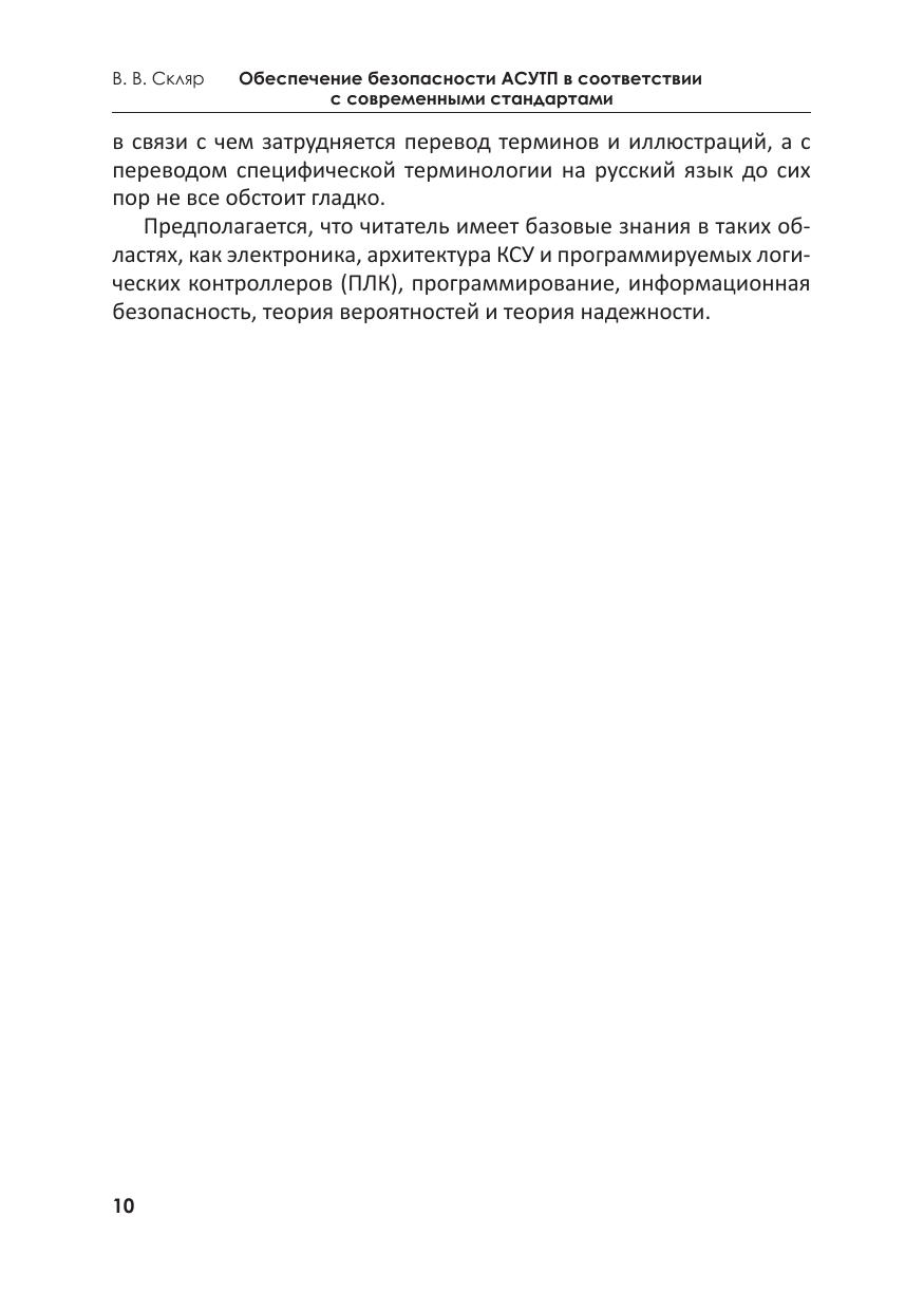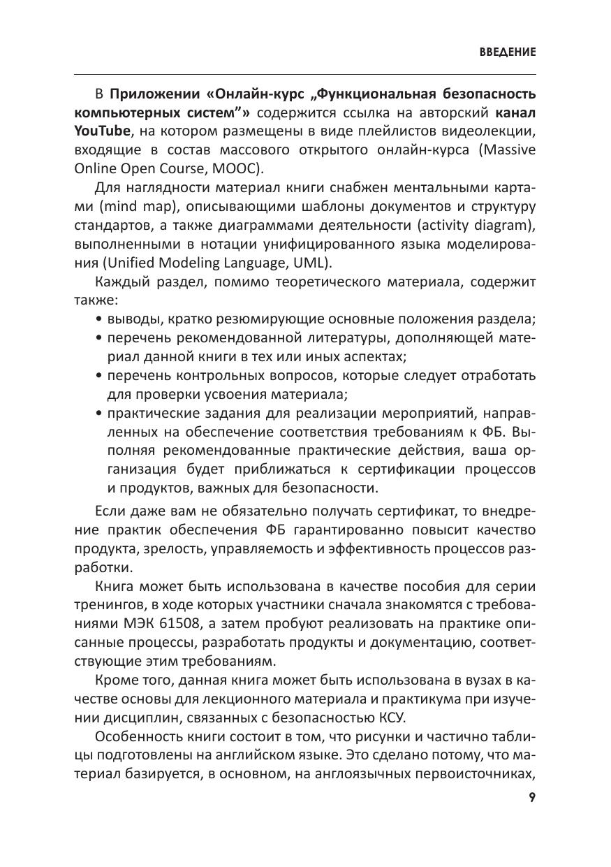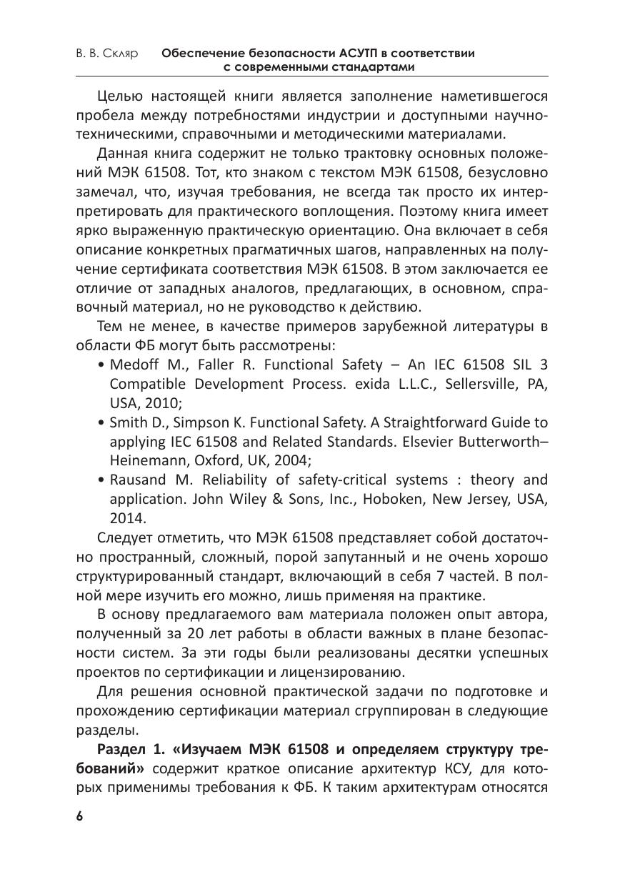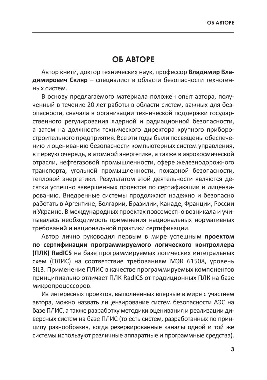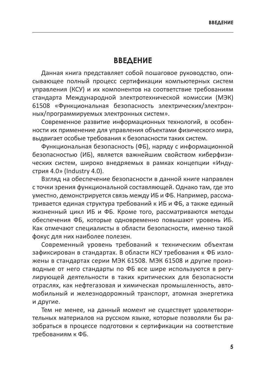 Подробно рассмотрены требования к безопасности АСУТП международного стандарта МЭК 61508 «Функциональная безопасность систем электрических, электронных, программируемых электронных, связанных с безопасностью», дана их интерпретация для практического воплощения. Последовательно раскрыты конкретные шаги, необходимые для получения сертификата соответствия МЭК 61508. Особое внимание уделено подготовке к сертификации, в том числе определению объекта сертификации, проектной инфраструктуры, плана и сметы затрат на выполнение работ. Рассмотрены требования стандарта, относящиеся к управлению безопасностью, предложены методы ее количественного оценивания и меры по ее обеспечению. Отдельно разобраны вопросы сертификации ПЛИС и применения методологии Assurance Case. Дан набор упражнений для закрепления навыков в области обеспечения и оценивания функциональной безопасности.