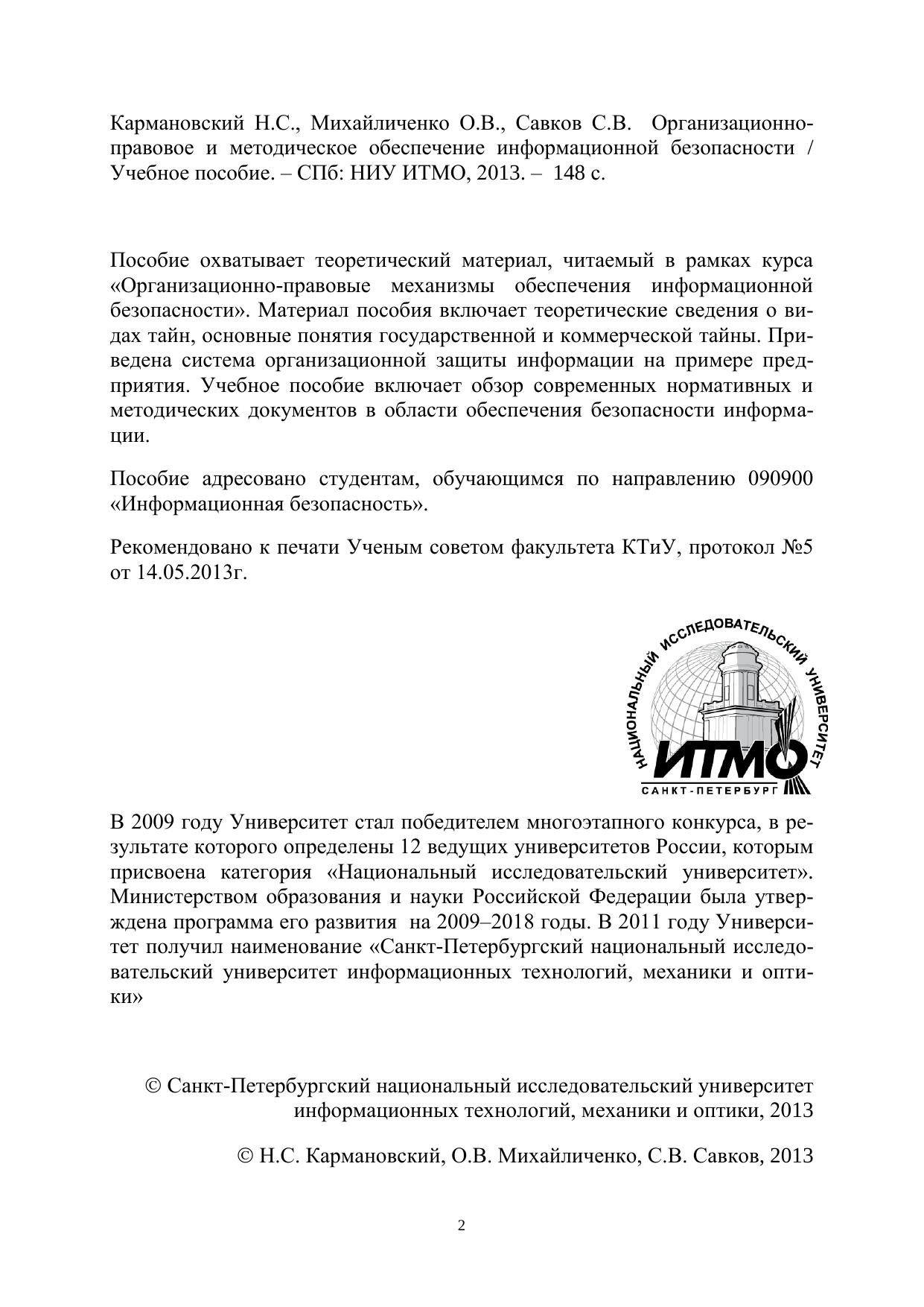 Пособие охватывает теоретический материал, читаемый в рамках курса «Организационно-правовые механизмы обеспечения информационной безопасности». Материал пособия включает теоретические сведения о видах тайн, основные понятия государственной и коммерческой тайны. Приведена система организационной защиты информации на примере предприятия. Учебное пособие включает обзор современных нормативных и методических документов в области обеспечения безопасности информации.