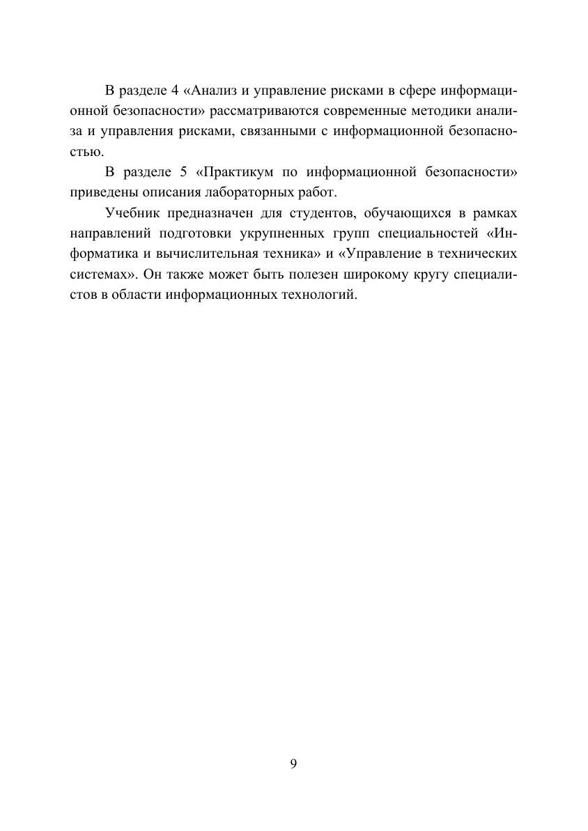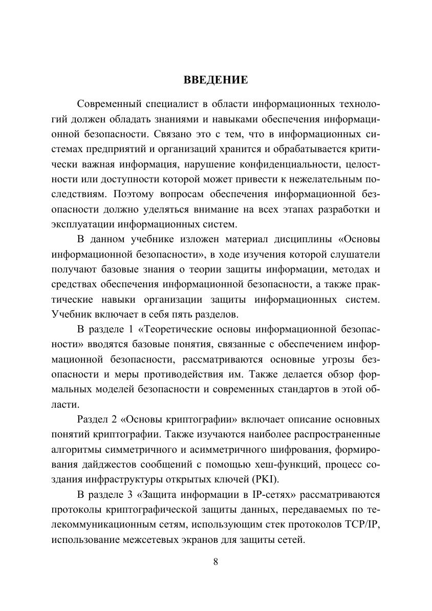 В учебнике системно излагаются теоретические основы информационной безопасности и описываются практические аспекты, связанные с их реализацией. Рассматриваются теоретические основы защиты информации, основы криптографии, защита информации в IP сетях, анализ и управление рисками в сфере информационной безопасности. Теоретический материал сопровождается лабораторными работами, выделенными в отдельный раздел. Учебник предназначен для студентов, обучающихся в рамках направлений подготовки укрупненных групп специальностей «Информатика и вычислительная техника» и «Управление в технических системах». Он также может быть полезен широкому кругу специалистов в области информационных технологий.