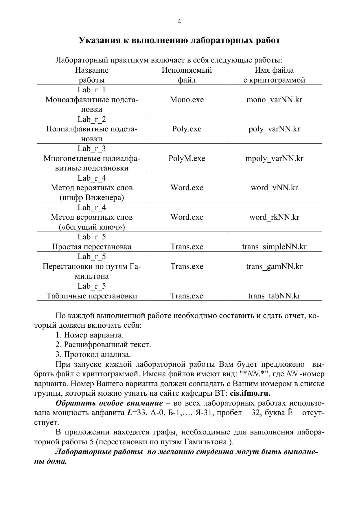 Целью данного учебного пособия является ознакомление студентов с основами криптологии. В пособии рассматриваются традиционные (симметричные) методы шифрования, базирующиеся на шифрах перестановки, шифрах простой и сложной замены, некоторых их модификаций и комбинаций, а также вопросы криптоанализа симметричных шифров. Следует отметить, что комбинации шифров перестановок и шифров замены образуют все многообразие применяемых на практике симметричных шифров. Материал пособия разбит на 5 разделов по числу лабораторных работ. В каждом разделе приведены краткие теоретические сведения и даны методические указания к выполнению соответствующей лабораторной работы. Все лабораторные работы снабжены примерами выполнения.