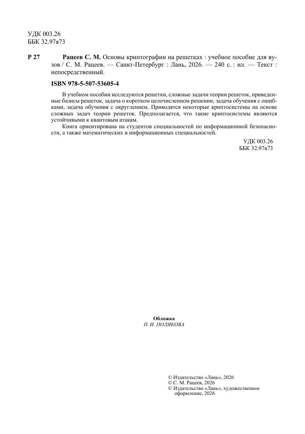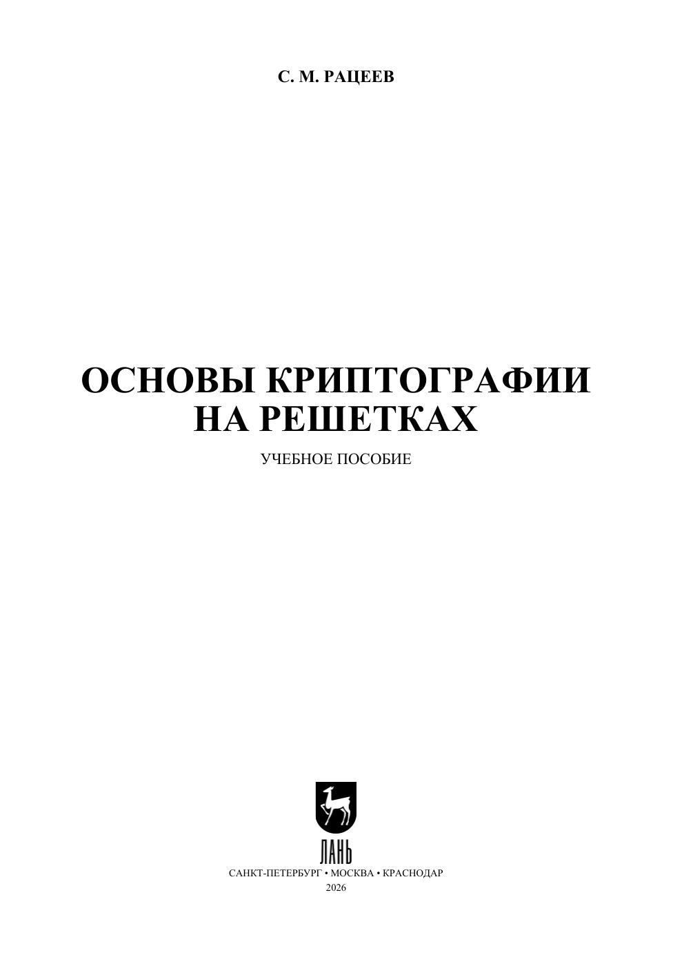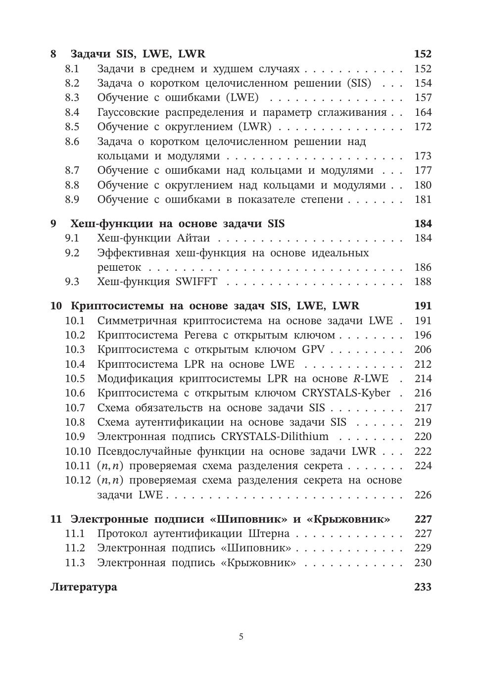 В учебном пособии исследуются решетки, сложные задачи теории решеток, приведенные базисы решеток, задача о коротком целочисленном решении, задача обучения с ошибками, задача обучения с округлением. Приводятся некоторые криптосистемы на основе сложных задач теории решеток. Предполагается, что такие криптосистемы являются устойчивыми к квантовым атакам. Книга ориентирована на студентов специальностей по информационной безопасности, а также математических и информационных специальностей.
