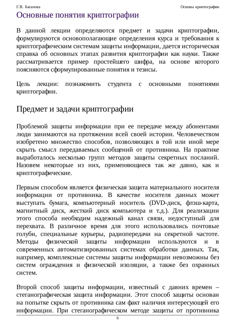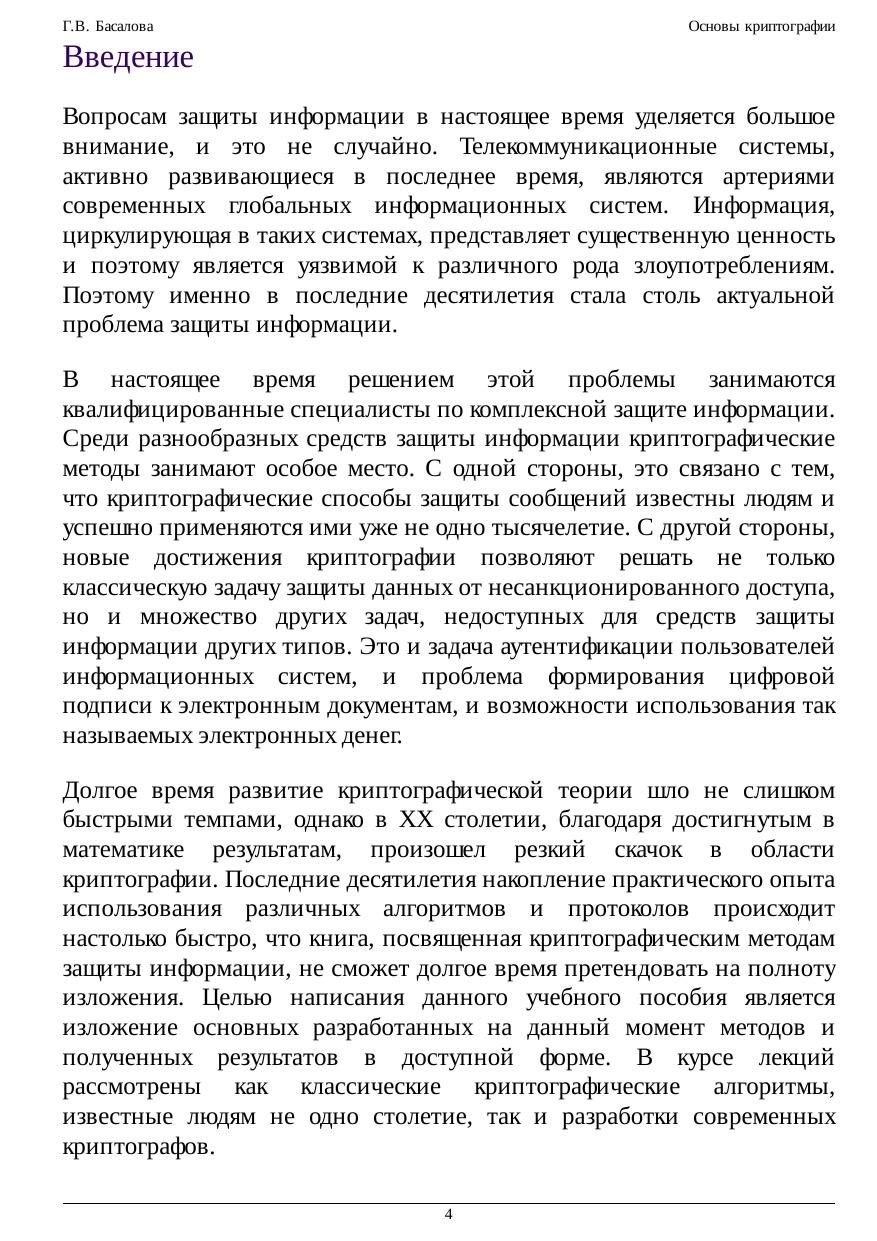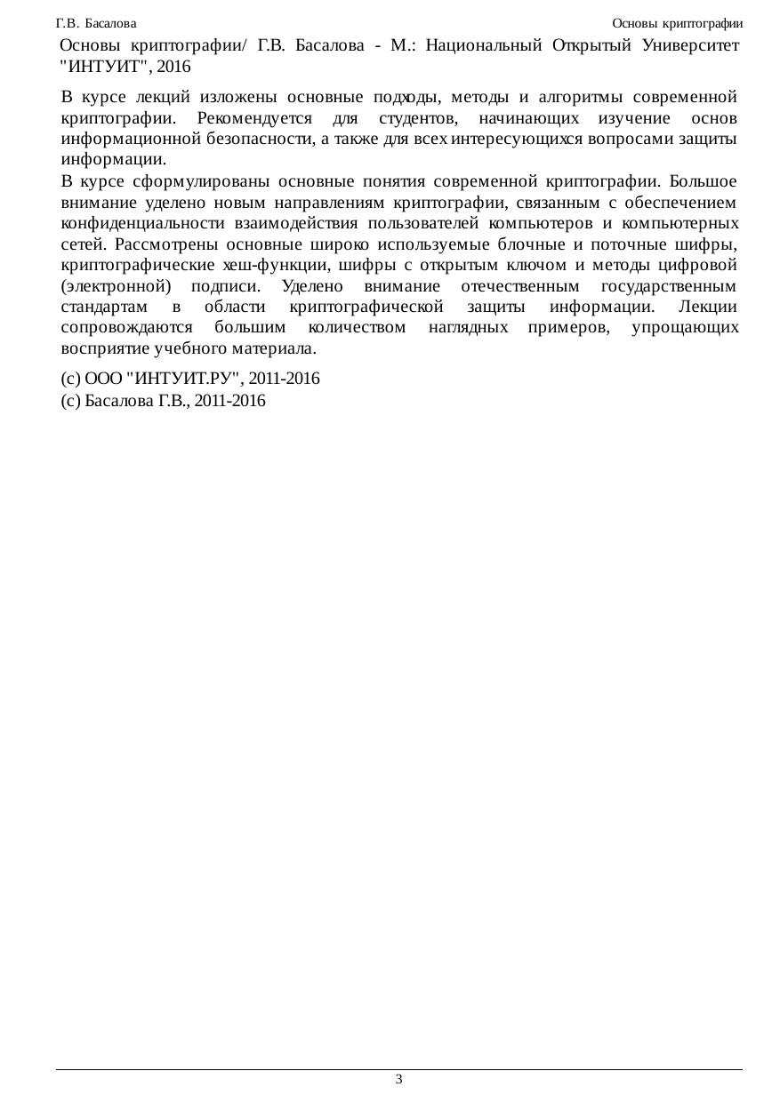 В курсе лекций изложены основные подходы, методы и алгоритмы современной криптографии. Рекомендуется для студентов, начинающих изучение основ информационной безопасности, а также для всех интересующихся вопросами защиты информации. В курсе сформулированы основные понятия современной криптографии. Большое внимание уделено новым направлениям криптографии, связанным с обеспечением конфиденциальности взаимодействия пользователей компьютеров и компьютерных сетей. Рассмотрены основные широко используемые блочные и поточные шифры, криптографические хеш-функции, шифры с открытым ключом и методы цифровой (электронной) подписи. Уделено внимание отечественным государственным стандартам в области криптографической защиты информации. Лекции сопровождаются большим количеством наглядных примеров, упрощающих восприятие учебного материала.
