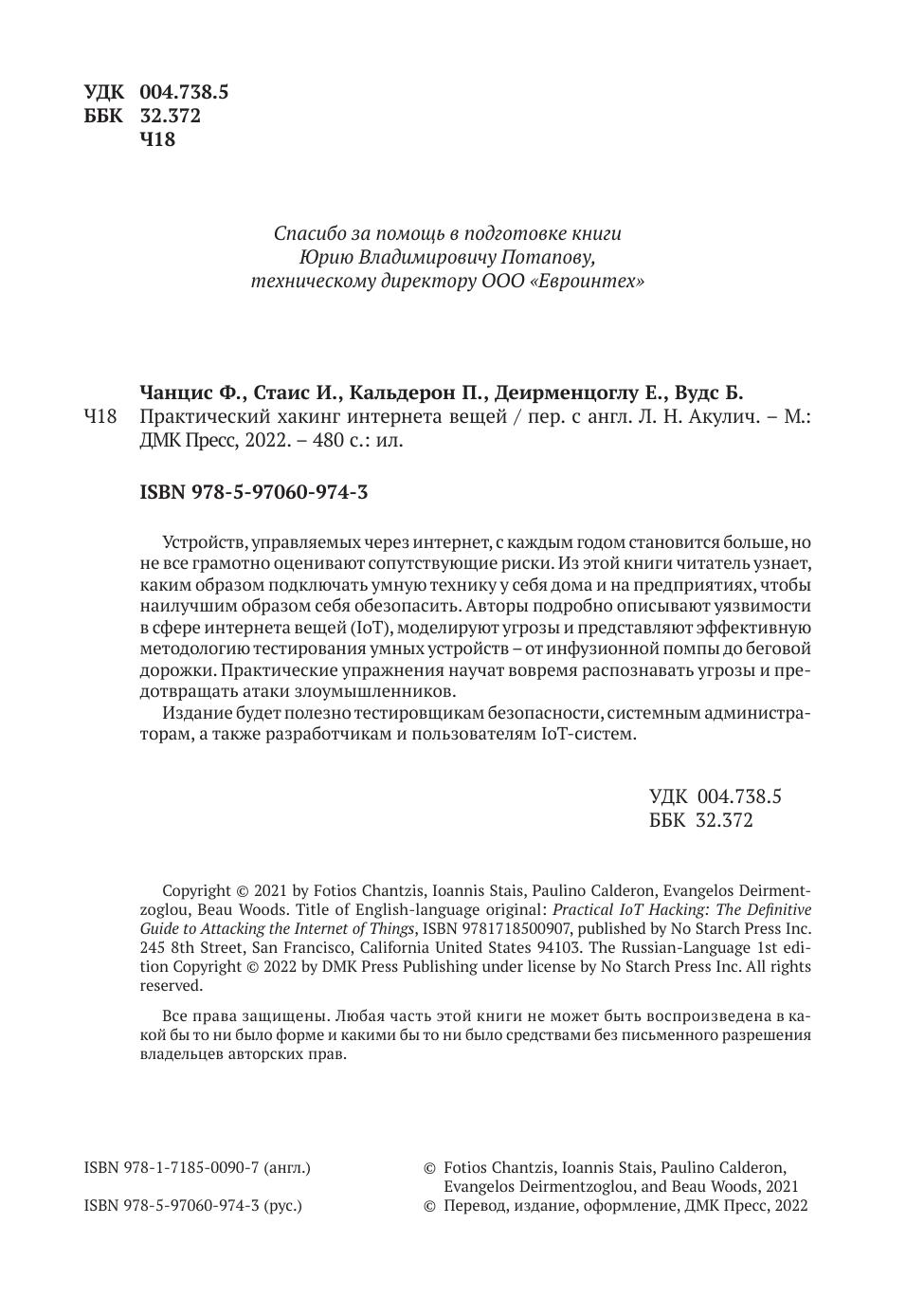 Из этой книги вы узнаете, как тестировать системы, устройства и протоколы интернета вещей (IoT) на безопасность и предотвращать атаки злоумышленников. Вы научитесь моделировать угрозы, испытаете на практике различные методы проверки безопасности, откроете для себя искусство пассив-ной разведки и оцените уровень защиты своей IoT-системы. Затем выполните переключение VLAN, взломаете аутентификацию MOTT, злоупотребите UPnP, разработаете отравитель mDNS и создадите атаки WS-Discovery. Инструменты и устройства, описываемые в книге, недороги и легкодоступны – потренируйтесь в их тестировании, выполняя описанные в книге упражнения.