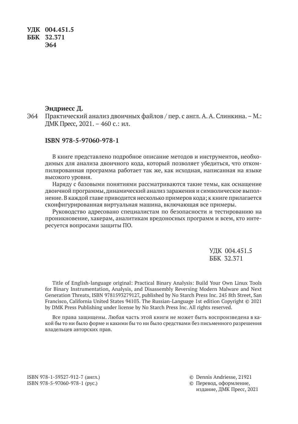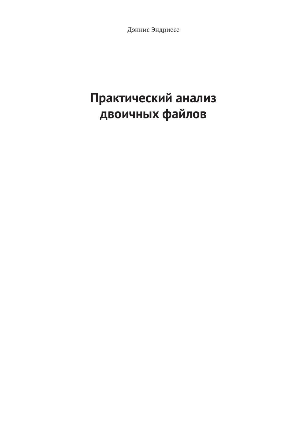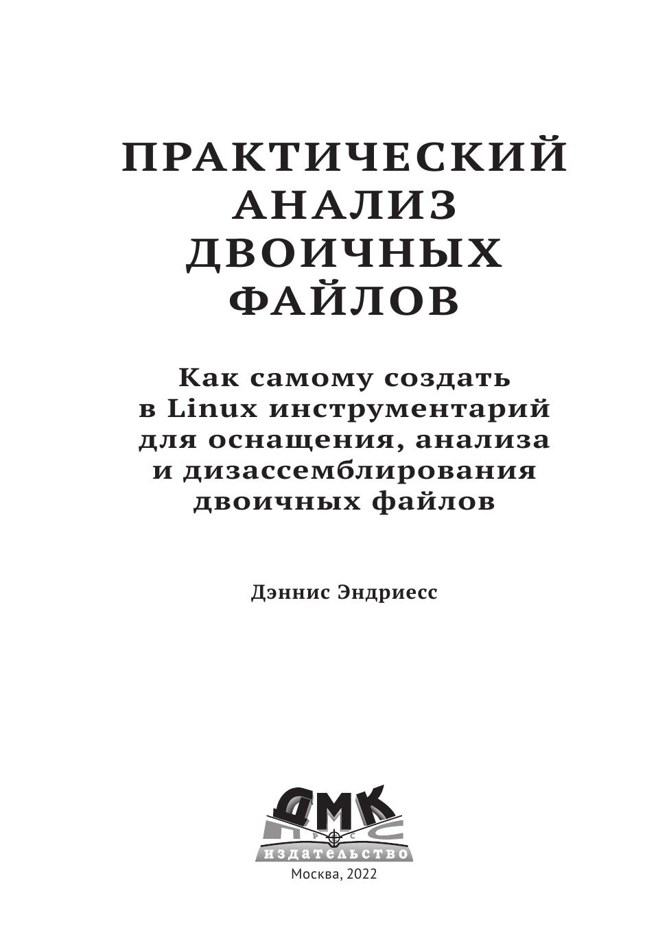 В книге рассматриваются вопросы двоичного анализа и оснащения двоичного кода. После знакомства с базовыми понятиями и форматами двоичных файлов вы приступите к их анализу, применяя для этой цели набор средств GNU/Linux binutils, дизассемблирование и внедрение кода. Затем вы реализуете инструменты профилирования с применением Pin, создадите инструменты динамического анализа заражения с помощью libdft и т. д.